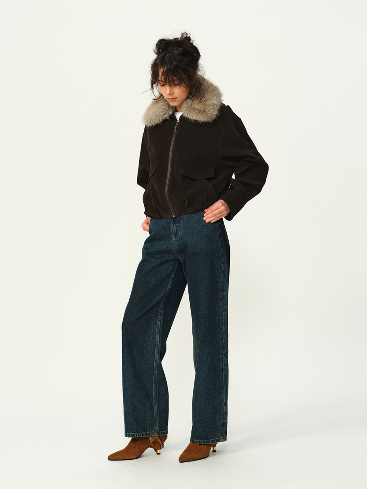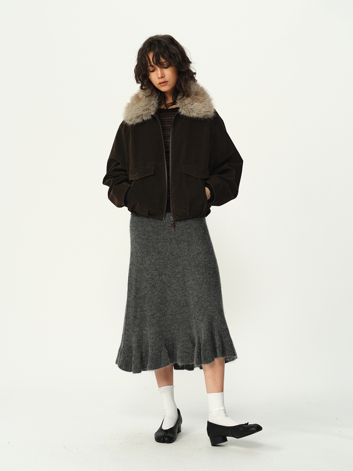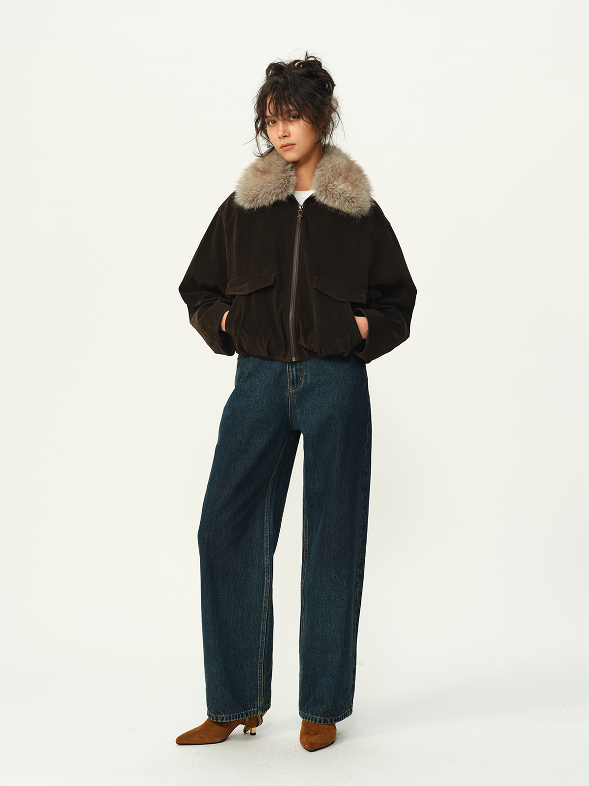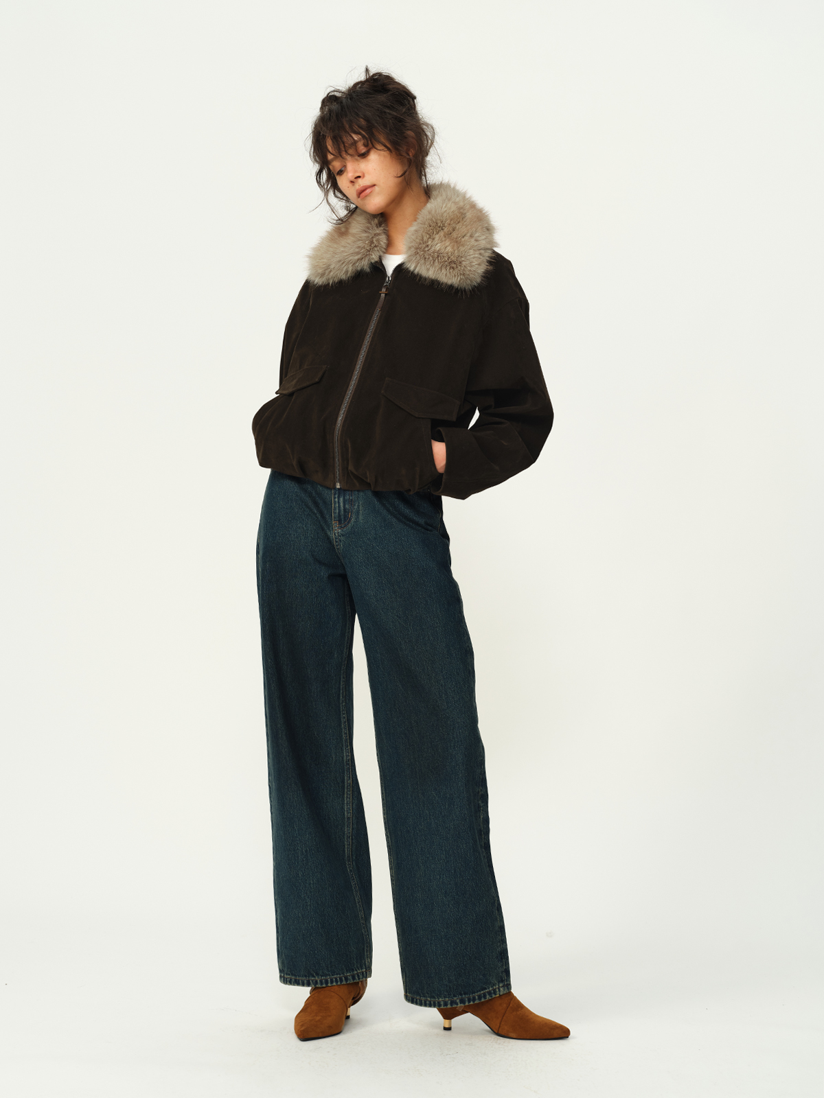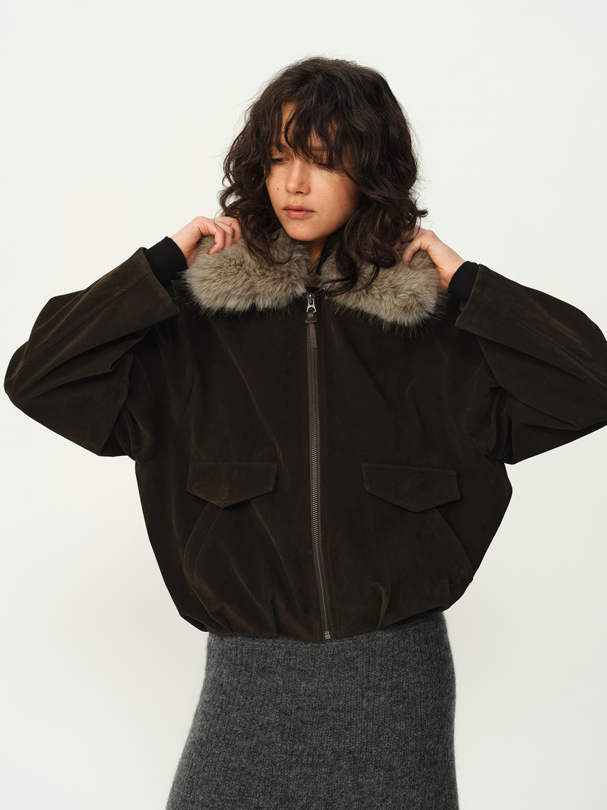 Evistub girls/E-5QWT1236/复古深棕麂皮可拆卸毛领花苞夹克外套