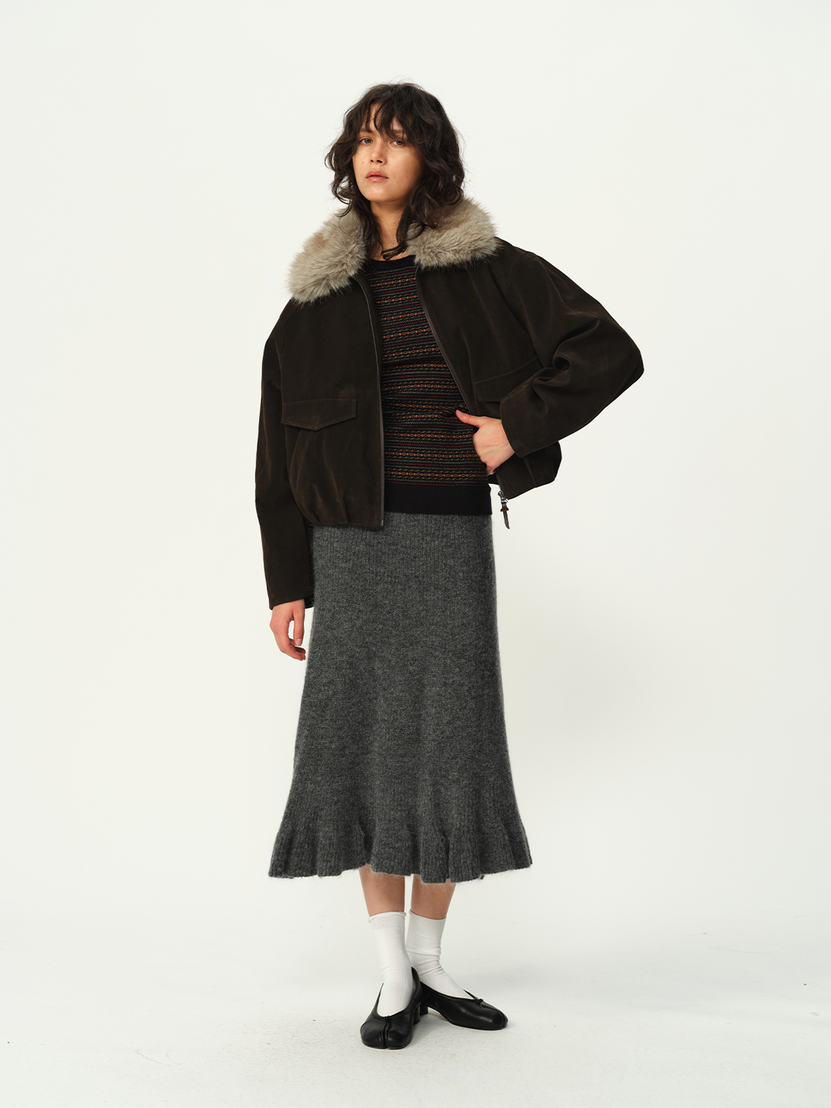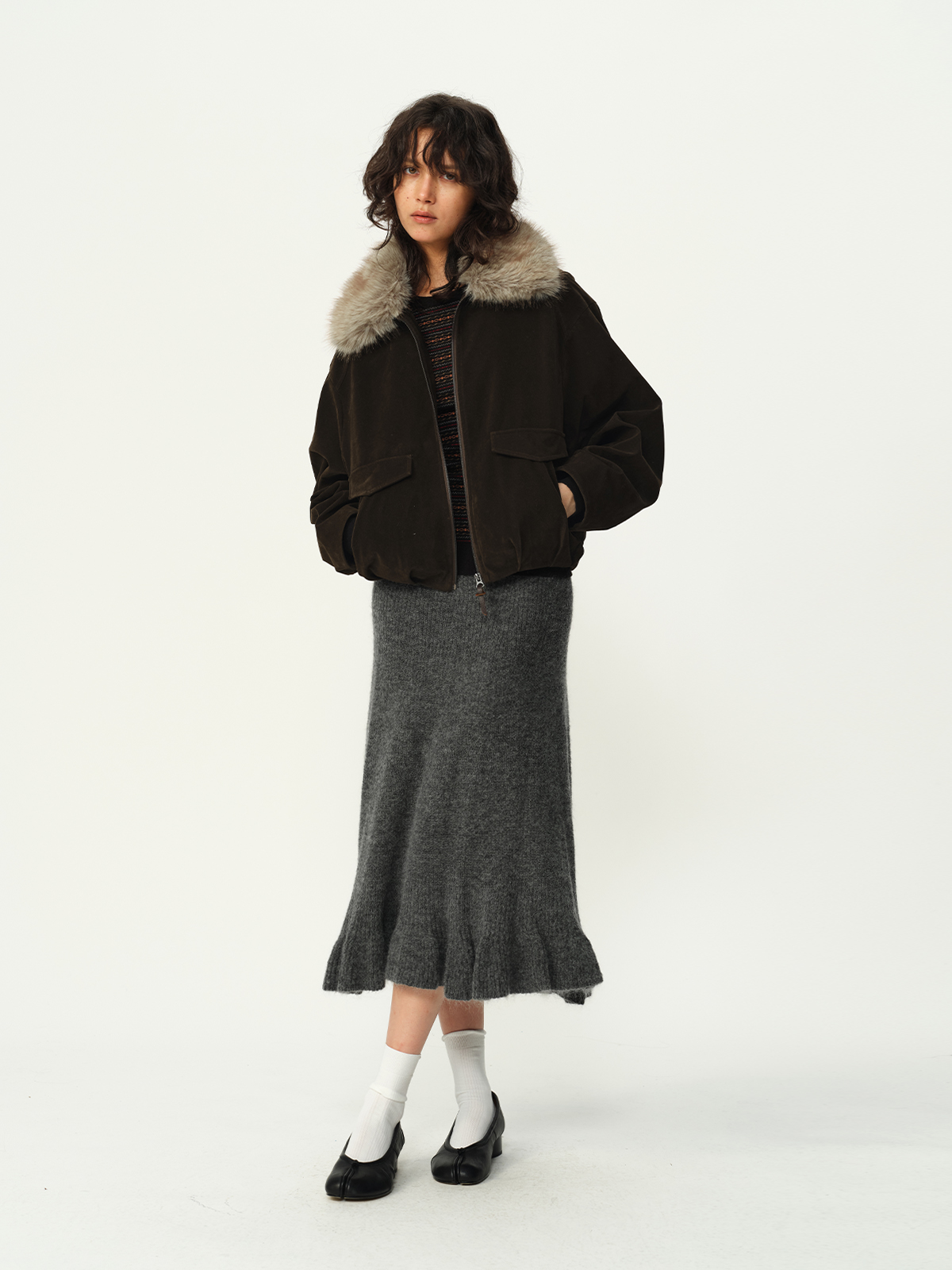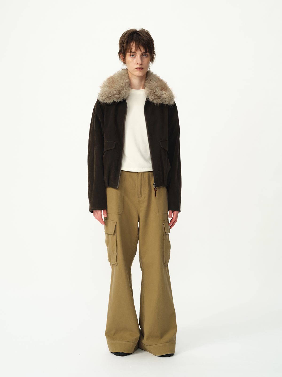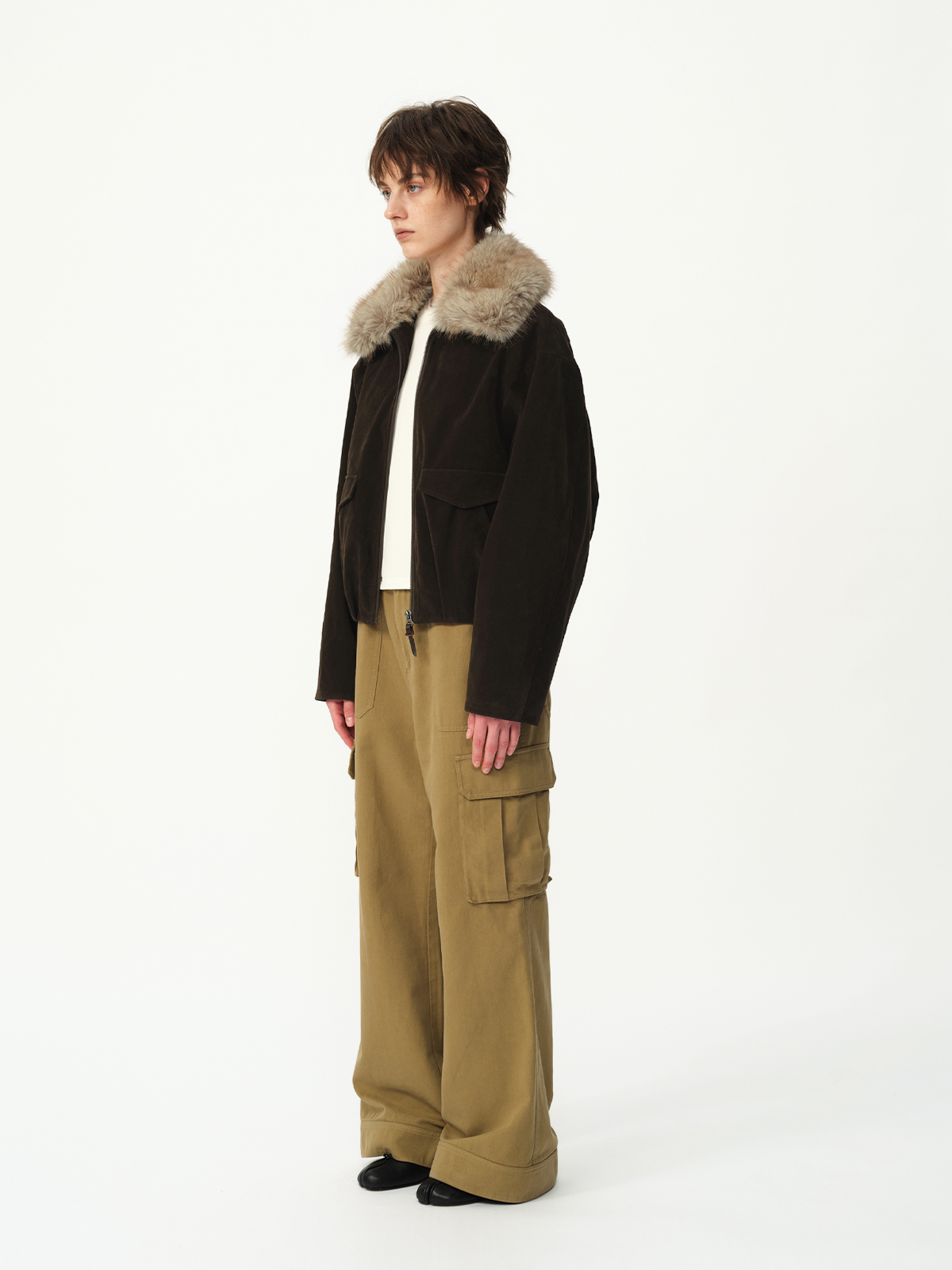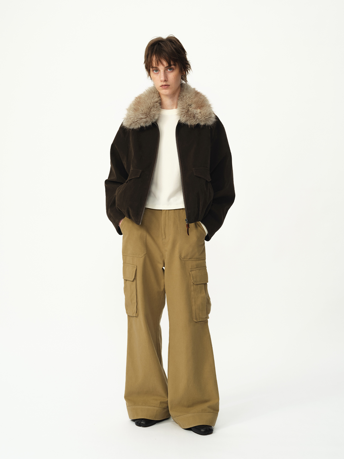 Evistub girls/E-5QWT1236/复古深棕麂皮可拆卸毛领花苞夹克外套