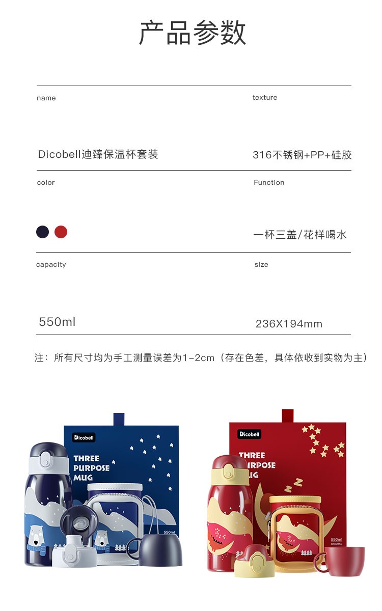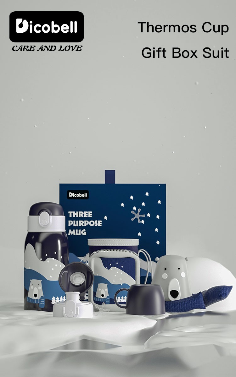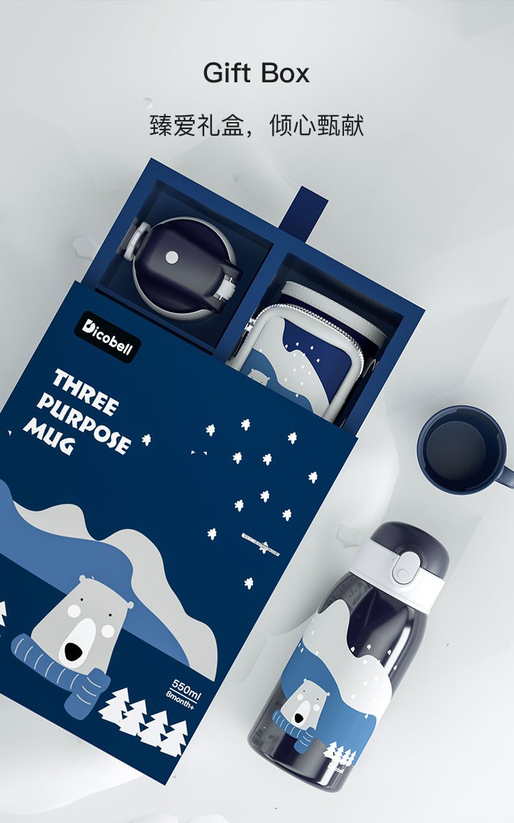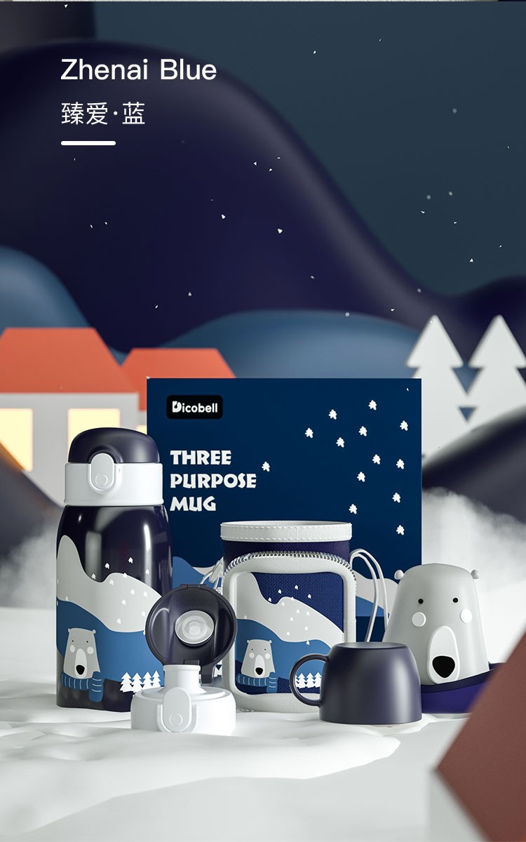 迪可贝儿(Dicobell)大容量儿童保温杯便携男幼儿园可爱带吸管水杯女 550ML迪臻保温杯套装臻爱蓝(一杯三盖 316不锈钢)