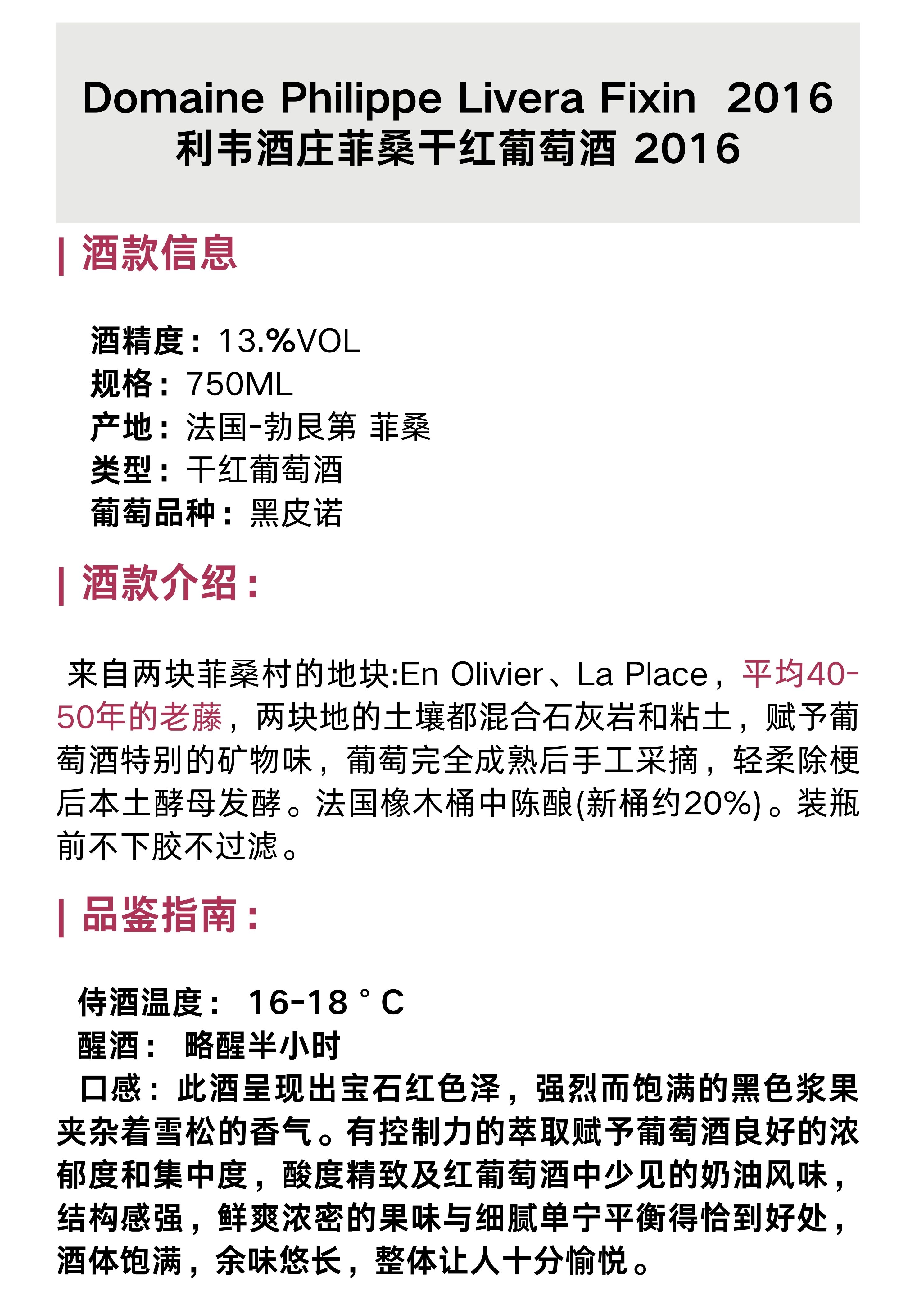 利韦酒庄菲桑干红葡萄酒 Domaine Philippe Livera Fixin