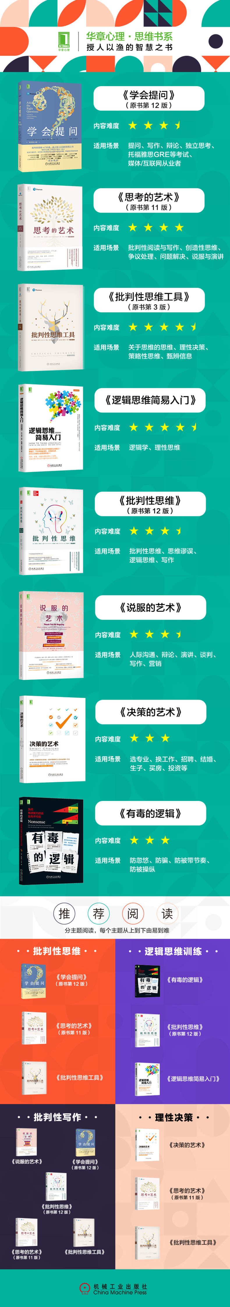 如果你所在城市的地铁因为安全因素升级了安检程序,你会积极配合还是消极抵触?如果你喜欢的一位明星或KOL热情地向你推荐一款产品,你会立即下单还是深思熟虑?如果你的老板要求和鼓励你“996”甚至“007”,你会配合还是拒绝?......我们生活在嘈杂、喧嚣和不确定的世界里,每时每刻都被泛滥的信息所包围,大到世界经济发展的趋势,小到个人生活的决策,面对别人和媒体兜售的观点,如果你缺乏独立思考和判断,就只能全盘接受——他们热衷于让你相信这是“事实”,但所说的话往往真假参半。你明明觉得有什么不对劲,可一时又很难找到突破口反驳。即使专家说得再动听,也不一定靠谱,我们有必要依靠自己的大脑,不草率、不盲从,不为感性和无事实根据的传闻所左右,《学会提问》帮助我们有意识地学习和运用批判性思维,提出批判性问题,对问题深思熟虑,尽力理解那些价值观和我们背道而驰的人的分析推理方式,克服偏见对判断的影响,这样才有可能......