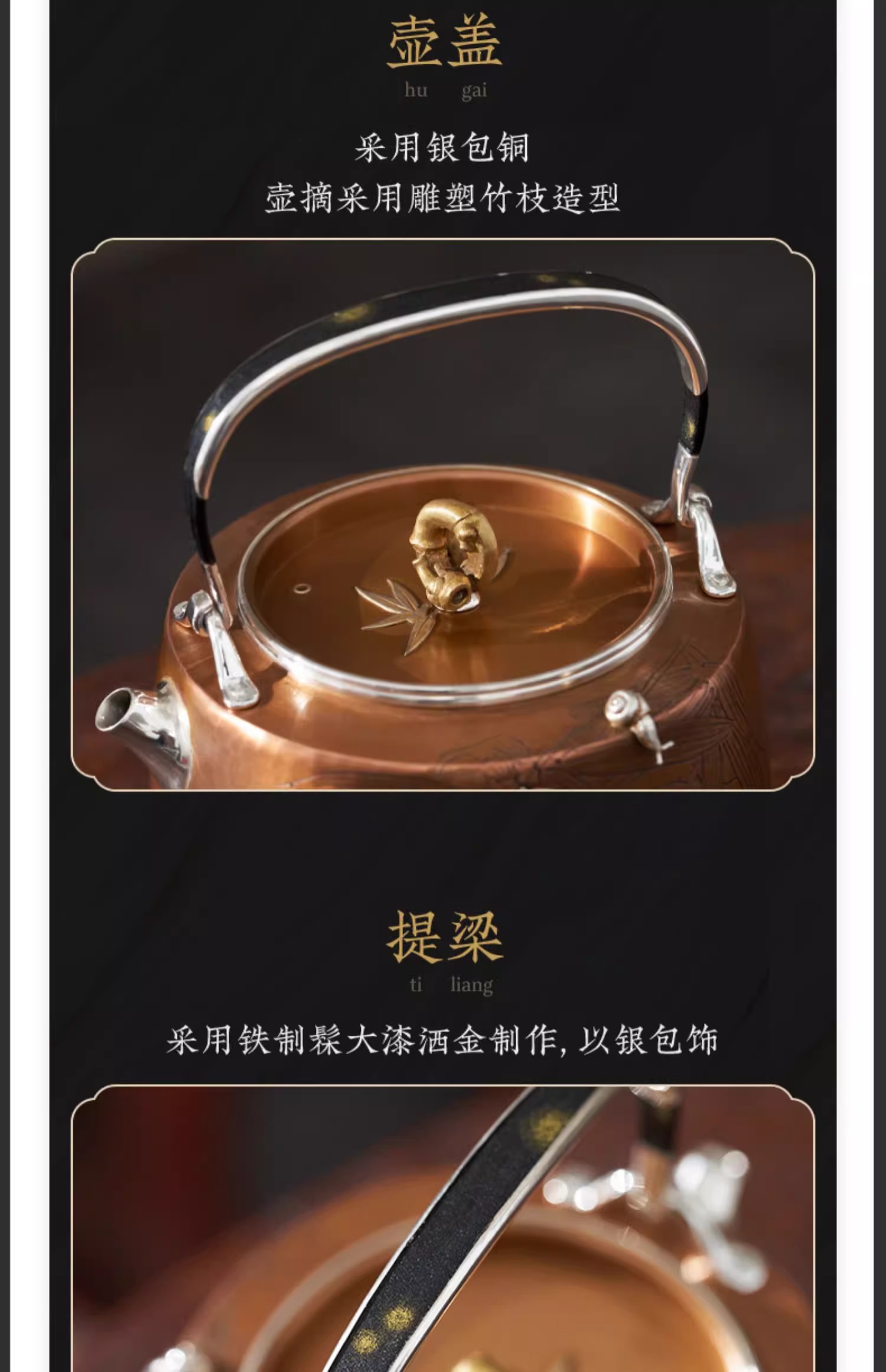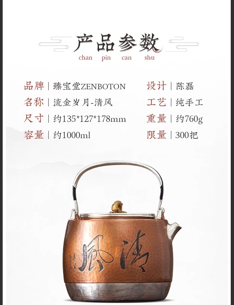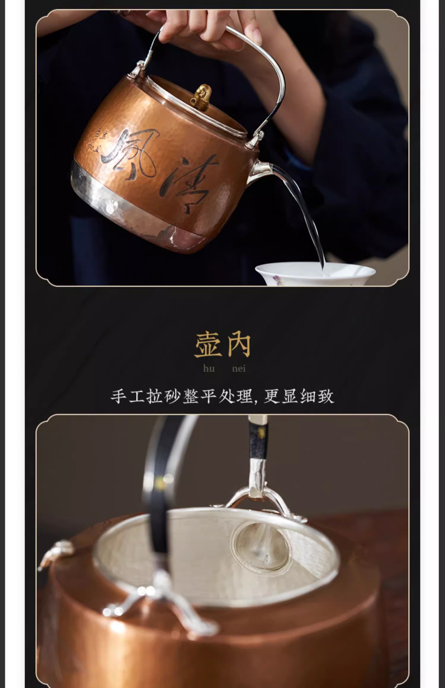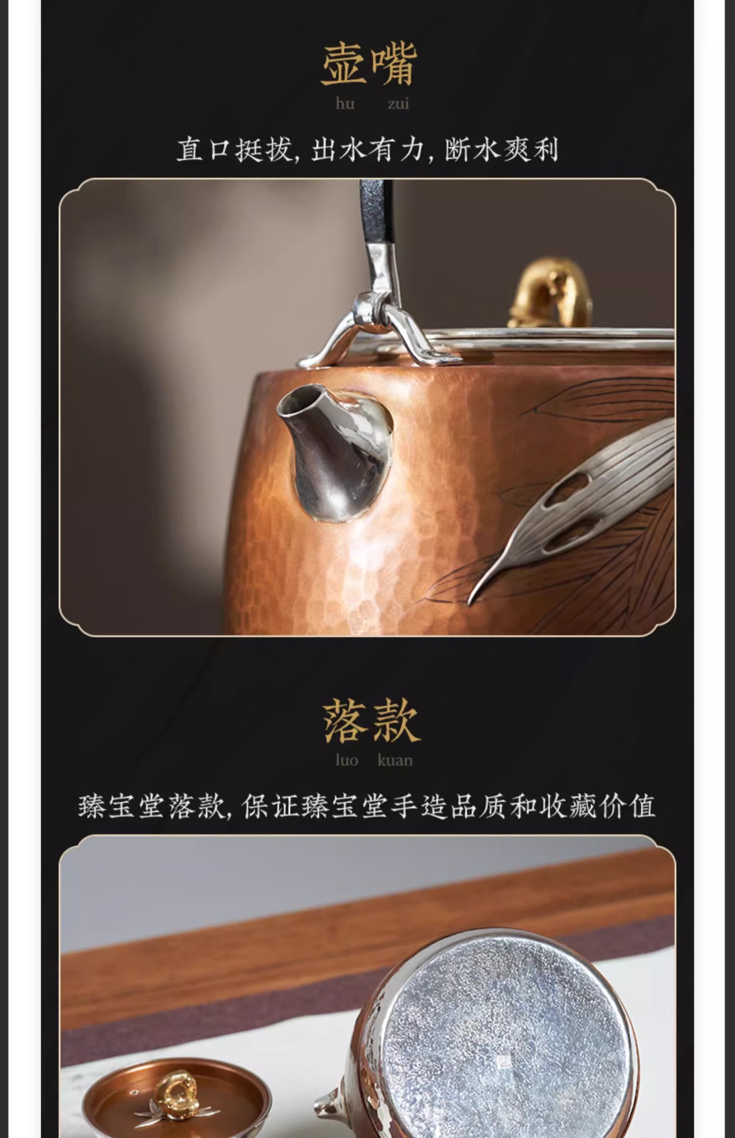 臻宝堂银壶999纯银烧水壶纯手工雕刻煮水壶足银家用茶具铜包银壶流金岁月清风壶1000ml