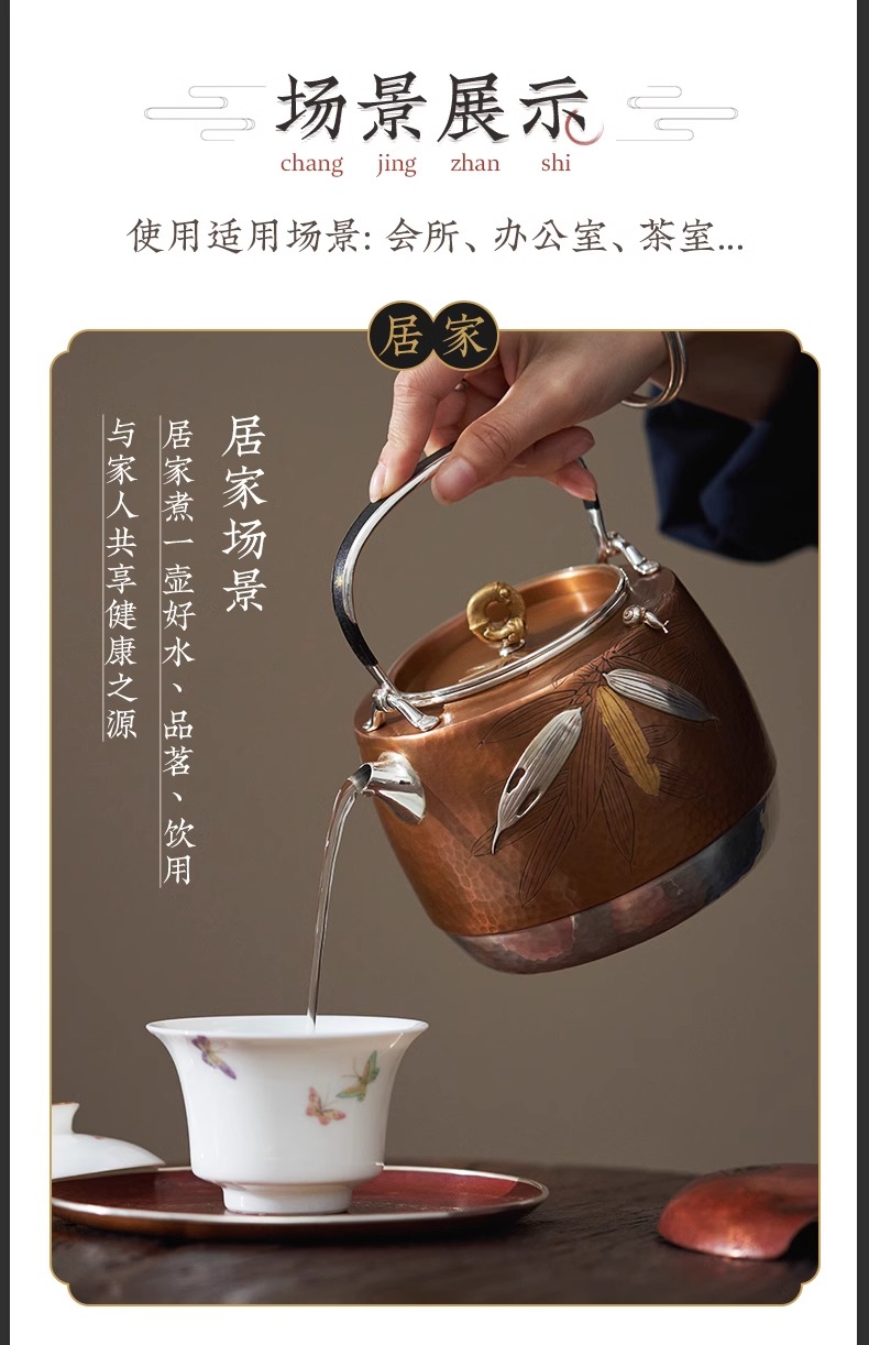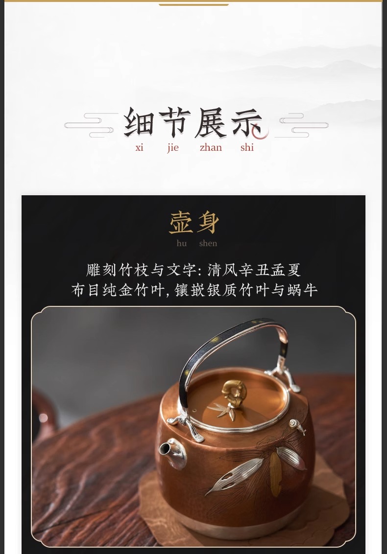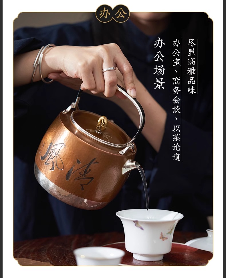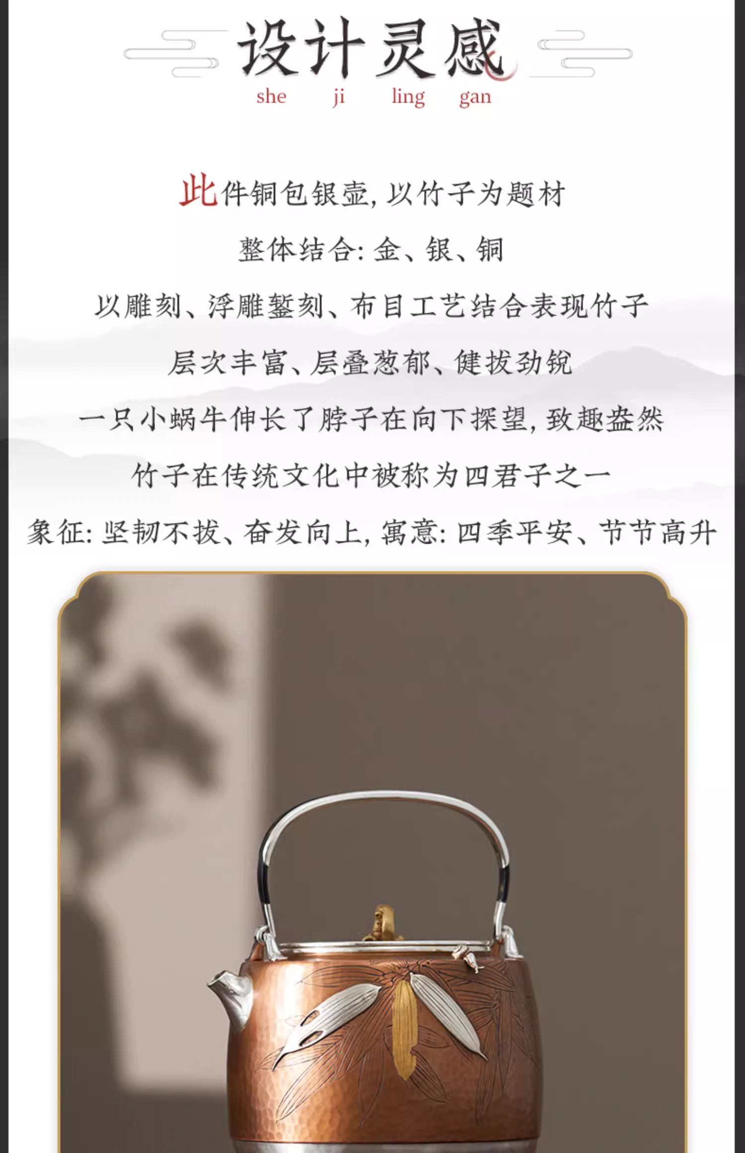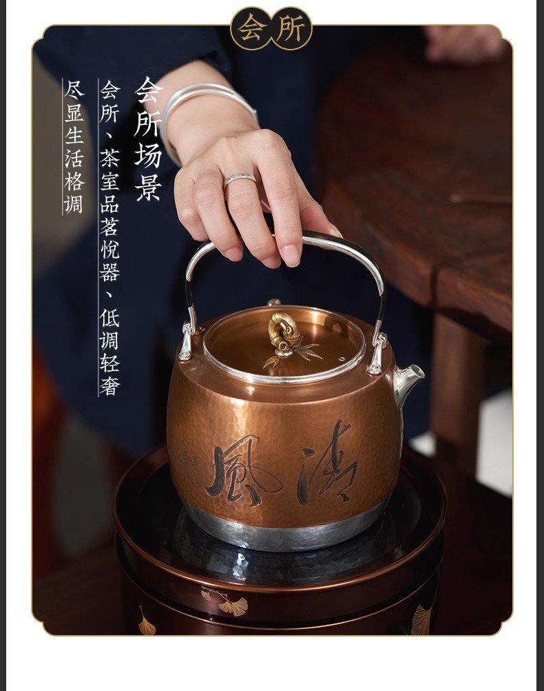 臻宝堂银壶999纯银烧水壶纯手工雕刻煮水壶足银家用茶具铜包银壶流金岁月清风壶1000ml