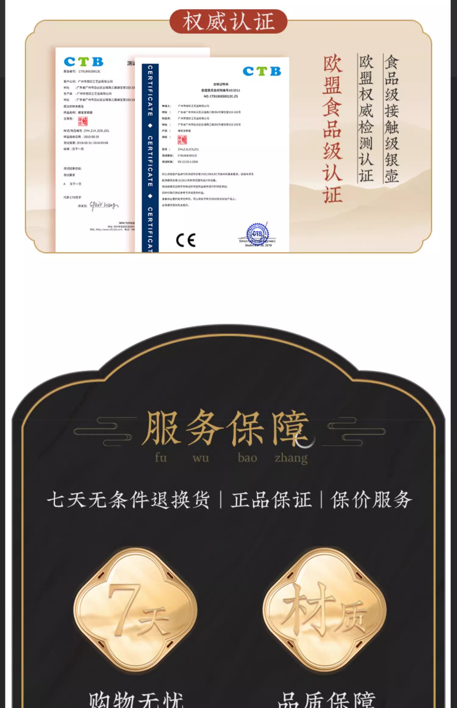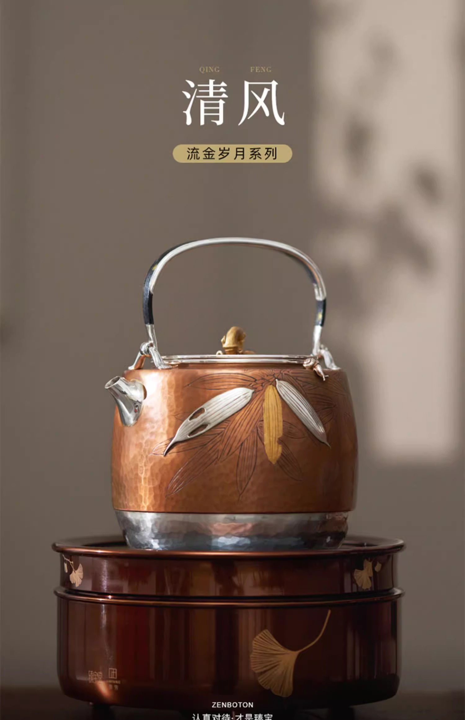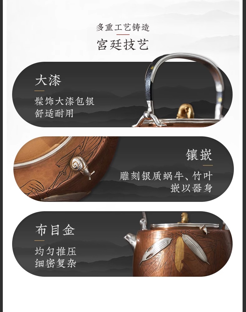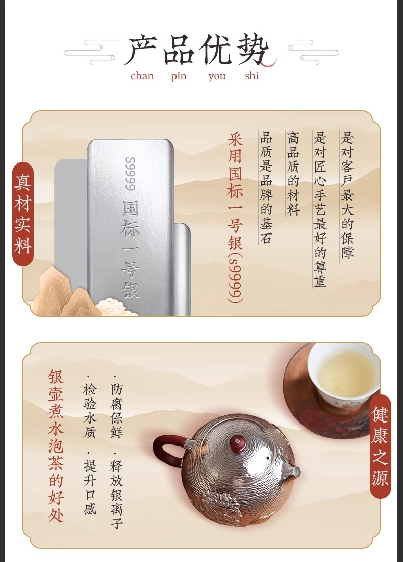 臻宝堂银壶999纯银烧水壶纯手工雕刻煮水壶足银家用茶具铜包银壶流金岁月清风壶1000ml