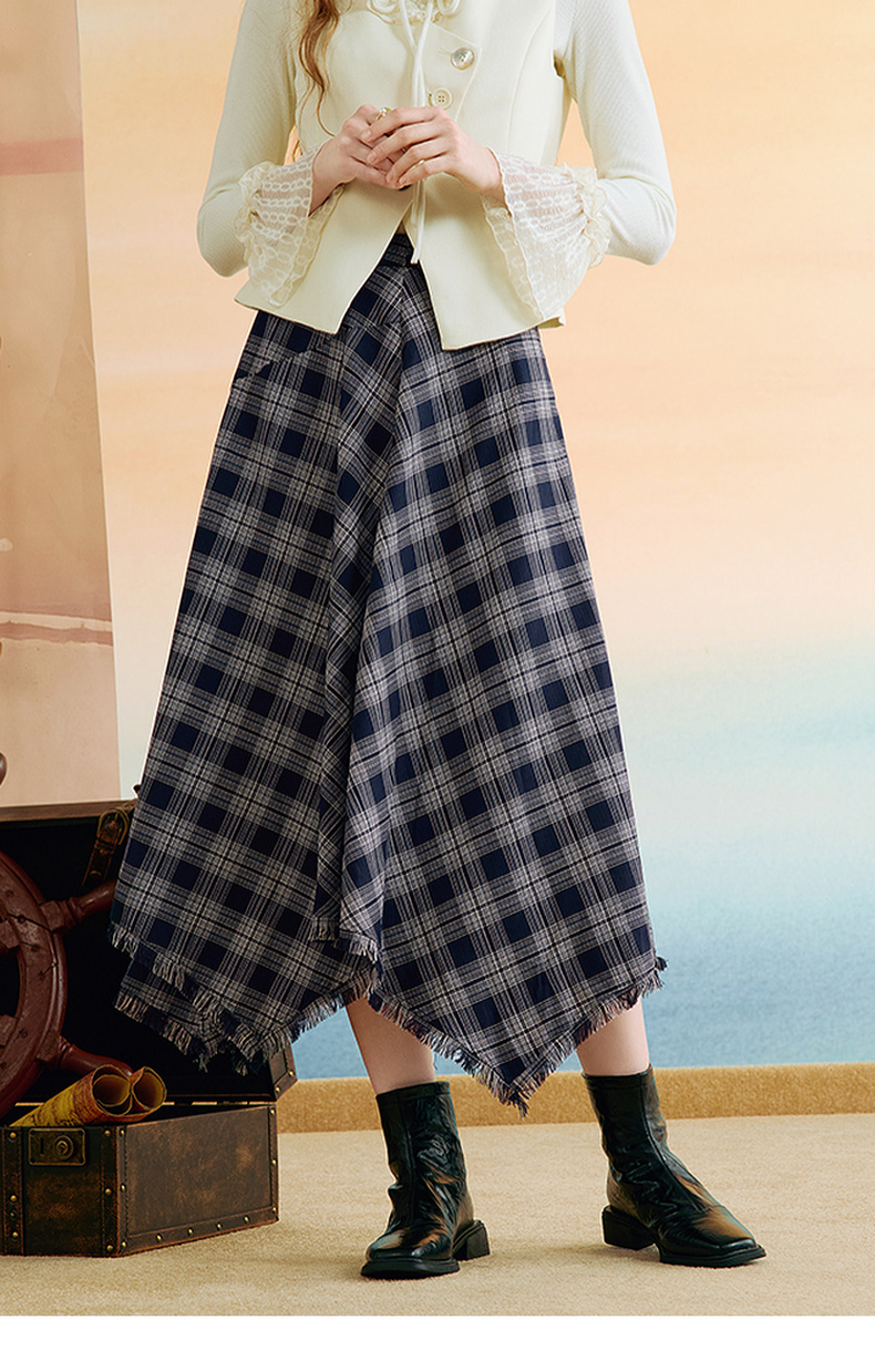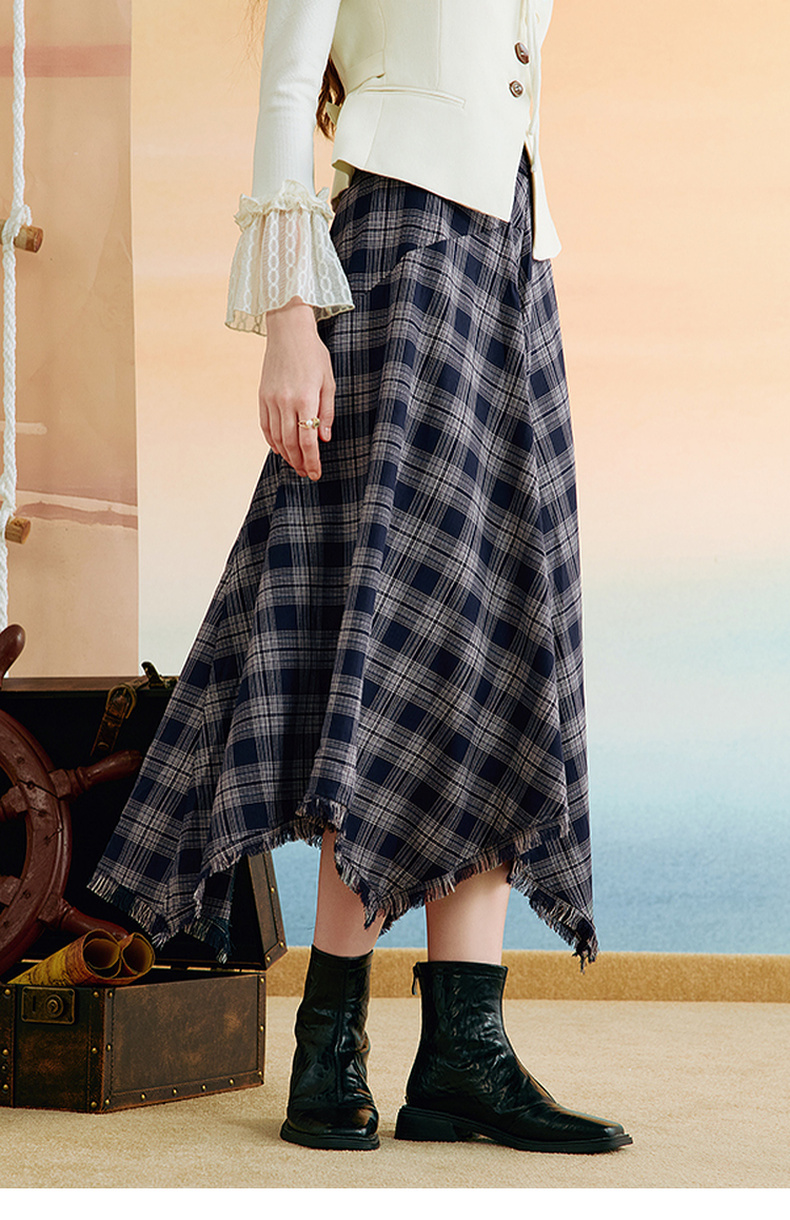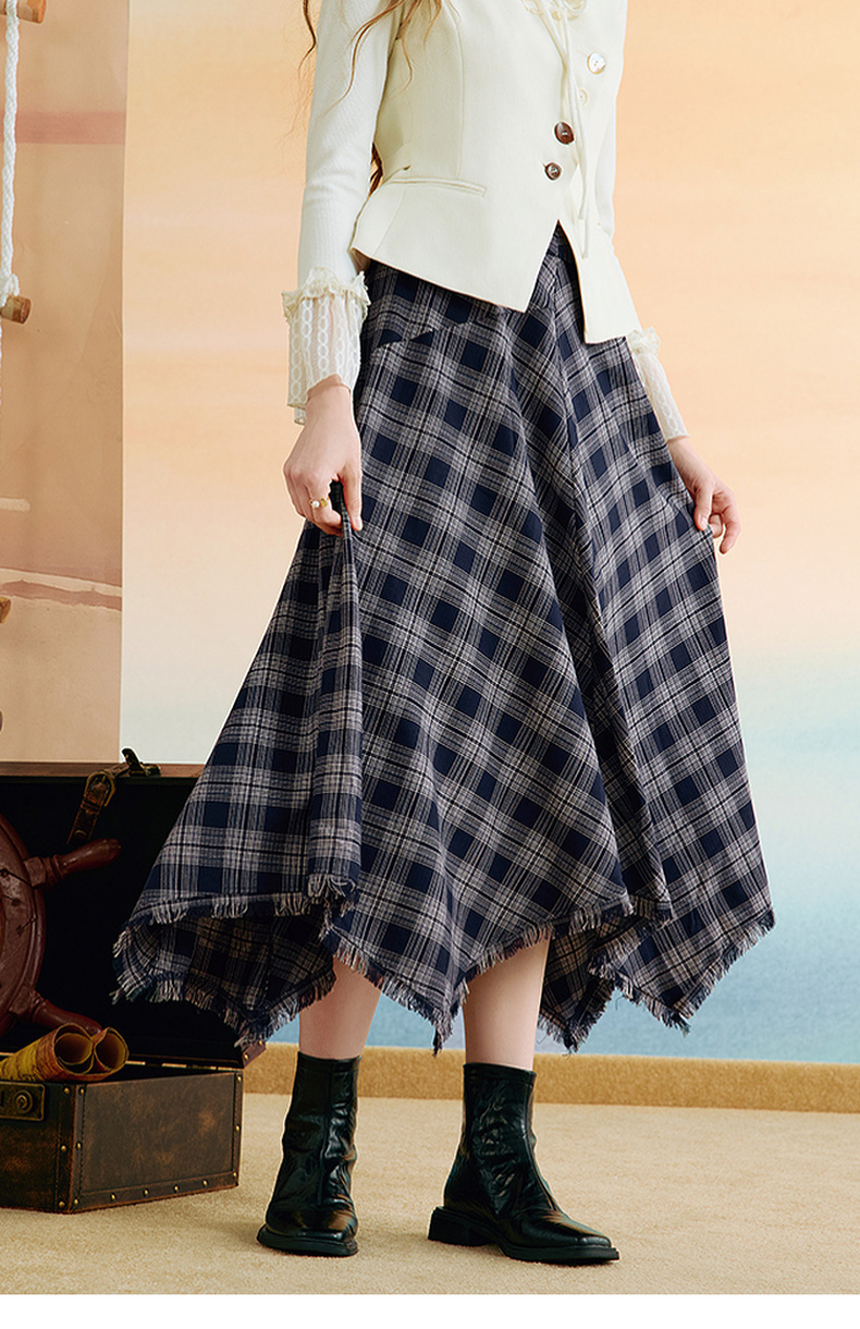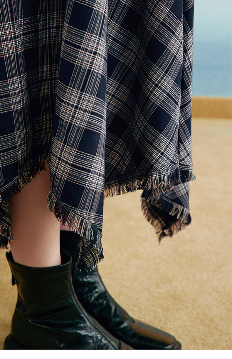 两三事 窗棱旧絮 2025秋季新款复古流苏不规则下摆格子半身裙长裙
