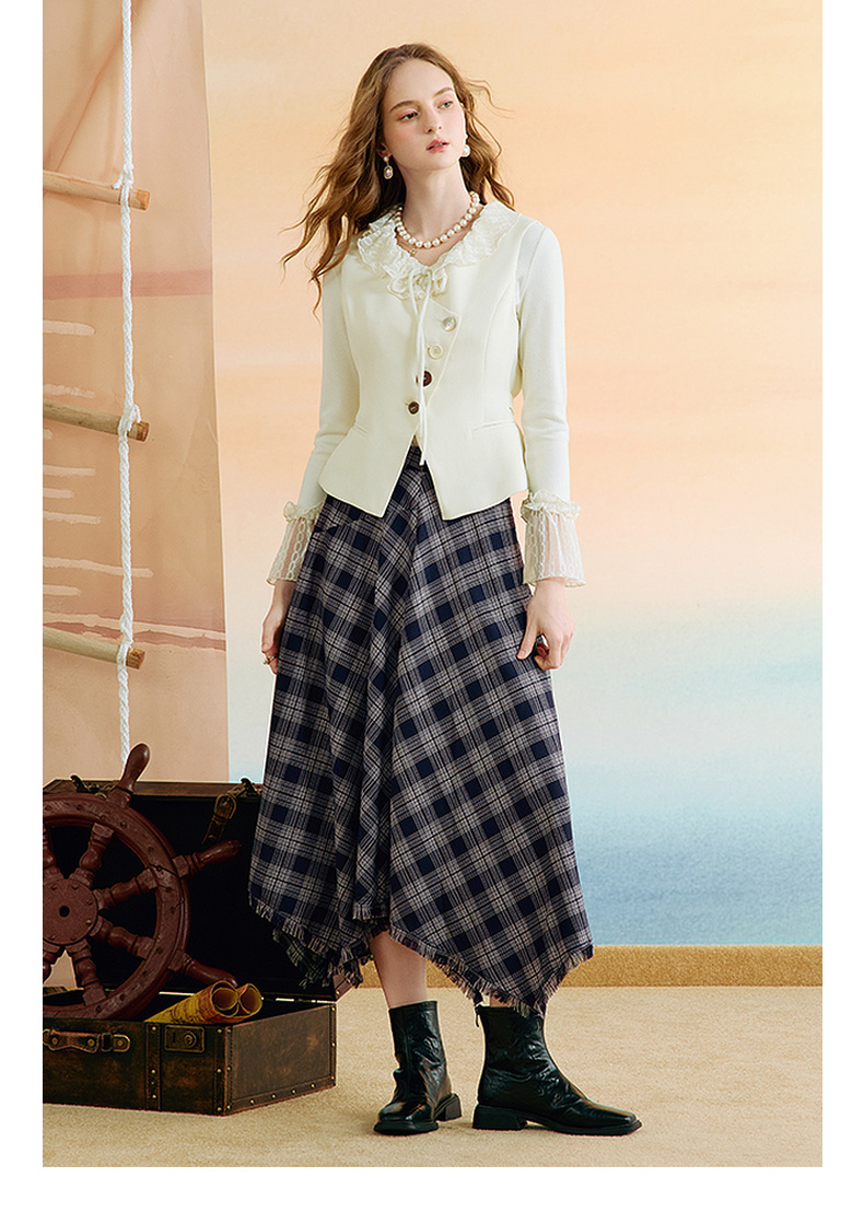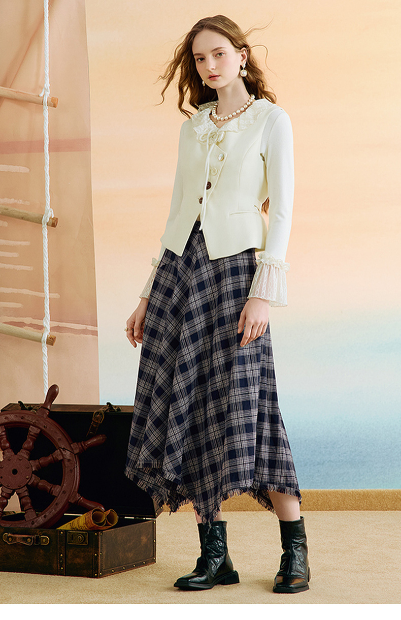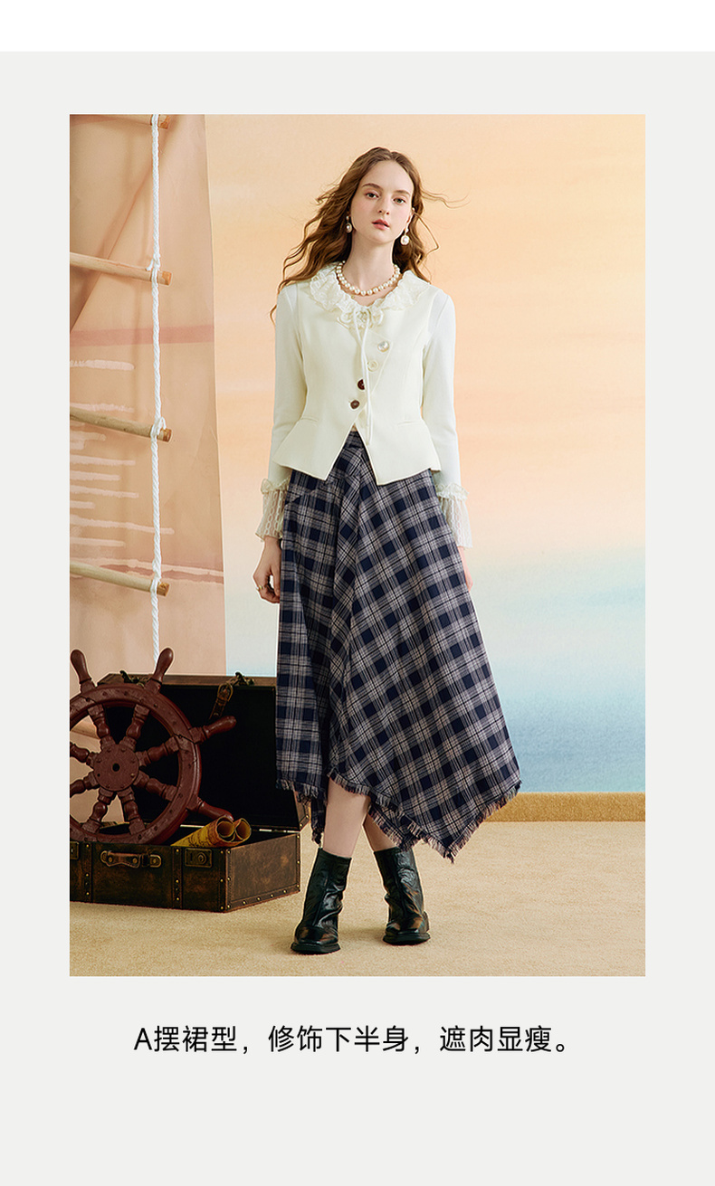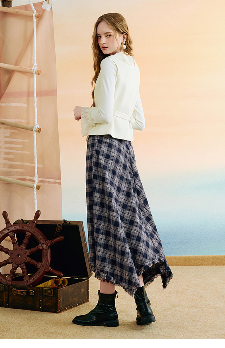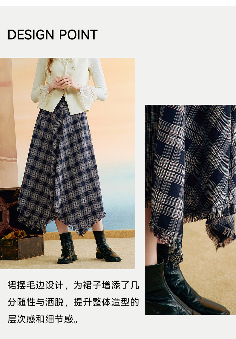 两三事 窗棱旧絮 2025秋季新款复古流苏不规则下摆格子半身裙长裙