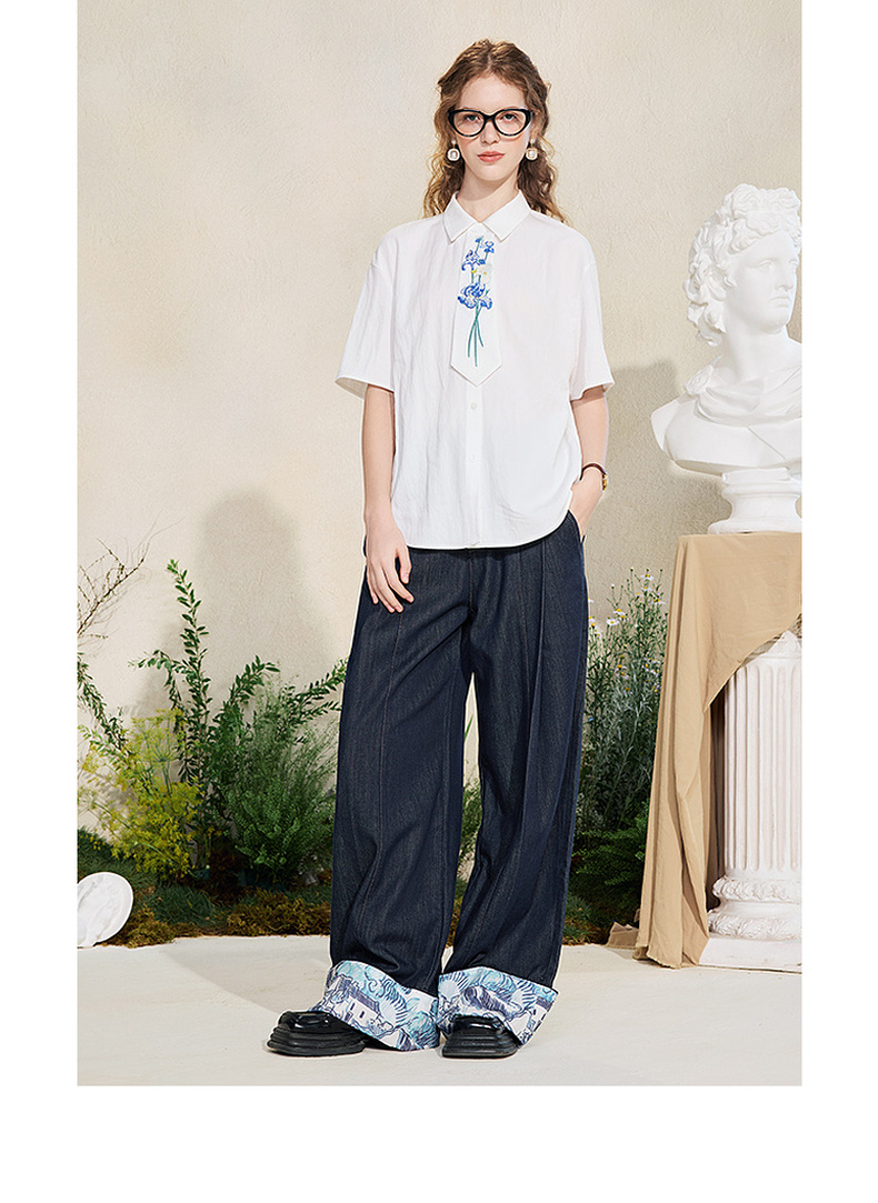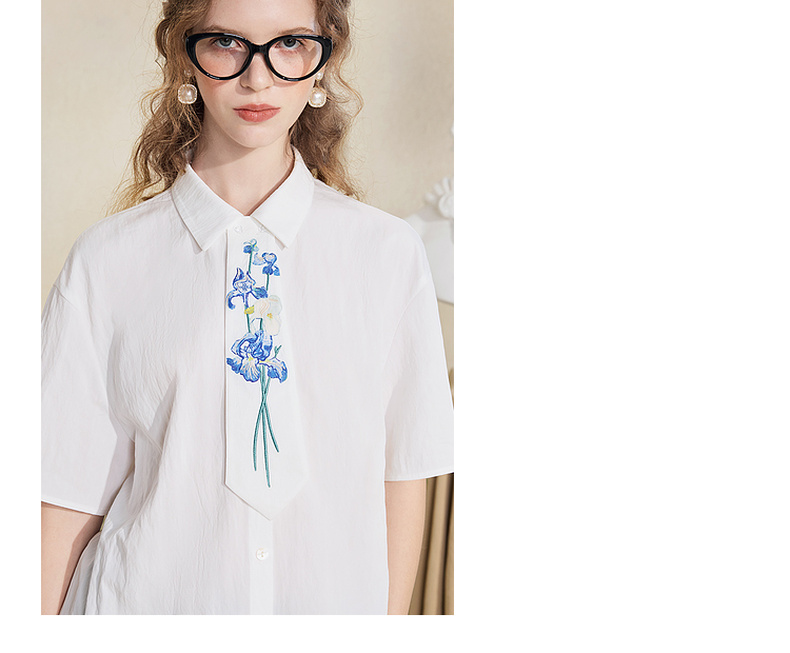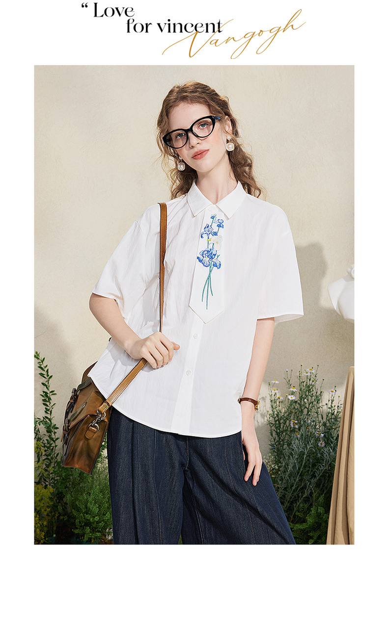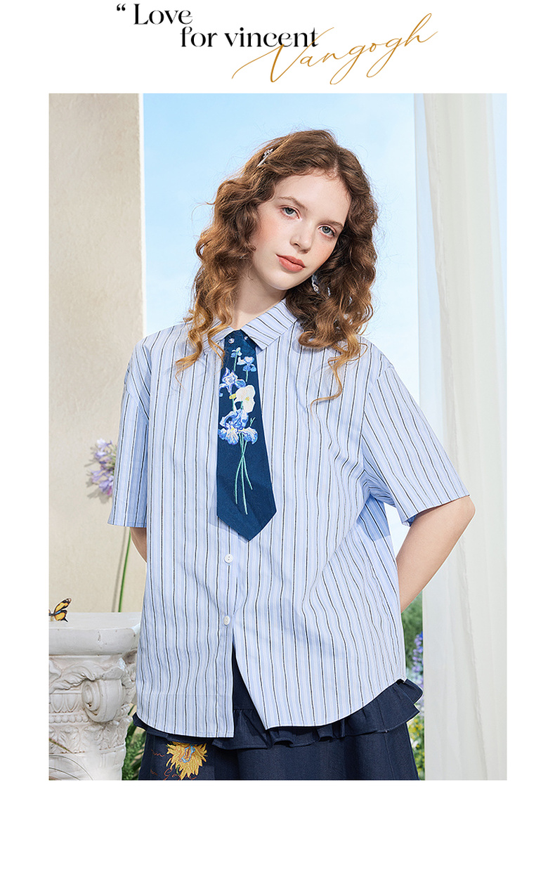两三事梵高文艺流鸢恋语2025夏季新款休闲可拆绣花领带衬衫女宽松