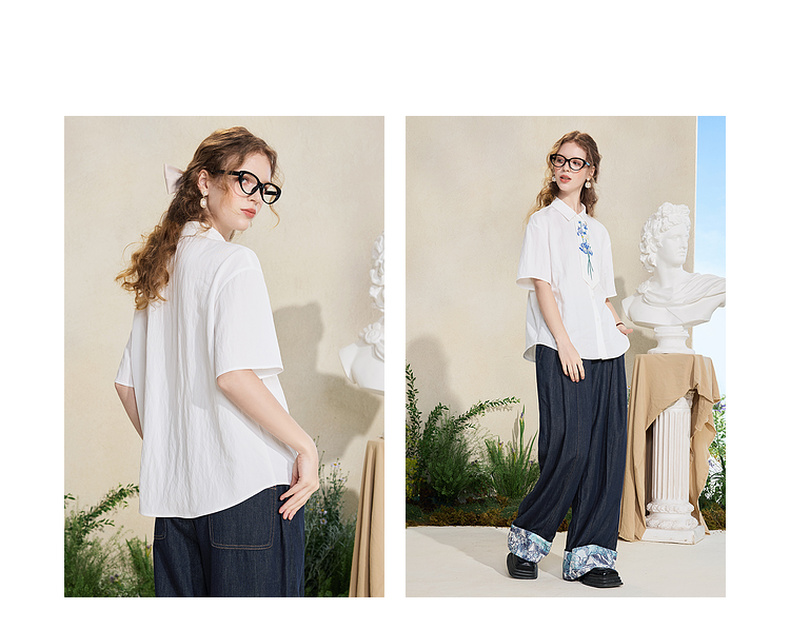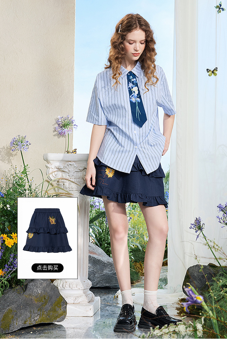 两三事 月缎流萤 2025夏季新款淑女风印花荷叶边刺绣翻领衬衫女