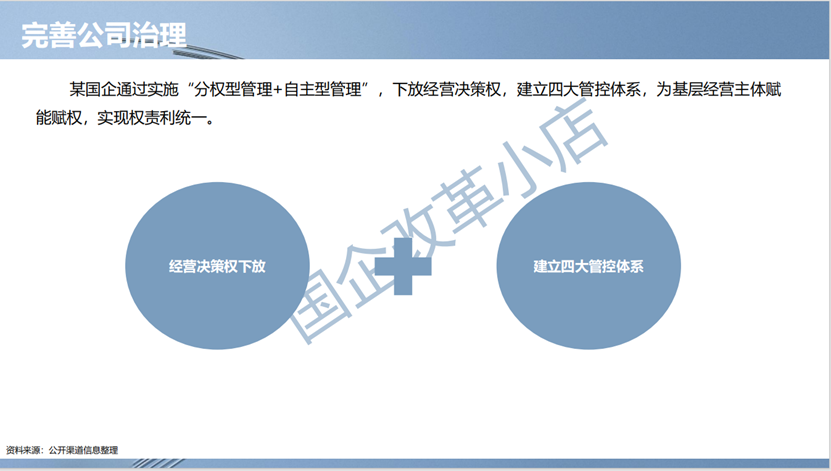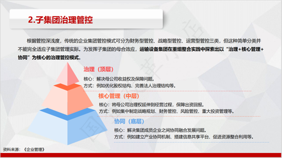 子企业治理管控:为发挥子集团的母合效应,该企业在整合重组实践中探索出以“治理+核心管理+协同”为核心的治理管控模式。