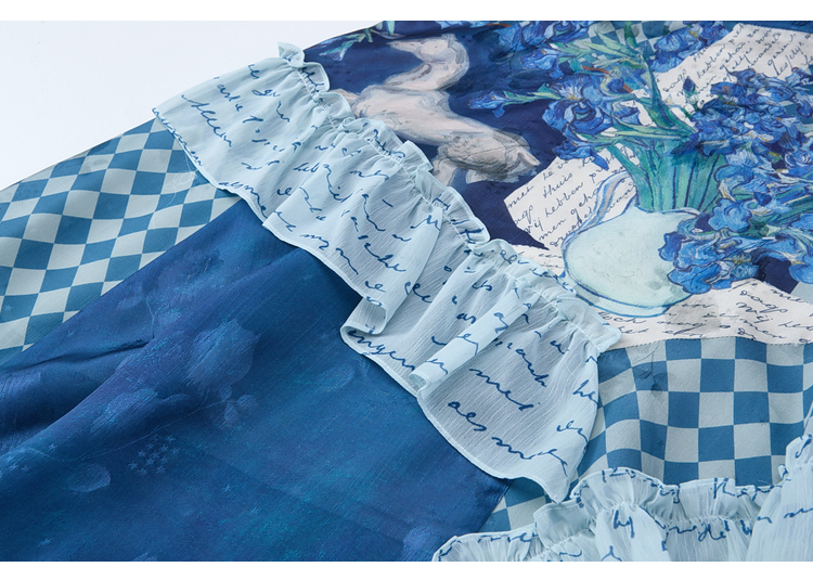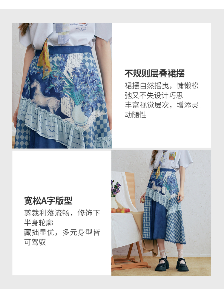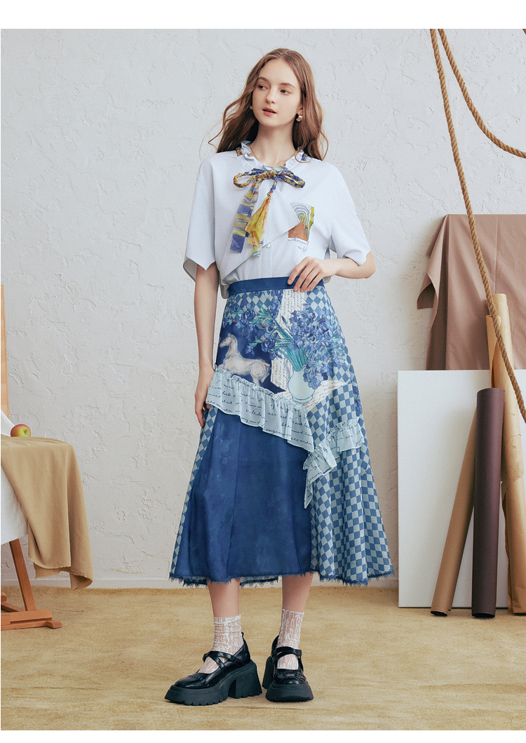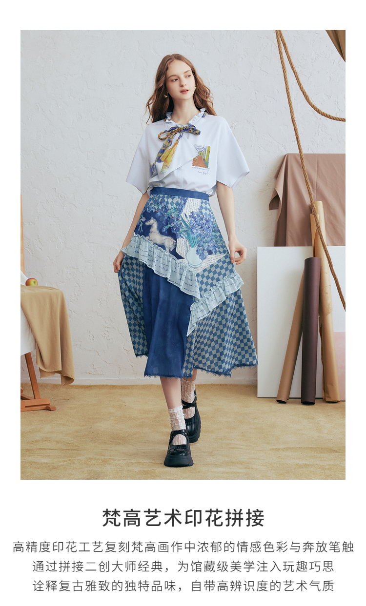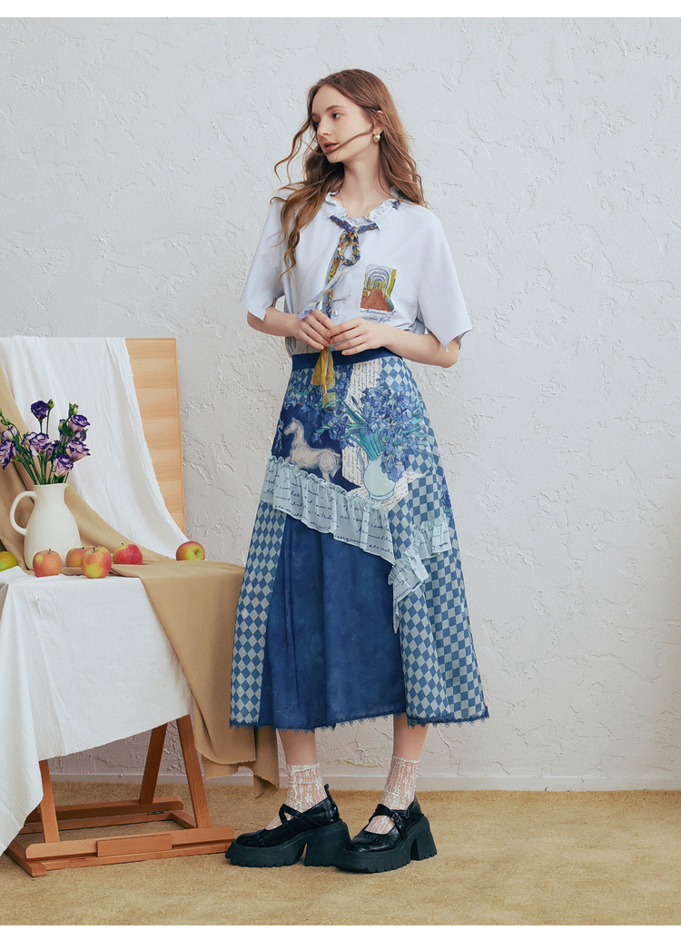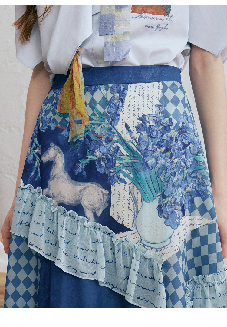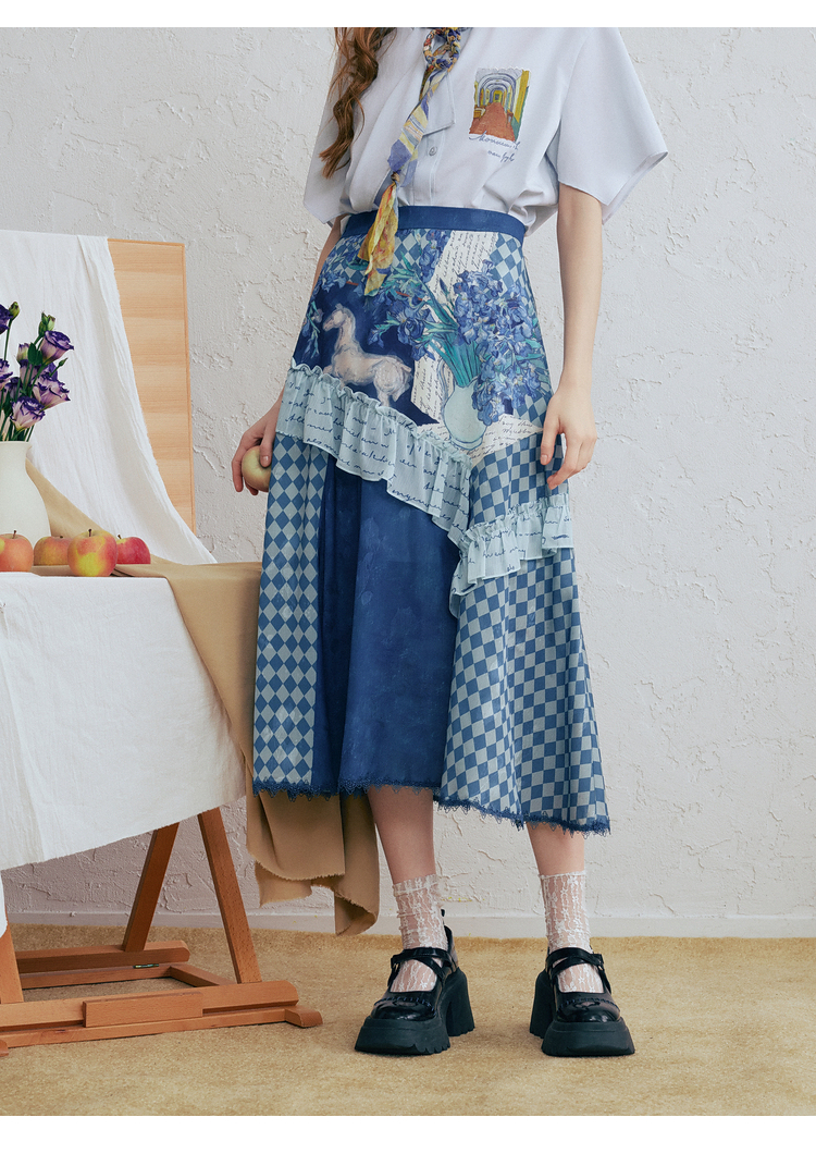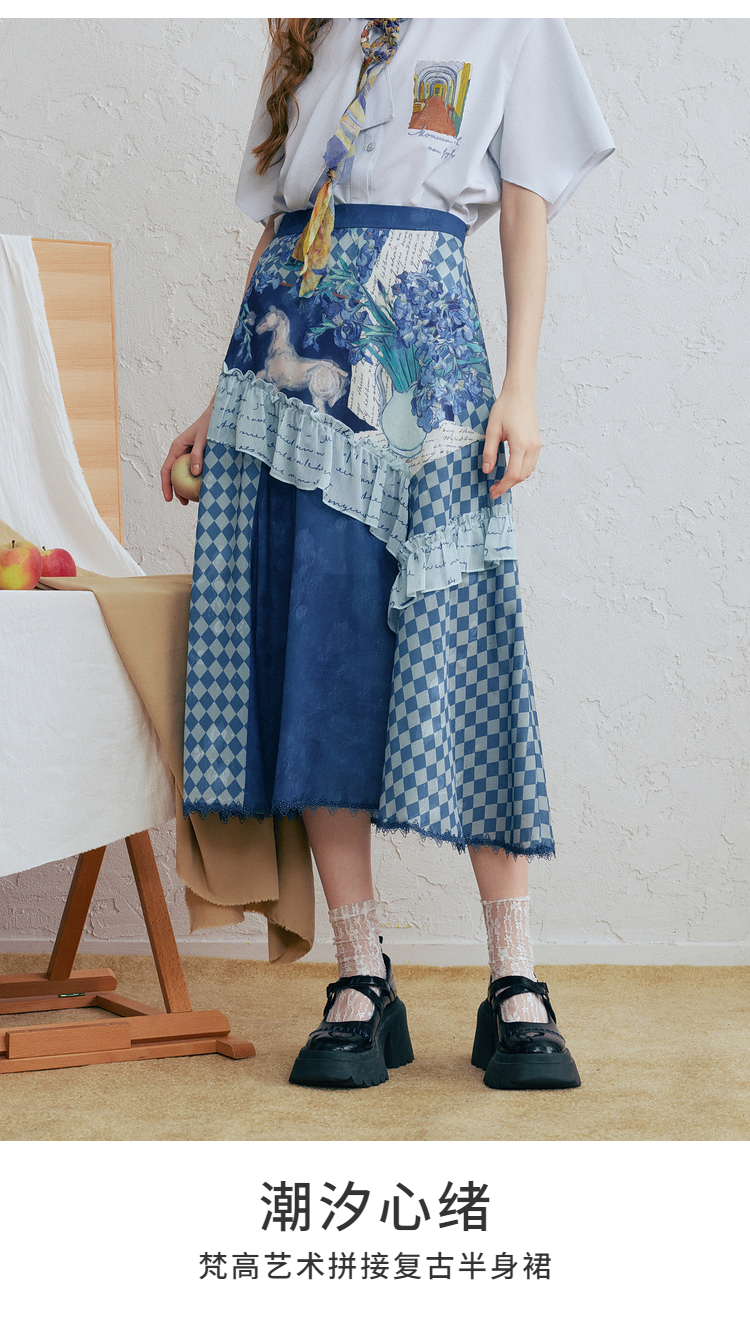 两三事梵高文艺 潮汐心绪 2025春季新款荷叶边拼接印花格子半身裙
