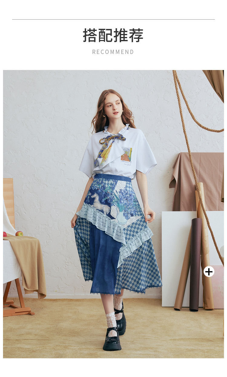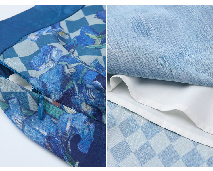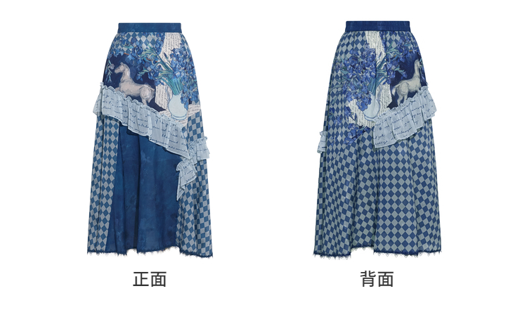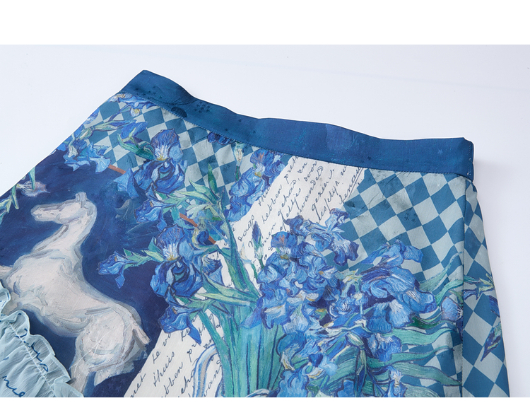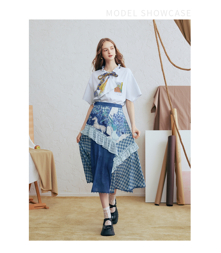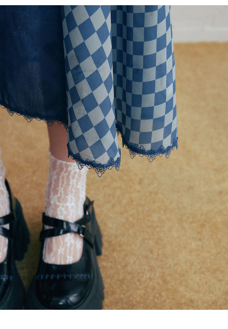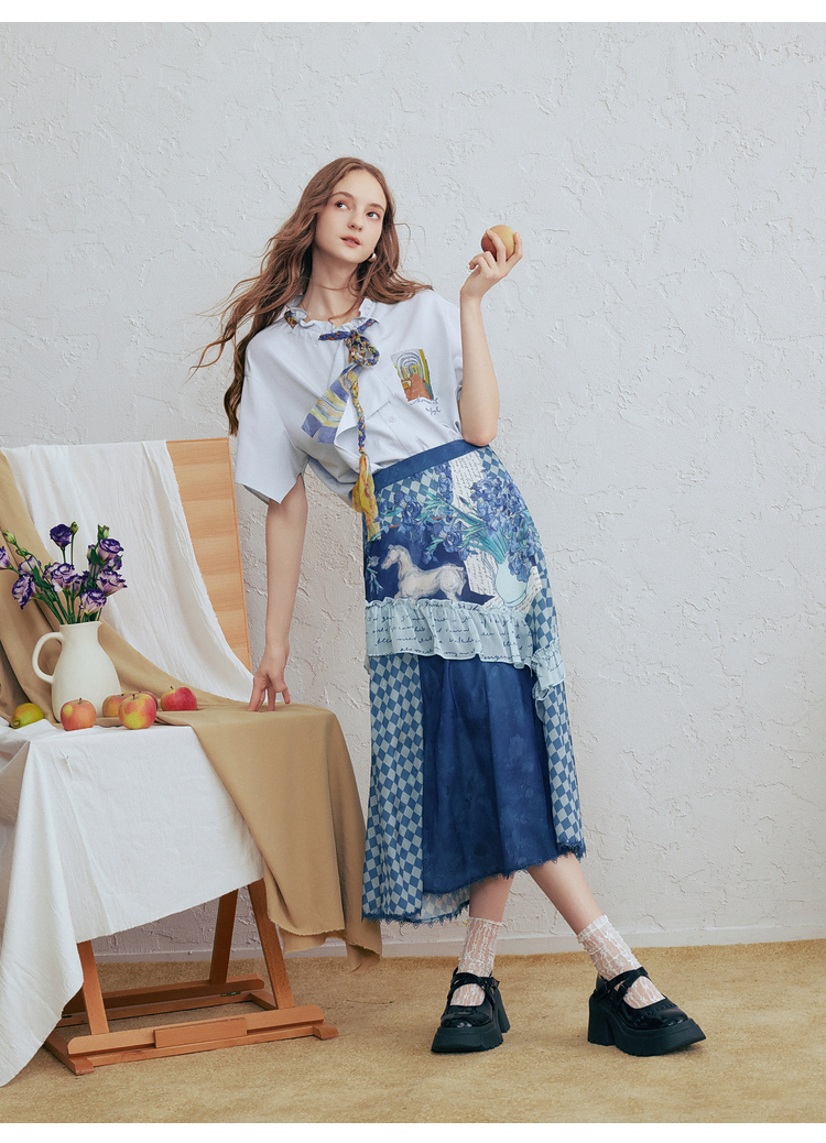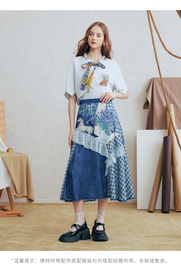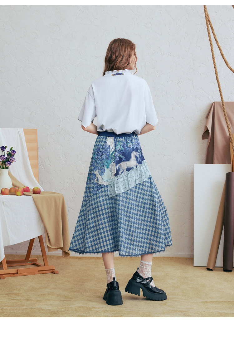 两三事梵高文艺 潮汐心绪 2025春季新款荷叶边拼接印花格子半身裙