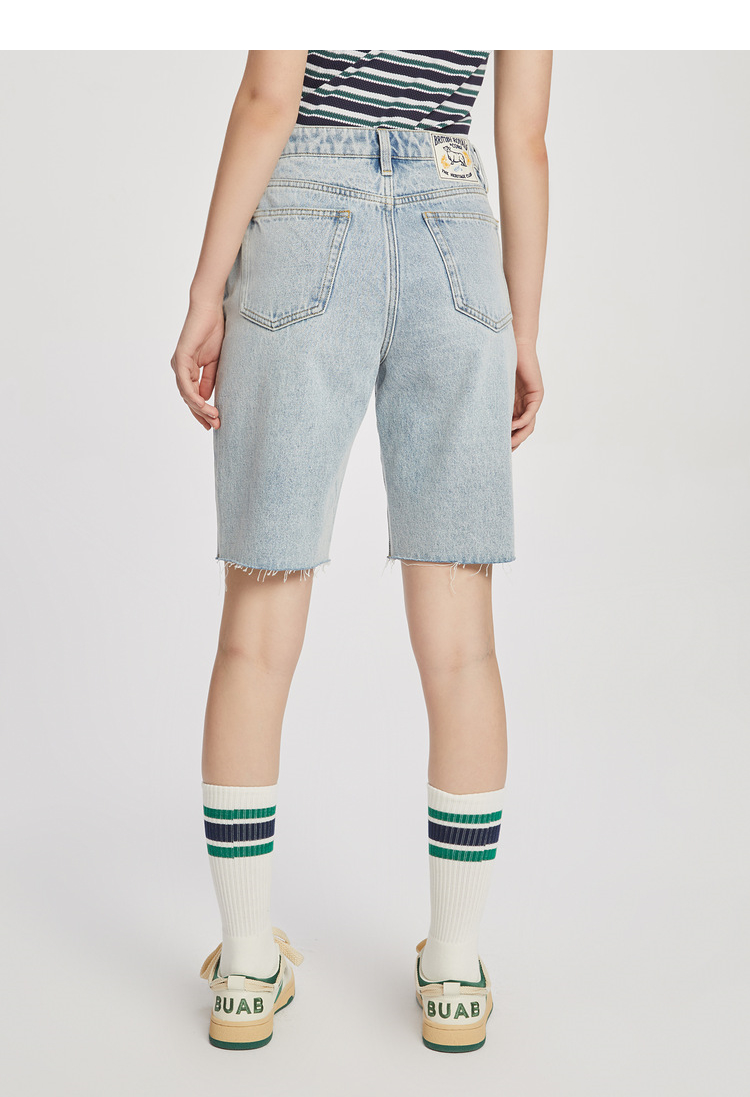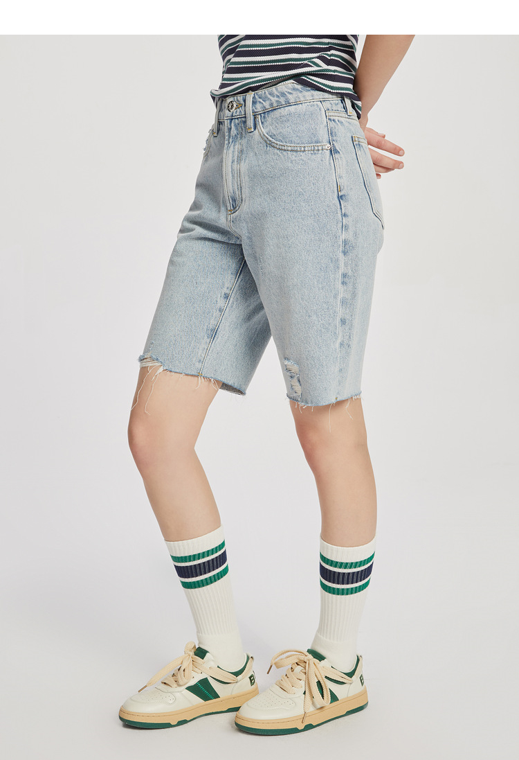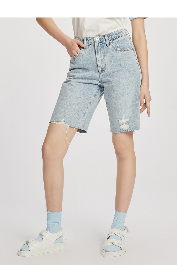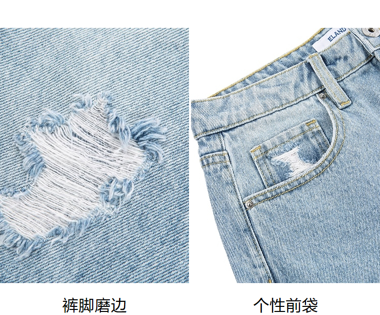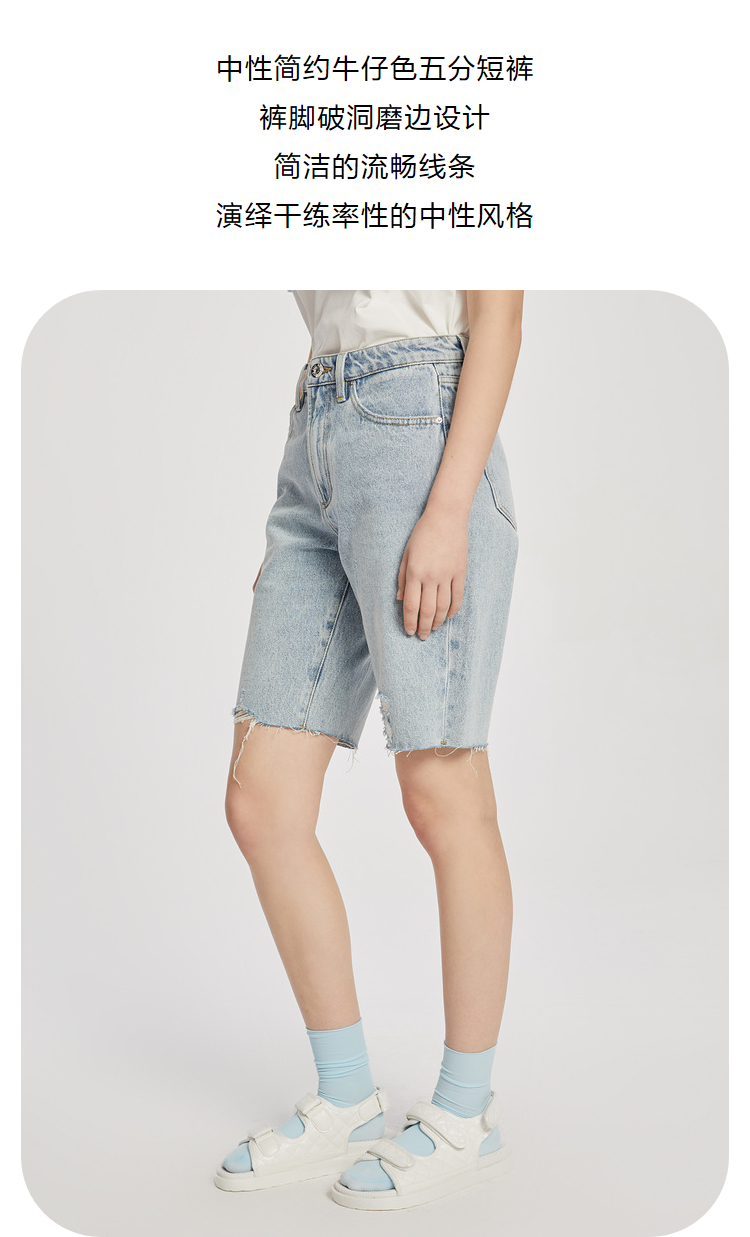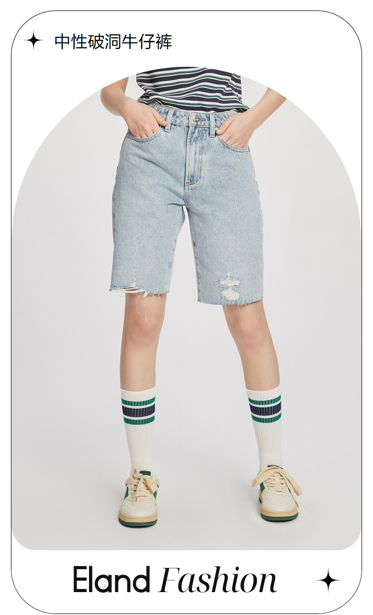ELAND衣恋2022年春季新款潮酷个性美式设计感剪边破洞牛仔短裤女EETJC23Q2N