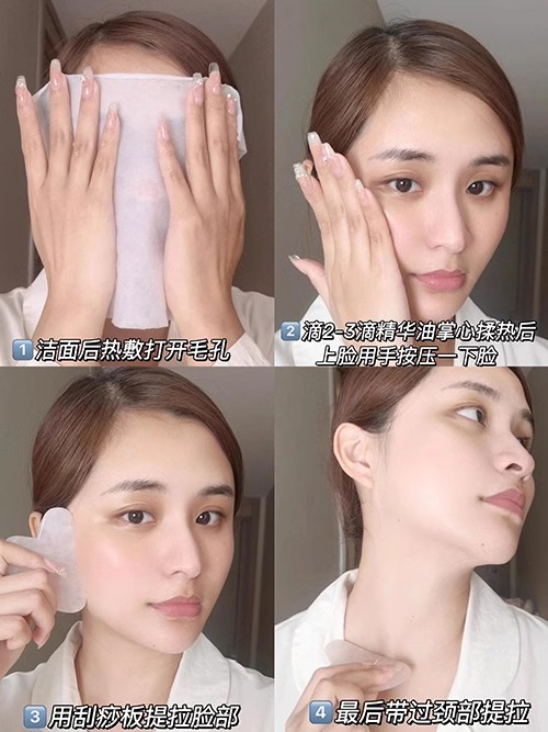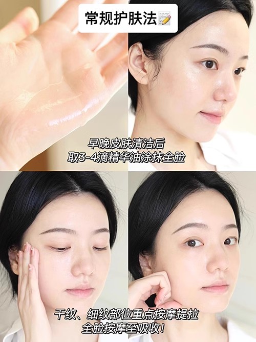 早晚清洁完皮肤后取3-4滴精华油涂抹全脸