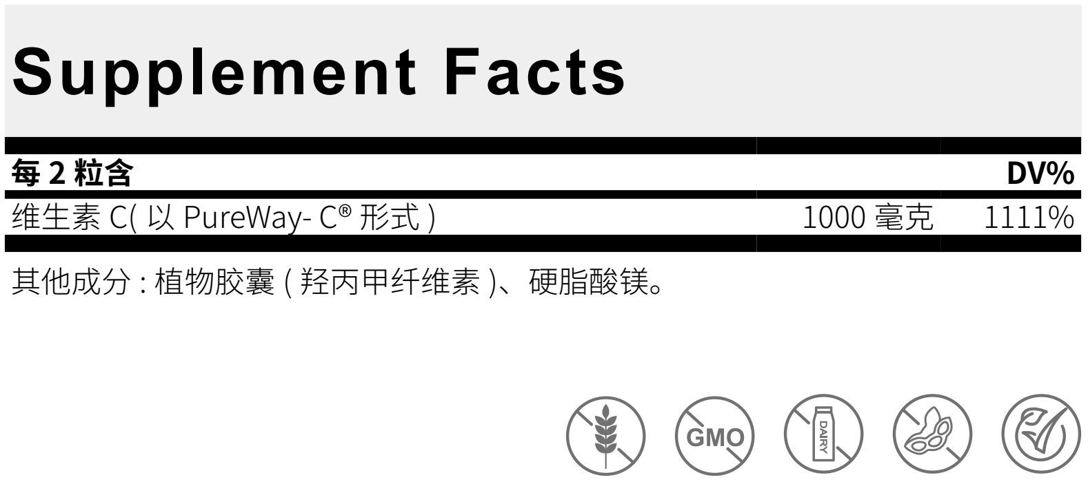 每两粒 PureWayC®1000胶囊提供专利的高吸收形式维生素C1000 毫克,其吸收率是普通维生素C的2-3倍,即使更低剂量摄入也能发挥相应的生理功能。产品尽可能的减少辅料添加,是任何有维生素 C 补充需求人群的理想选择。