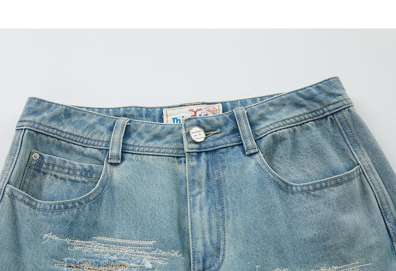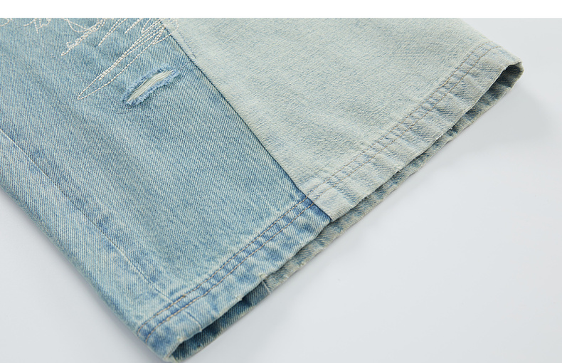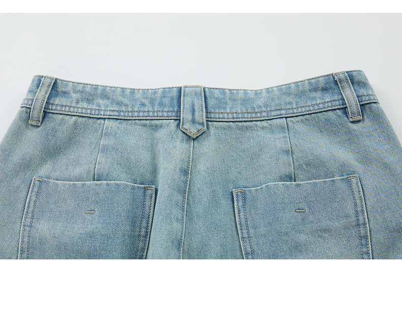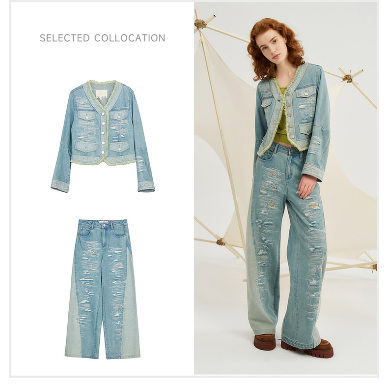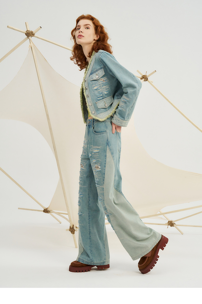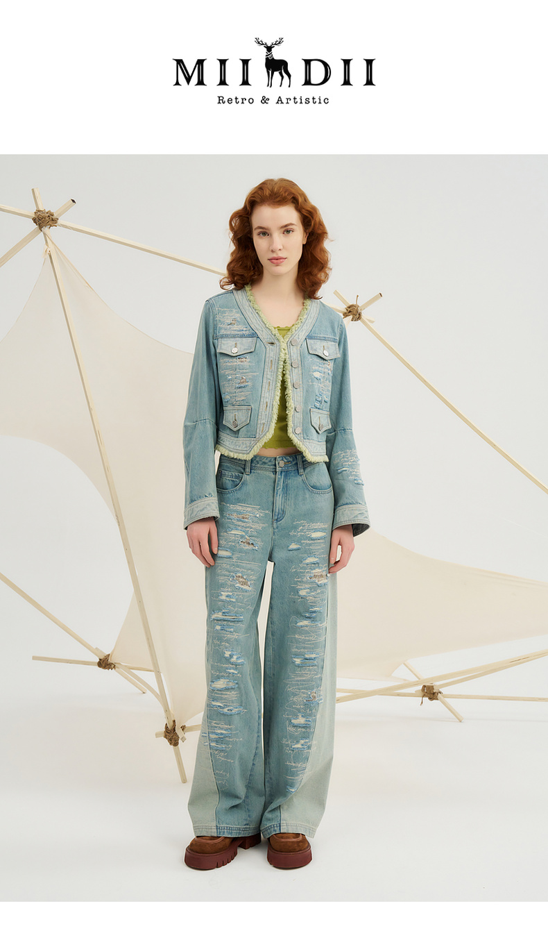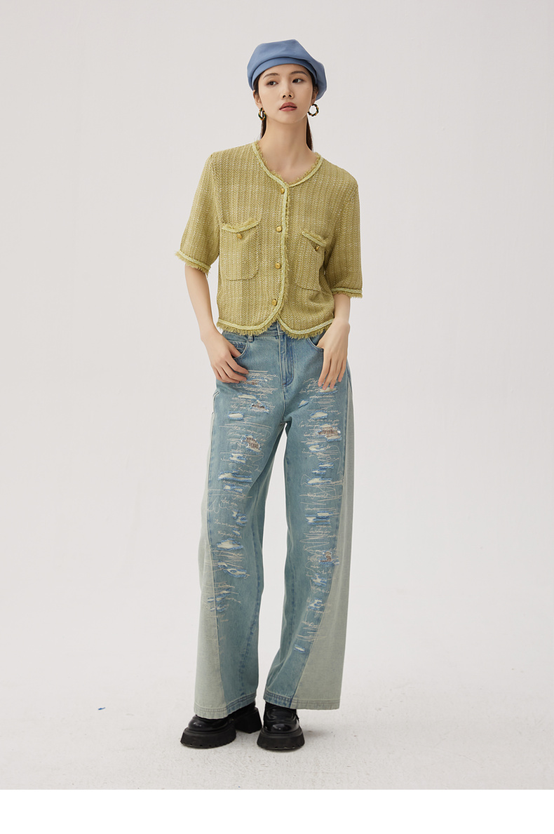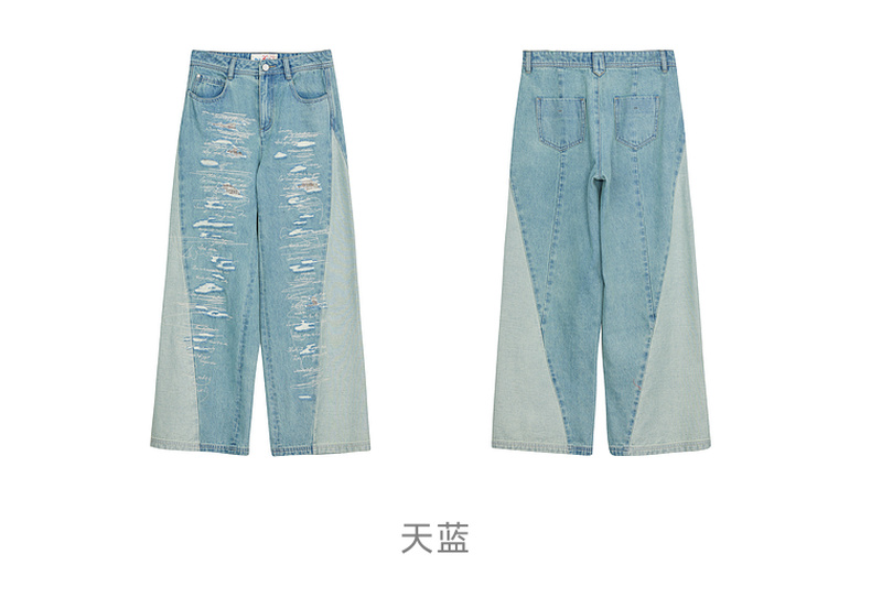 谜底牛仔阔腿裤女2024秋季新品复古风拼接水洗破洞长裤243MK1059