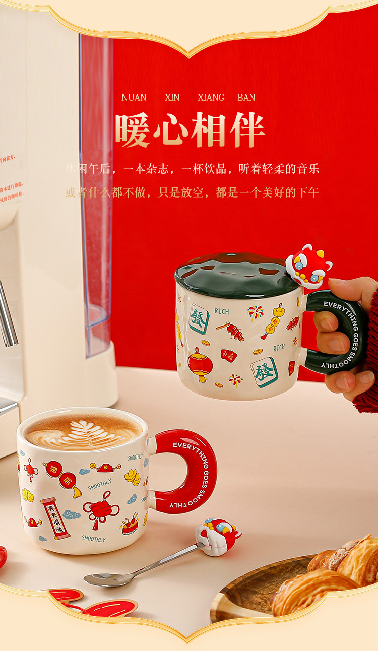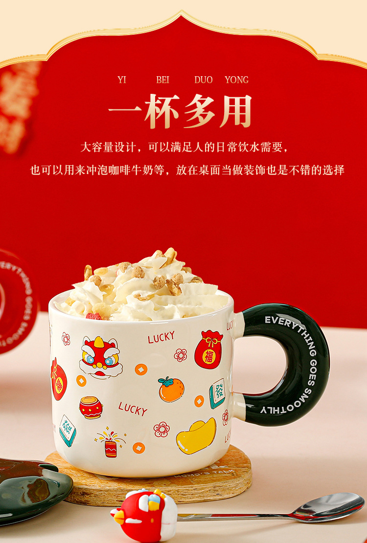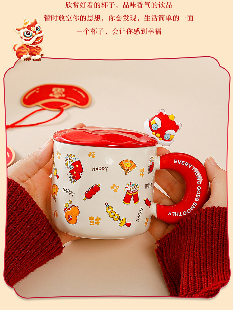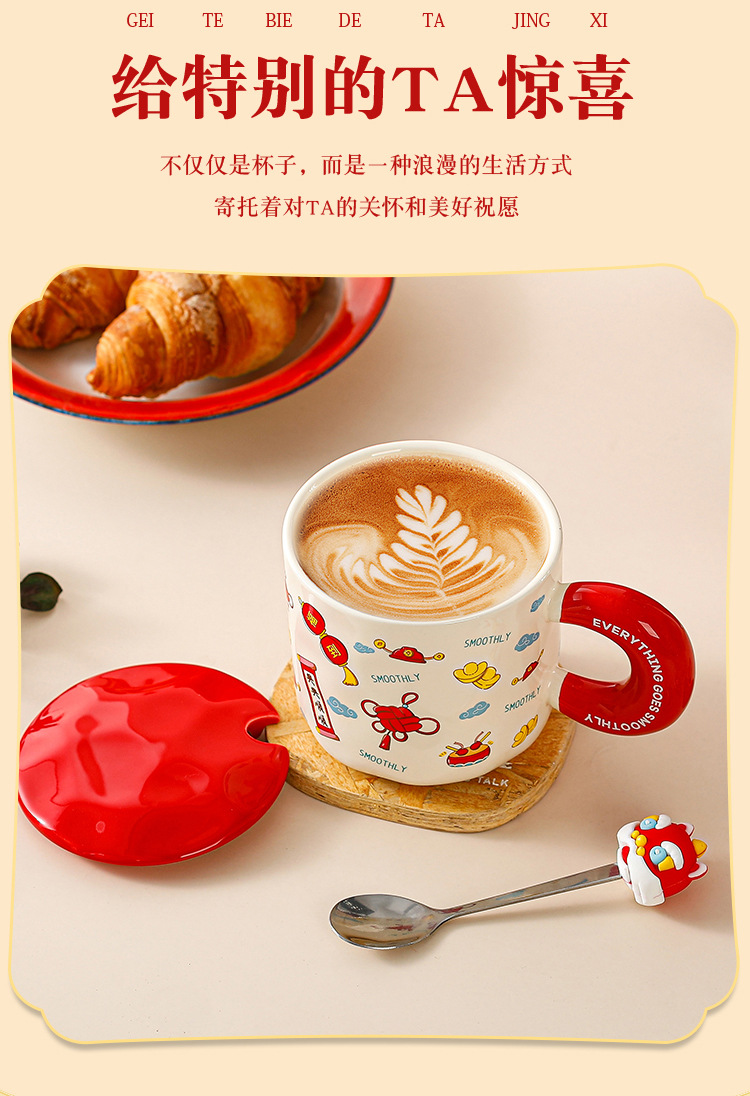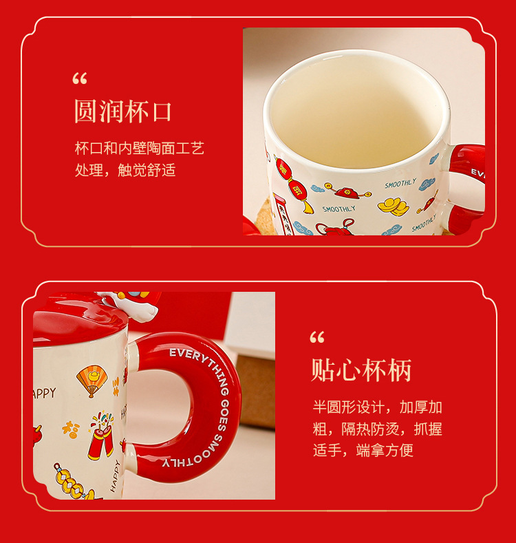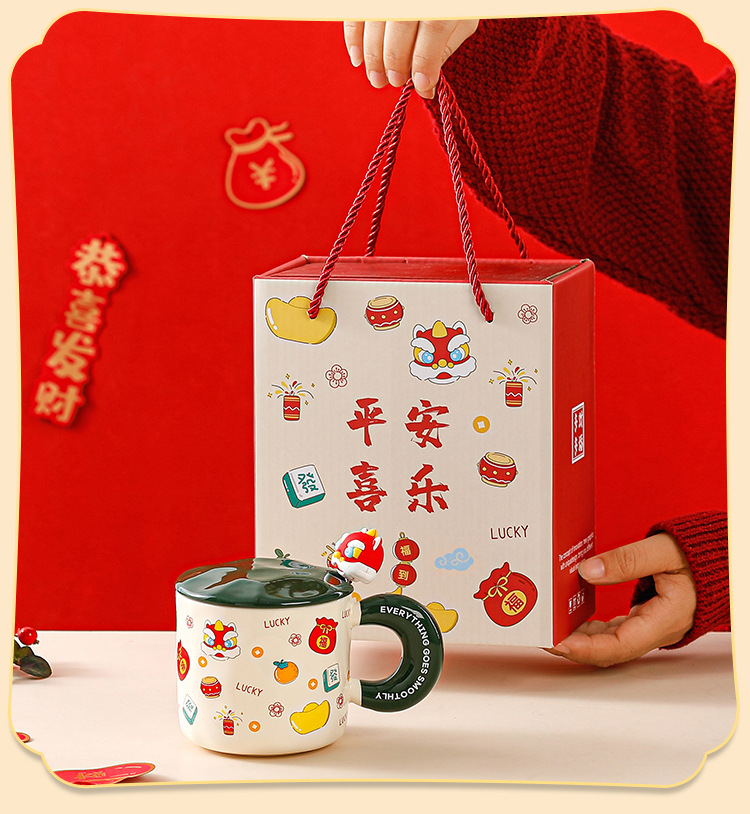 【平安喜乐❗️喜气洋洋马克杯礼盒套装】暖心相伴,春节礼品带盖勺可爱陶瓷水杯女生高颜值卡通办公室情侣杯子,新年礼盒年货礼盒