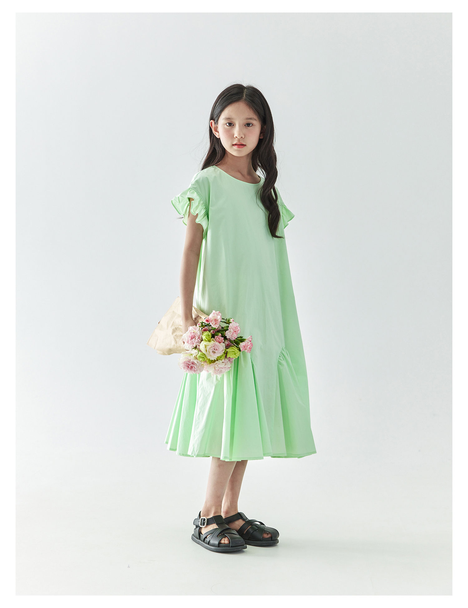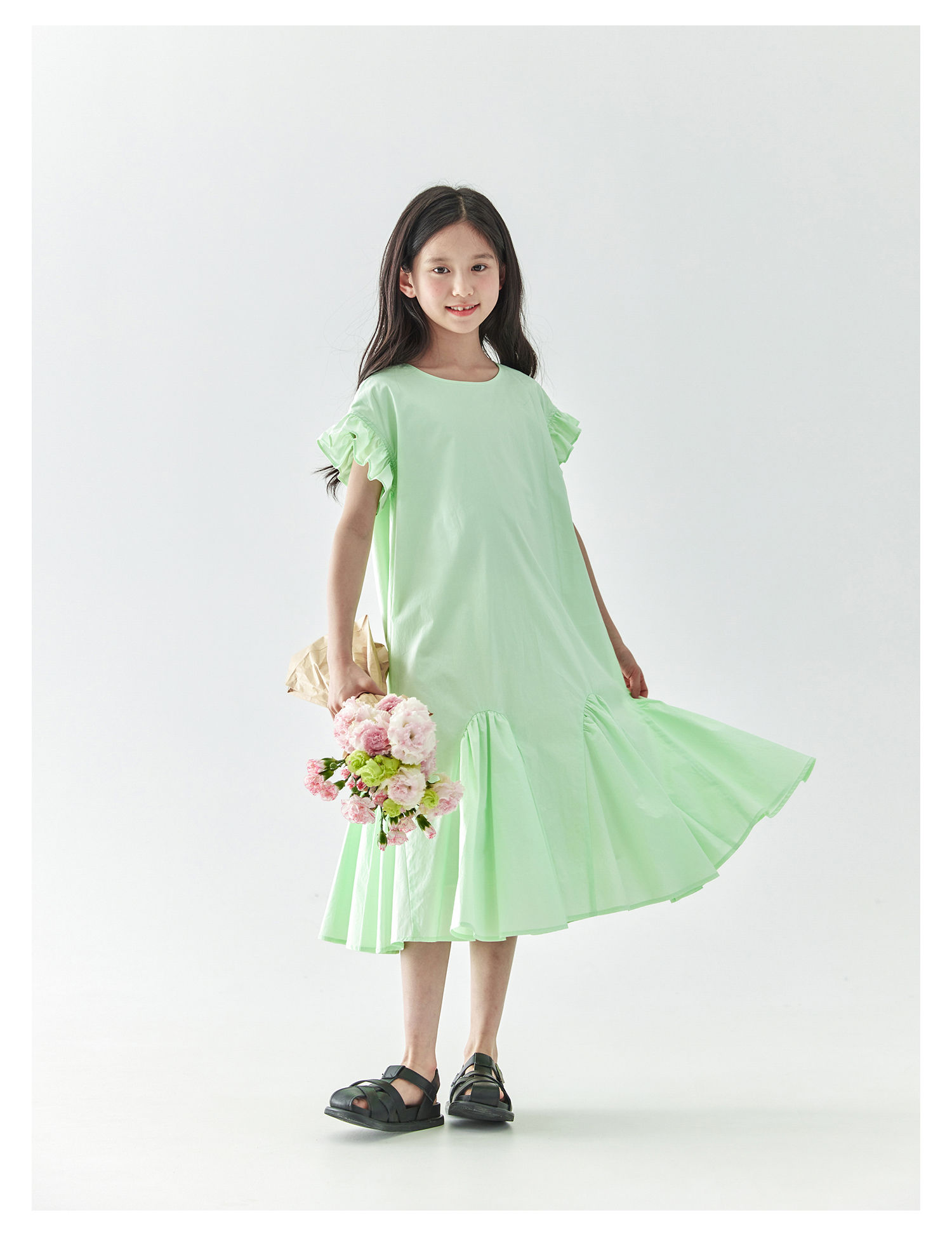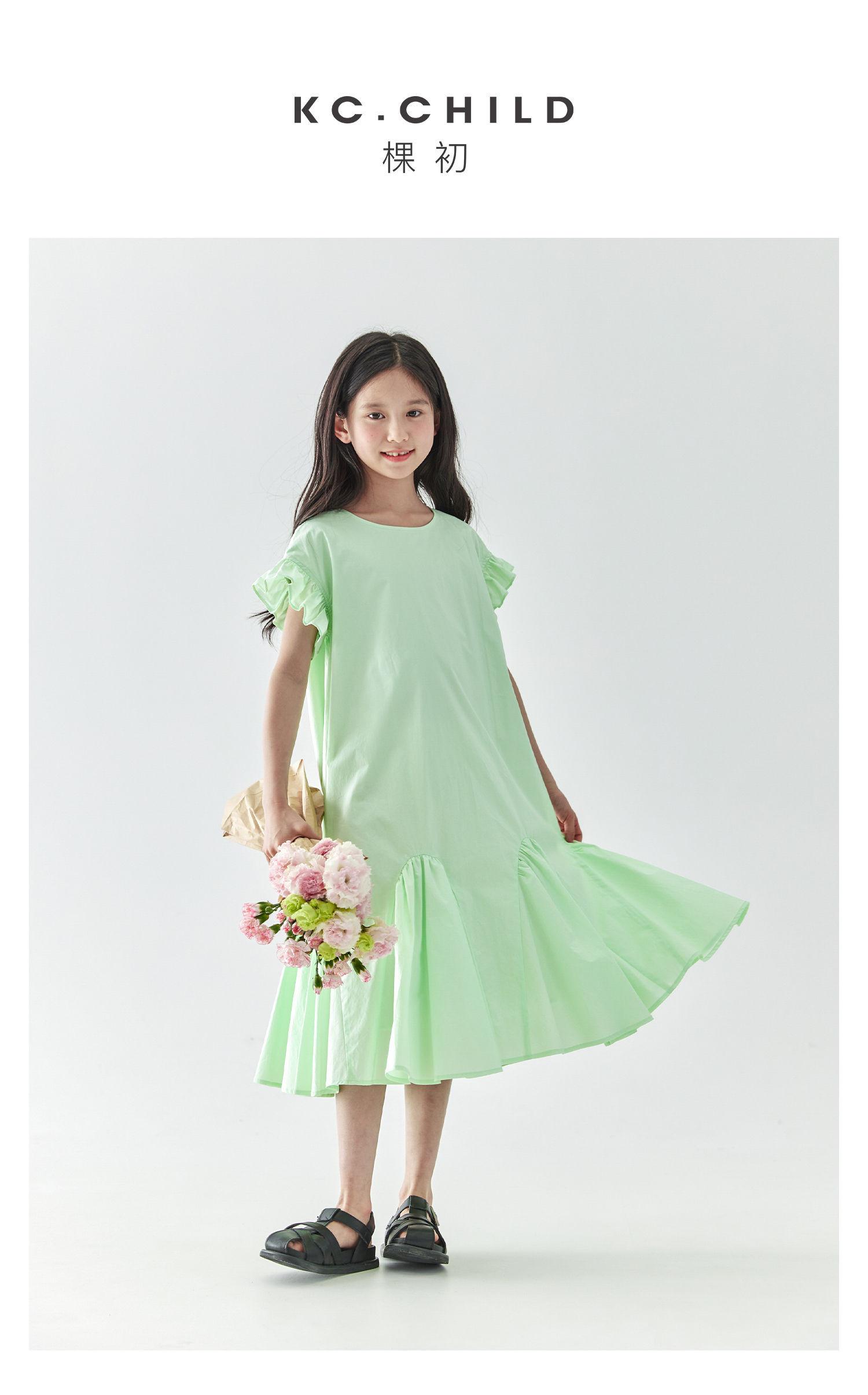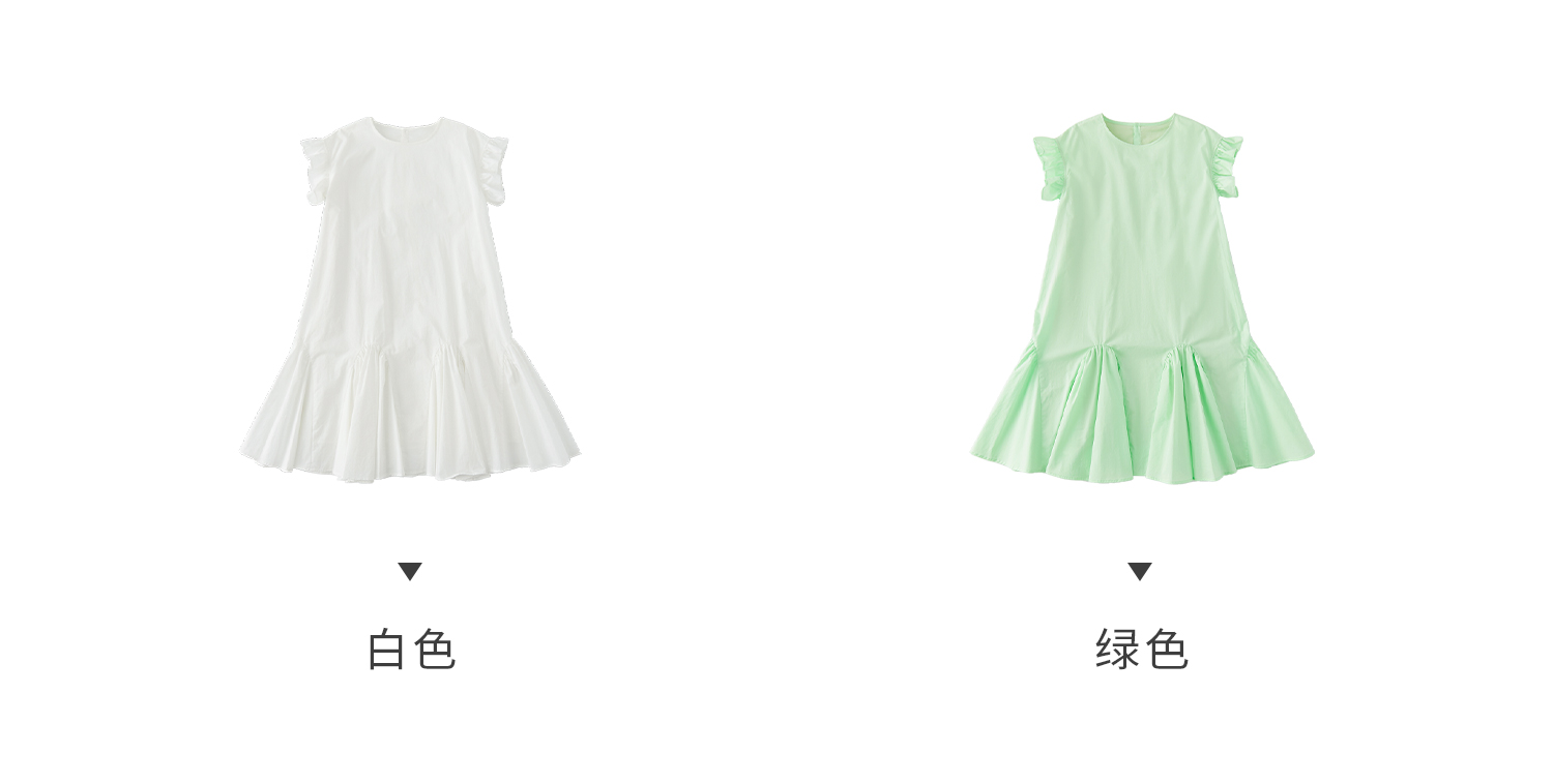 棵初2025年春夏新款女童小飞袖长款连衣裙全棉量感抽褶拼接A字裙