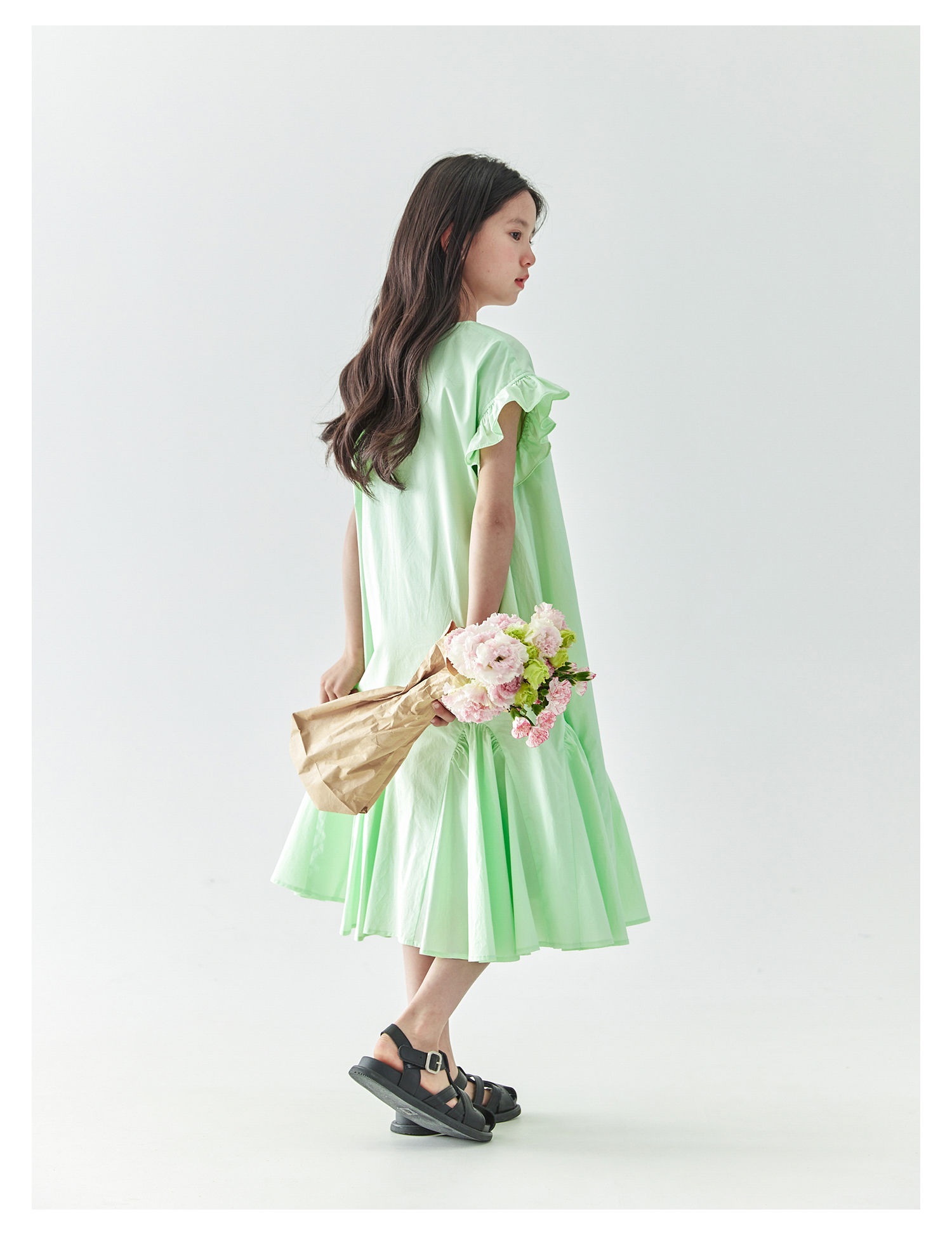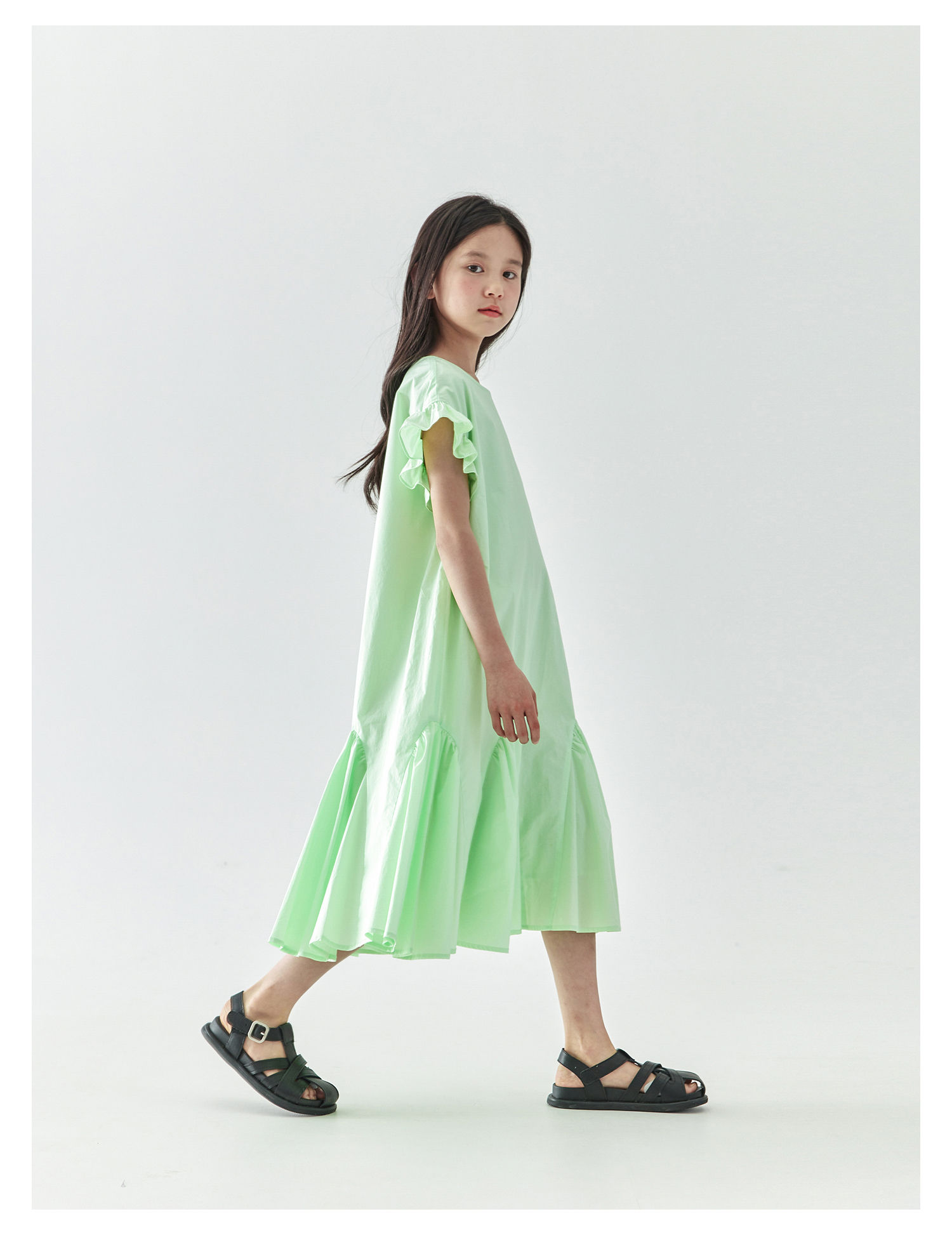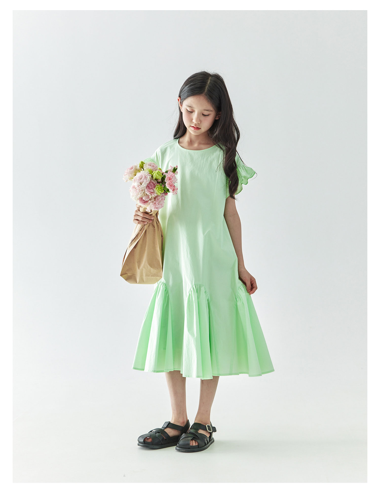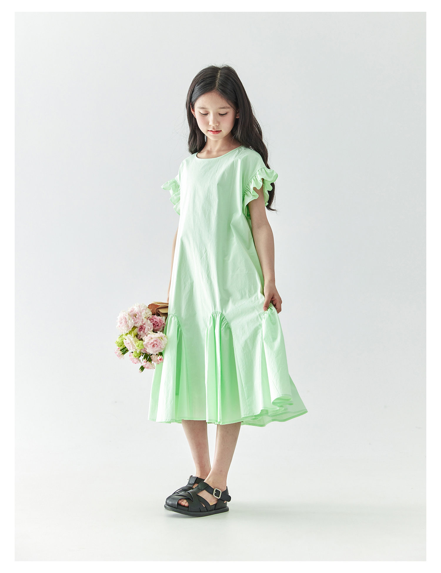 棵初2025年春夏新款女童小飞袖长款连衣裙全棉量感抽褶拼接A字裙