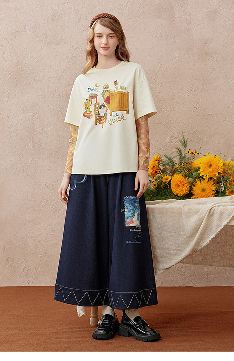 两三事梵高艺术花也谈情夏季压褶拼接印花两面穿雪纺衫女