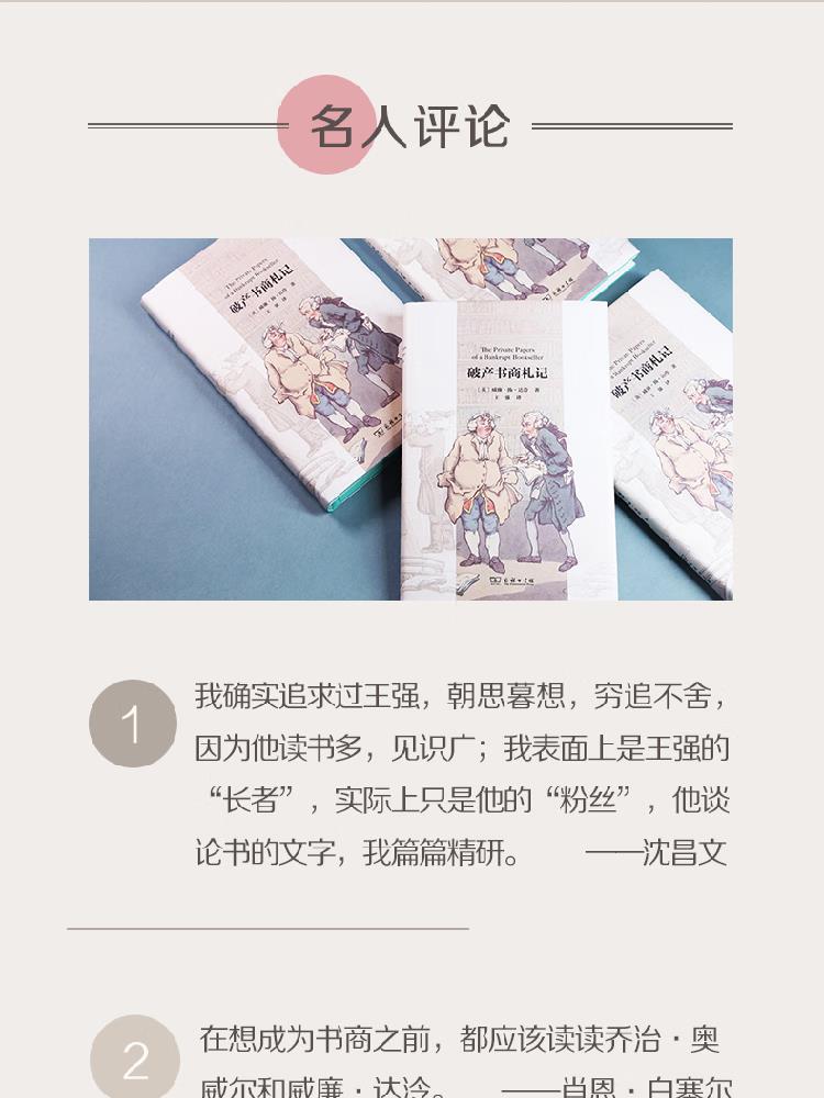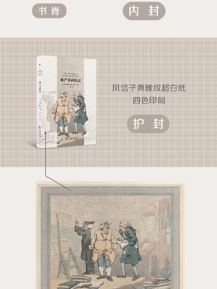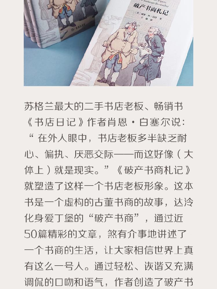 苏格兰较大的二手书店老板、畅销书《书店日记》作者肖恩•白塞尔说:“在外人眼中,书店老板多半缺乏耐心、偏执、厌恶交际——而这好像(大体上)就是现实。”《破产书商札记》就塑造了这样一个书店老板形象。这本书是一个虚构的古董书商的故事,达泠化身爱丁堡的“破产书商”,通过近50篇精彩的文章,煞有介事地讲述了一个书商的生活,让大家相信世界上真有这么一号人。本书即精选这些文章,记录“古怪书商”的轶事和思考,有对书铺环境的描写,如书铺后面的里间、书铺的大门和书架、书铺的邻居花布商等;有的是对经营状况的描写,如橱窗展示、订购存货、接待主顾、书铺的邻居等;也有对书籍内容的探讨和思索,如关于未来、关于“写作狂”、关于诗歌…… 书商不修边幅,病怏怏的,是个无聊人物,不过聊起书来滔滔不绝的劲头可不比任何人逊色。通过轻松、诙谐又充满调侃的口吻和语气,作者创造了破产书商这样一个有趣和可爱的人物。作者常常借主角之口,由一个具体的话题转移到谈论一般的书籍,比如在橱窗里发现了几只蜘蛛,就能联想到蒲柏的诗句“它沿每一根线活着”,显示出对图书的广泛涉猎和熟知。而这样一个爱书之人,最后竟以破产自杀告终,读来不仅令人唏嘘,更能以此为契机,深入思考生命的价值与意义。