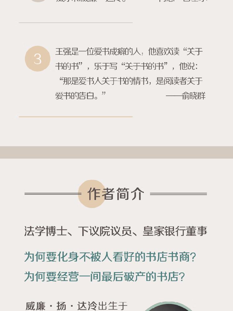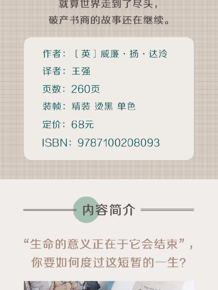 1. 本书是威廉•扬•达泠作品的首次引进,全书构思精巧,仿佛一幕幕情景剧,最终却以这位经历过“一战”的书商的自杀戛然而止,回忆其日常不乏巧思,回忆其结局又不免唏嘘。