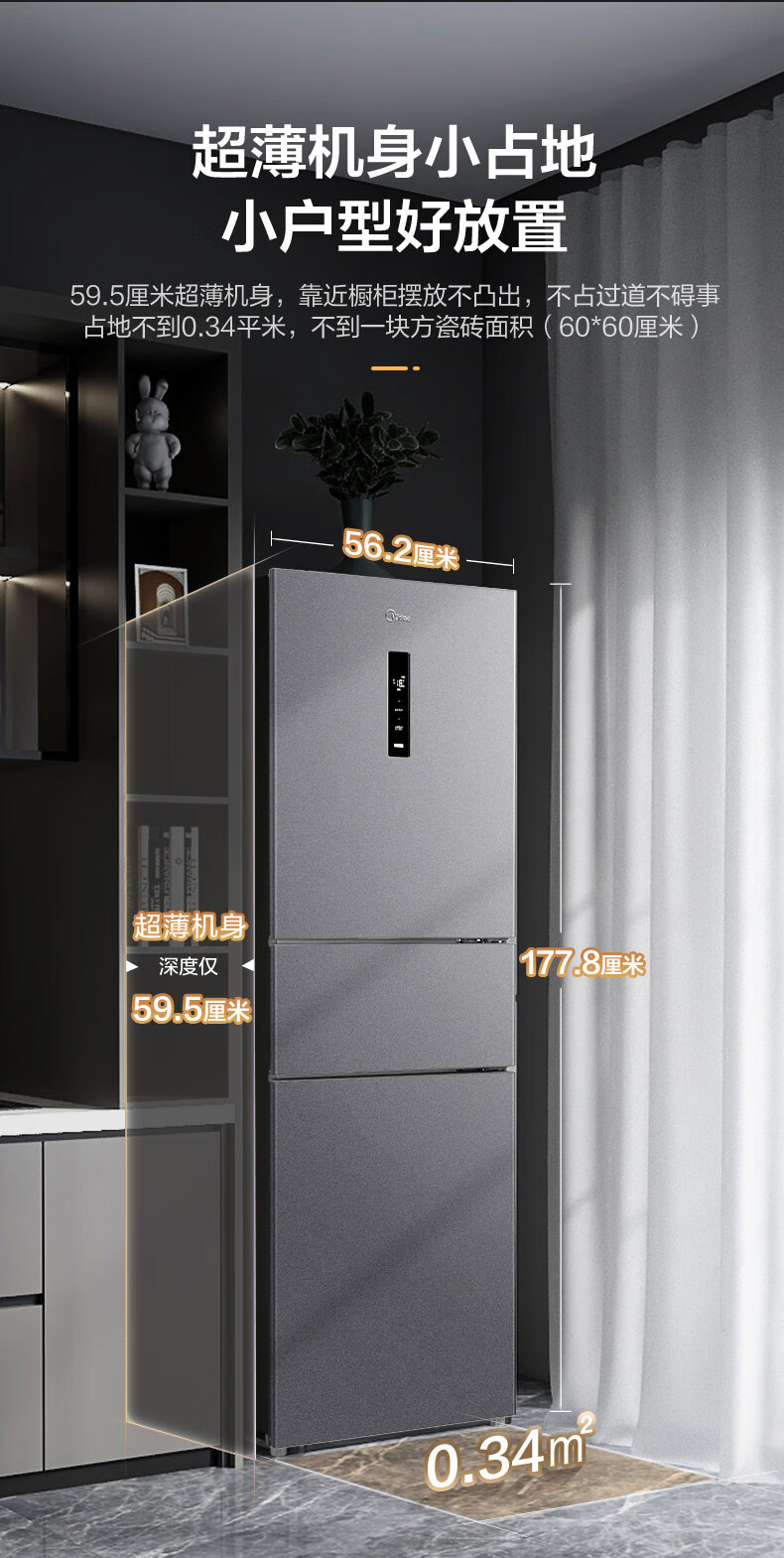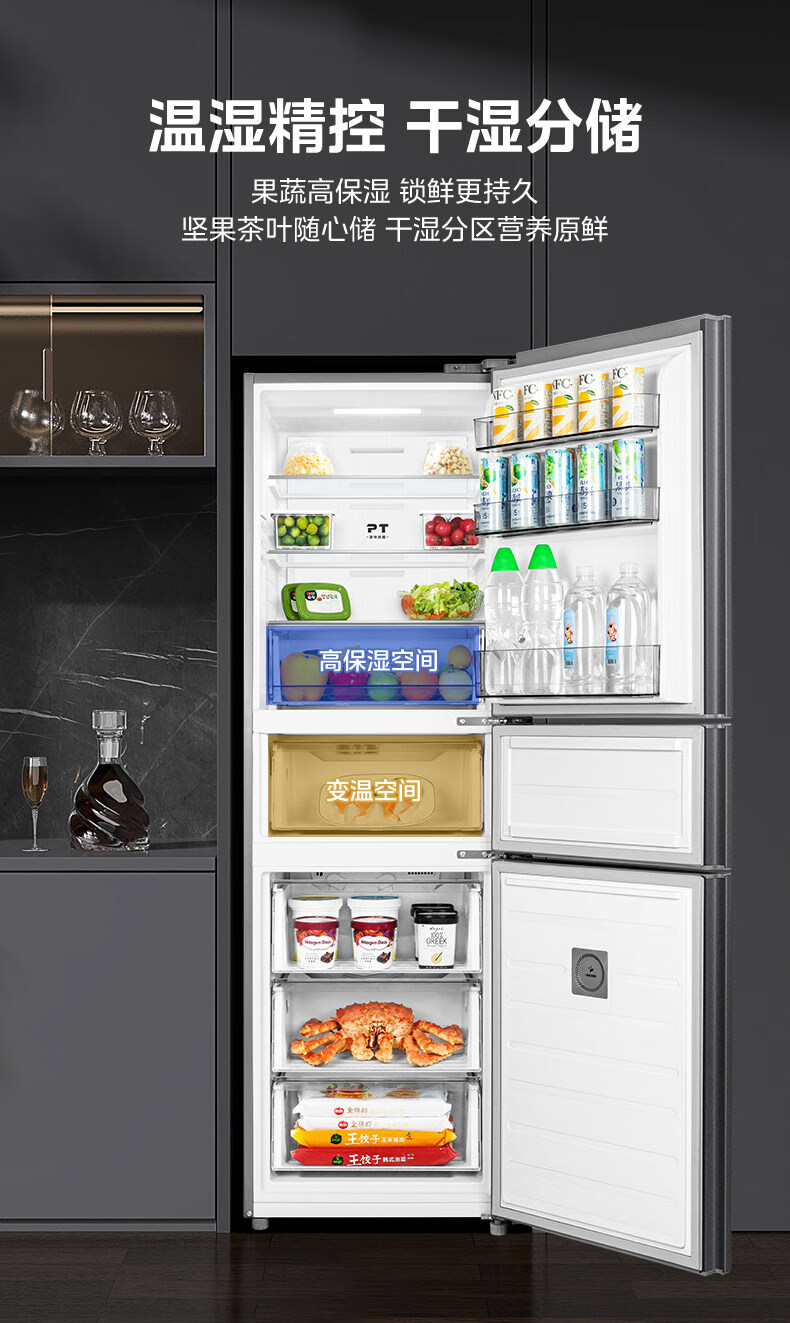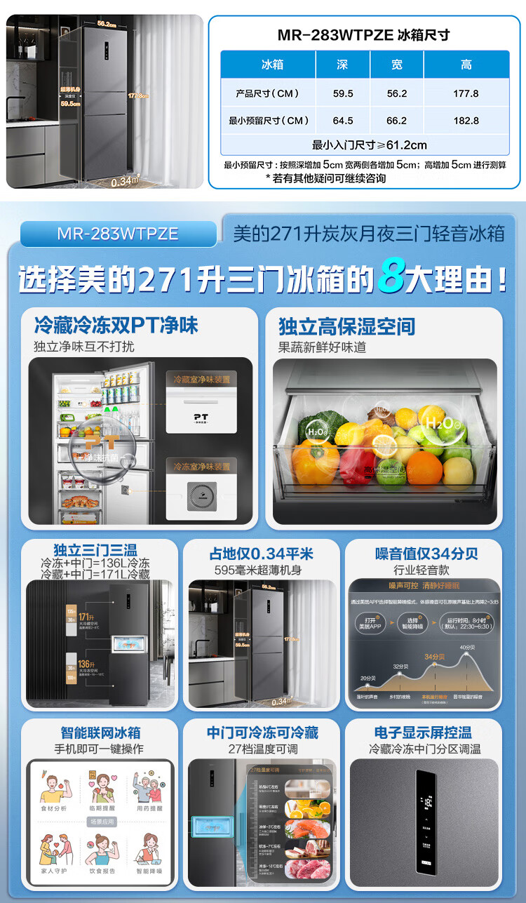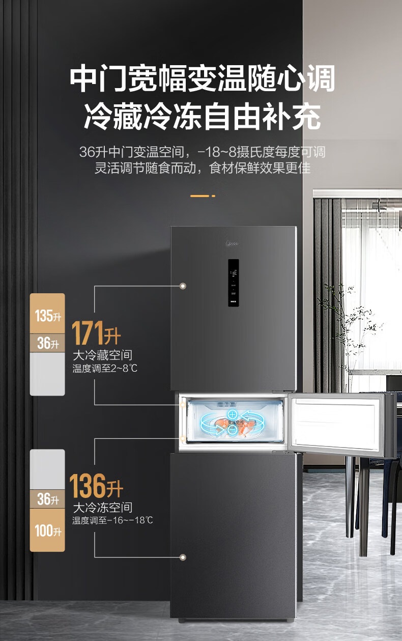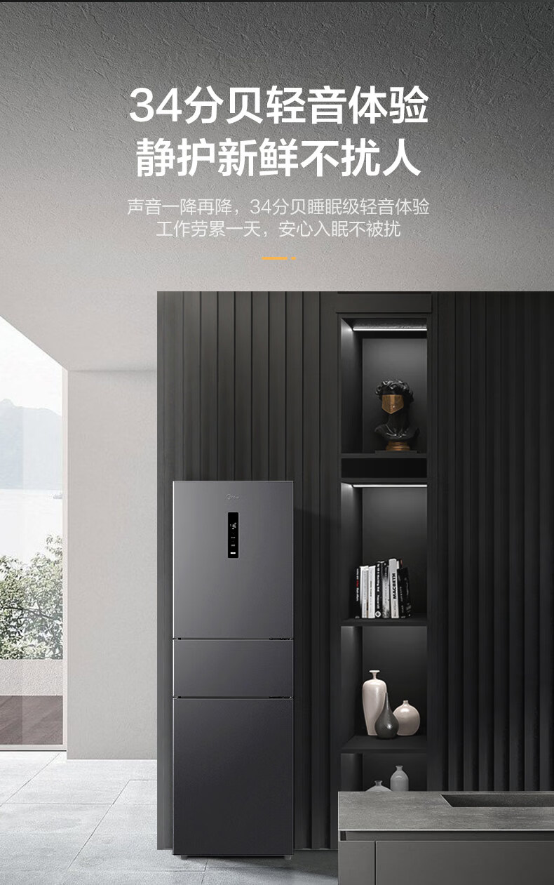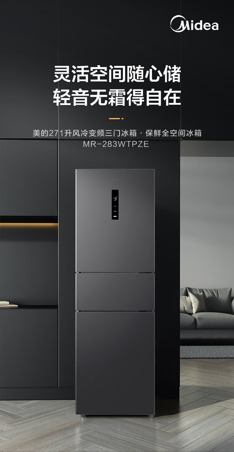 【国补15%】美的冰箱MR-283WTPZE炭灰-月夜家用三门小型电冰箱一级能效节能风冷无霜双净味租房