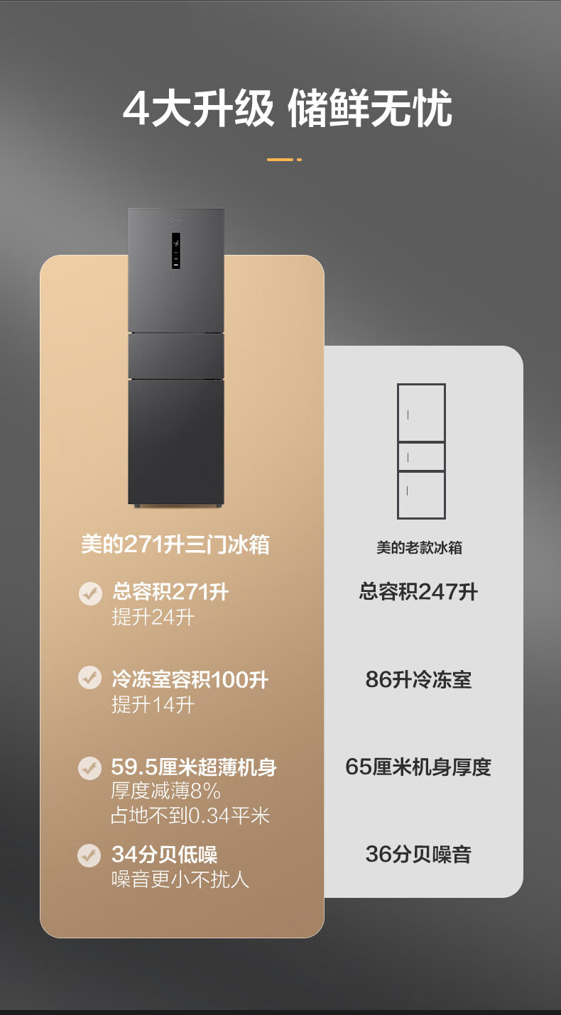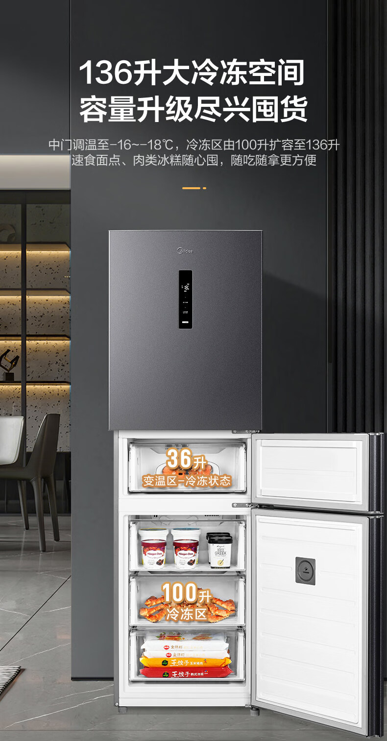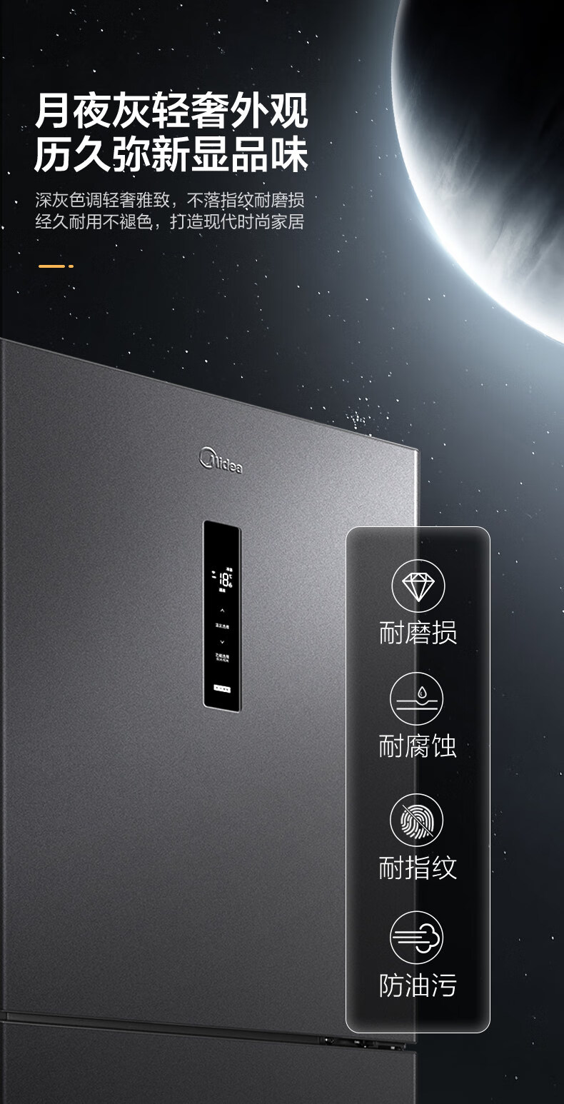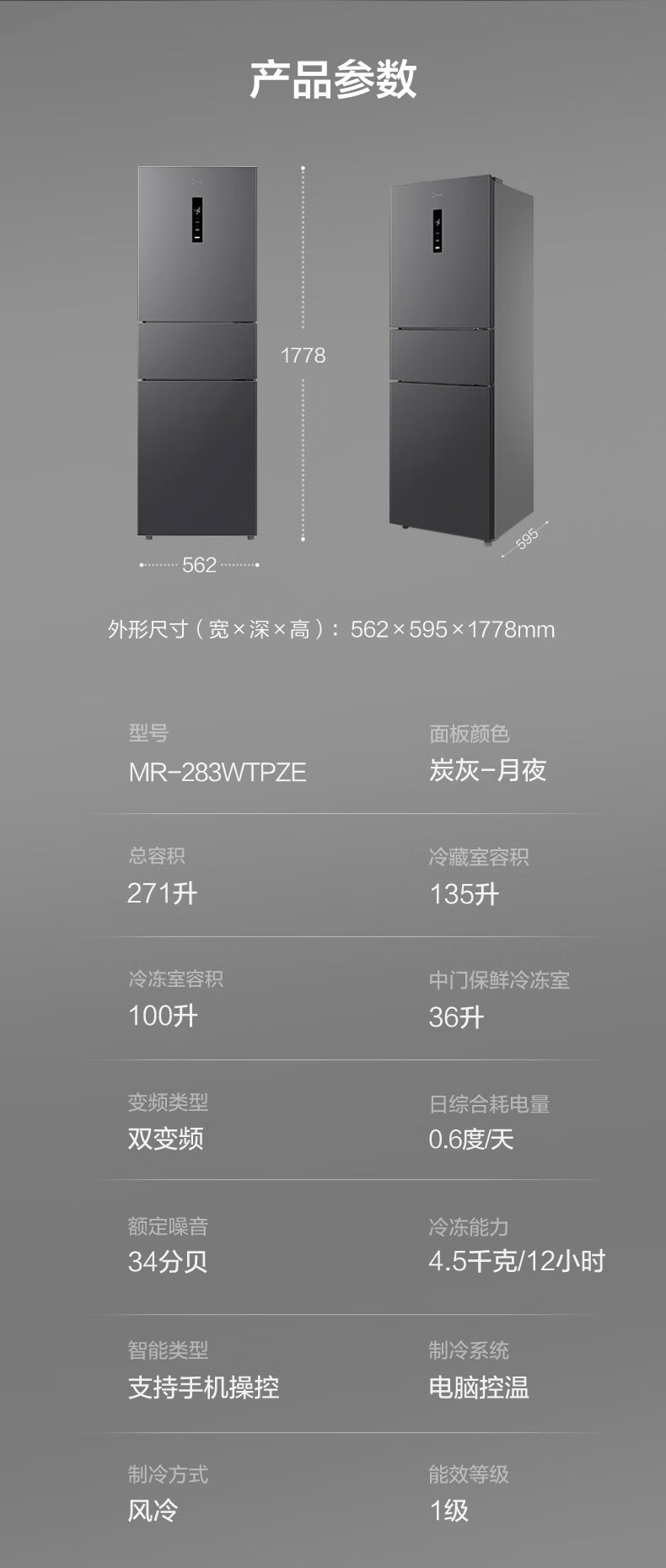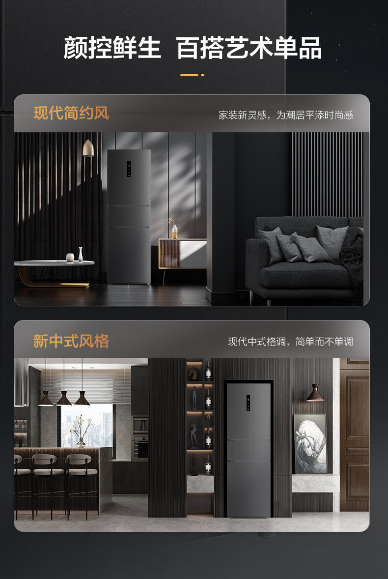 【国补15%】美的冰箱MR-283WTPZE炭灰-月夜家用三门小型电冰箱一级能效节能风冷无霜双净味租房