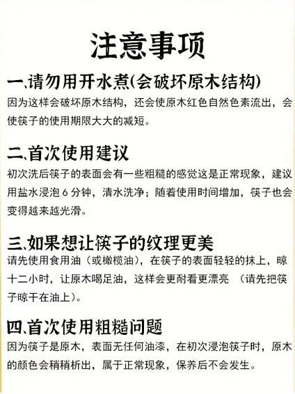② 鸡翅木整木筷子制作工艺极高,精心打磨圆滑的同时,保持漂亮的鸡翅木纹理,手工打磨保证筷子容易清洗