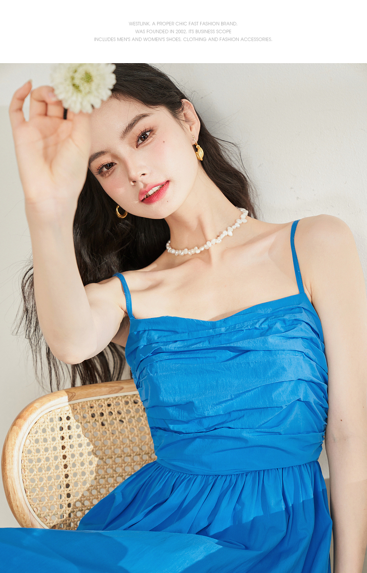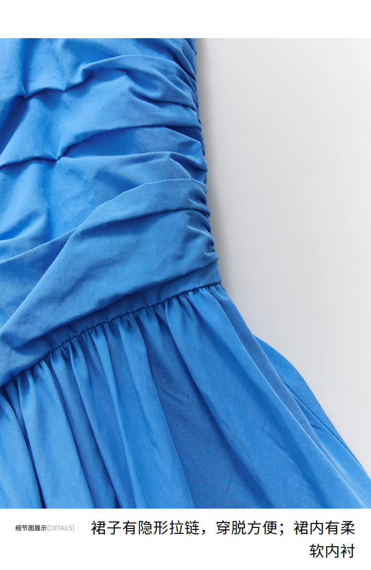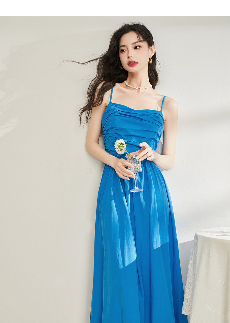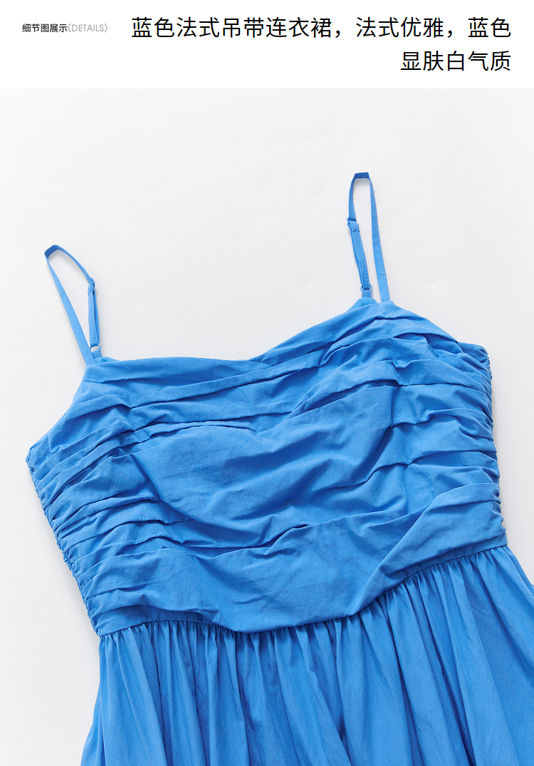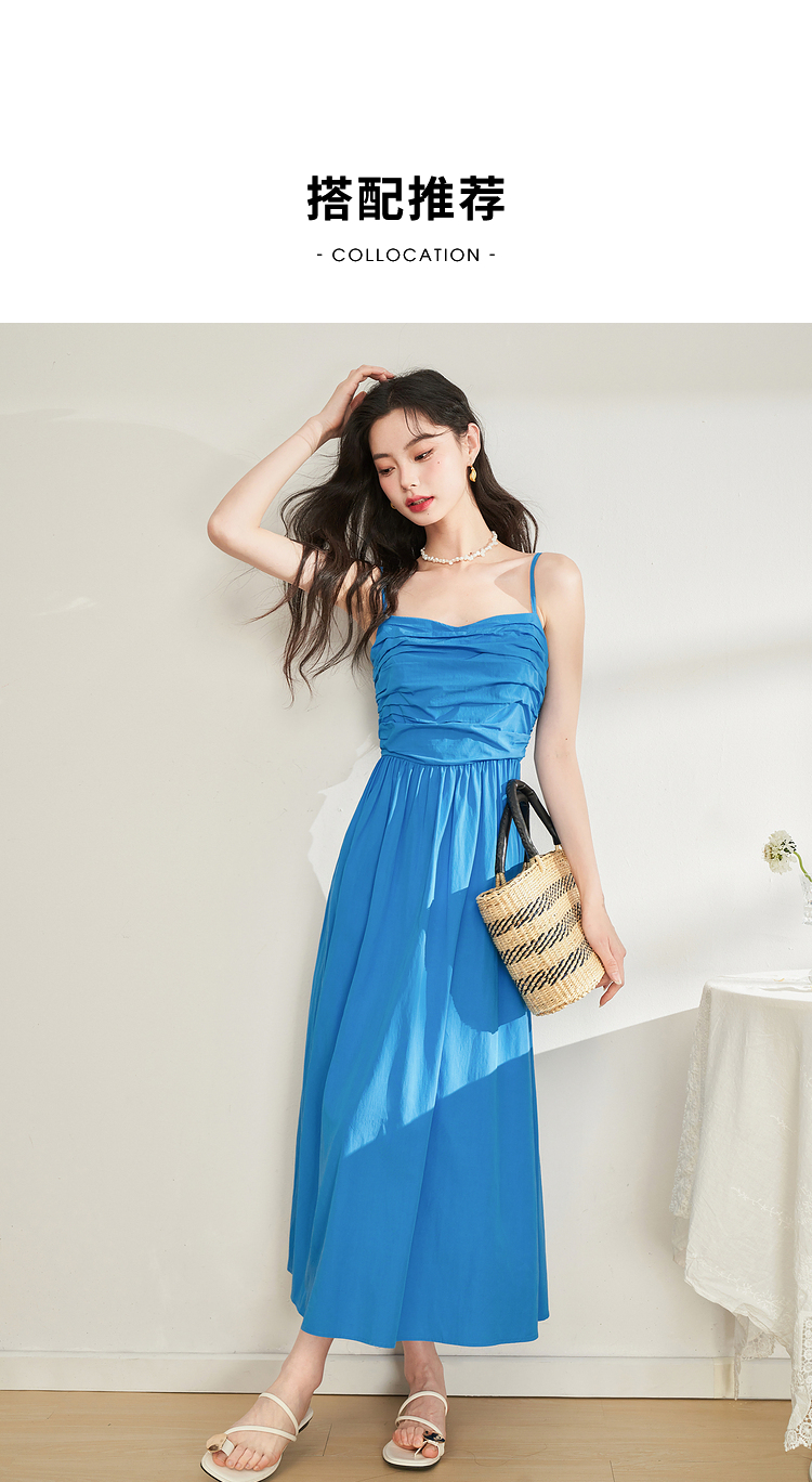 西遇法式茶歇收腰缩褶抹胸蓝色吊带连衣裙女新款夏大摆裙长裙V1231225