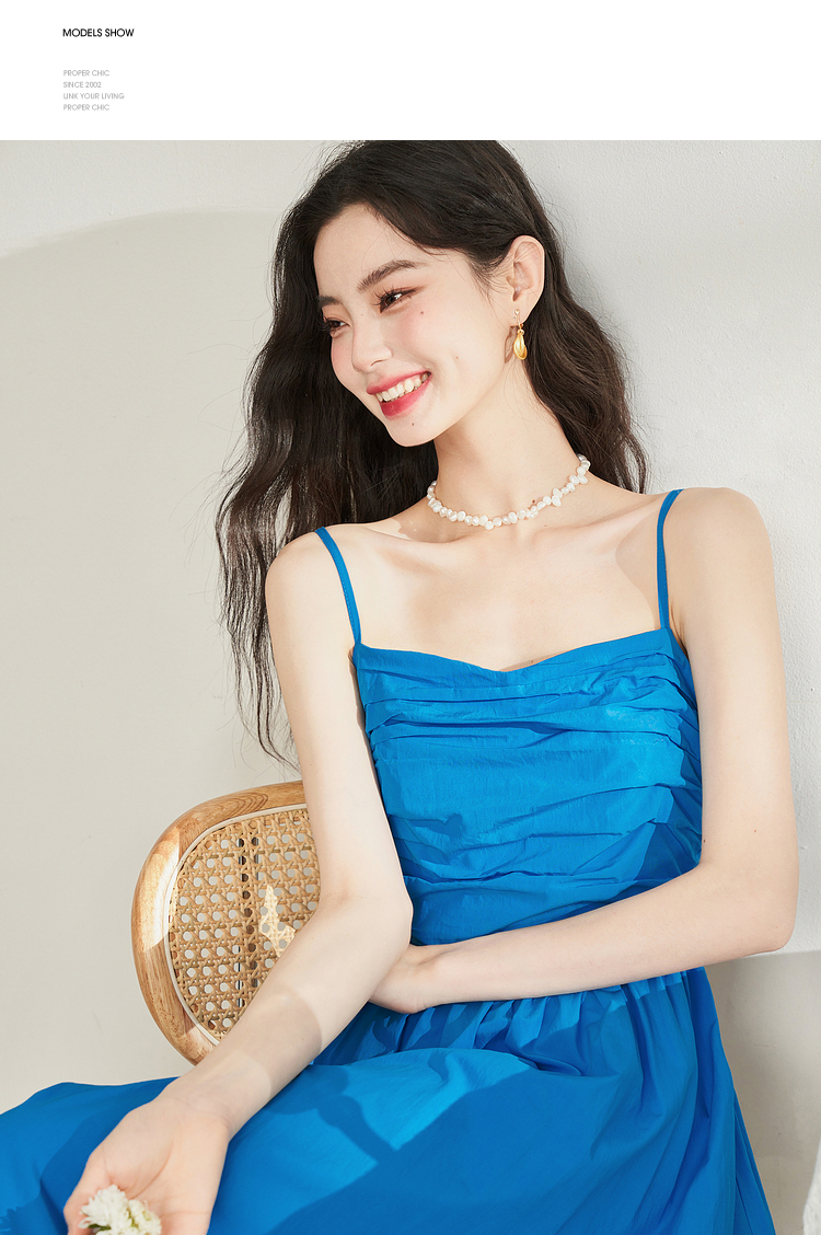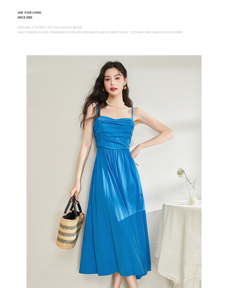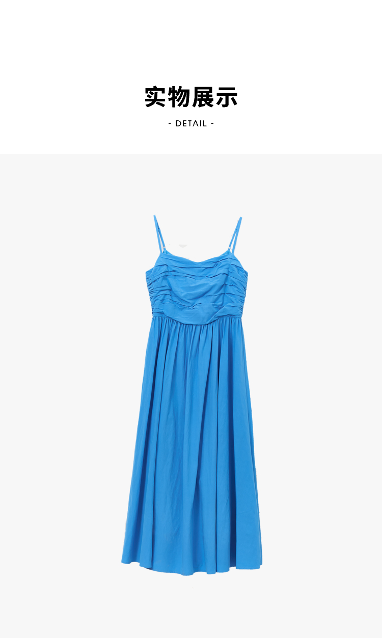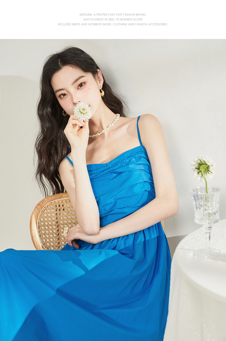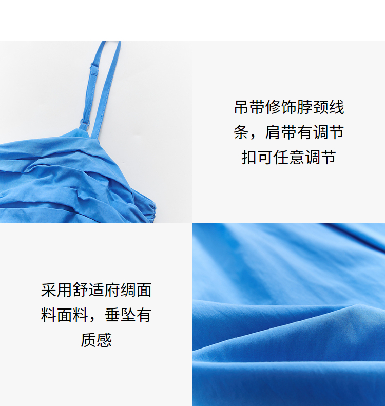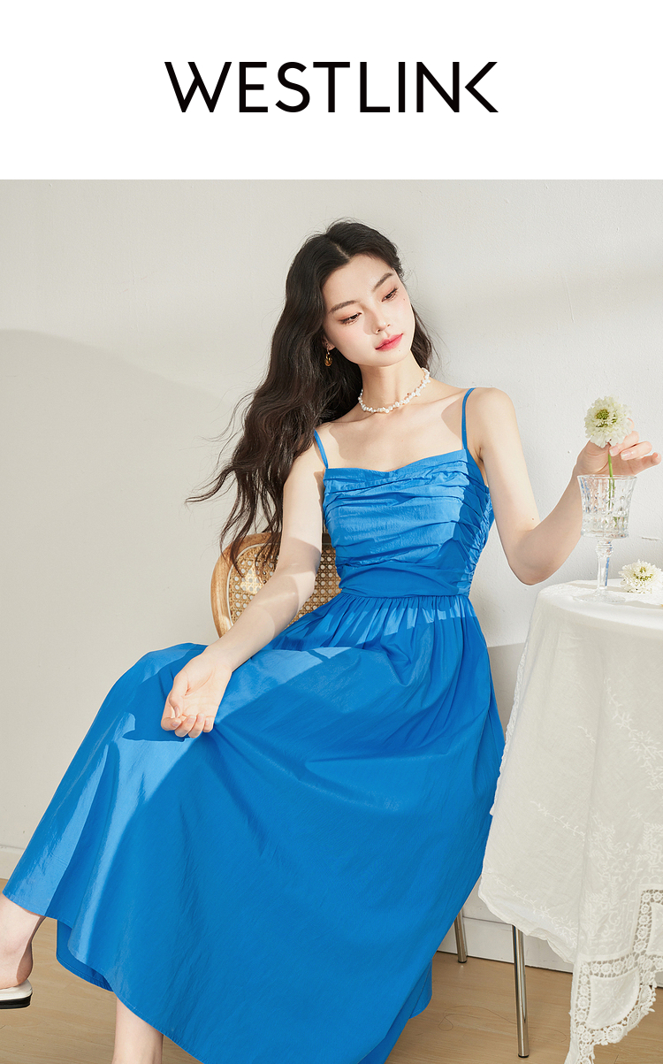 西遇法式茶歇收腰缩褶抹胸蓝色吊带连衣裙女新款夏大摆裙长裙V1231225
