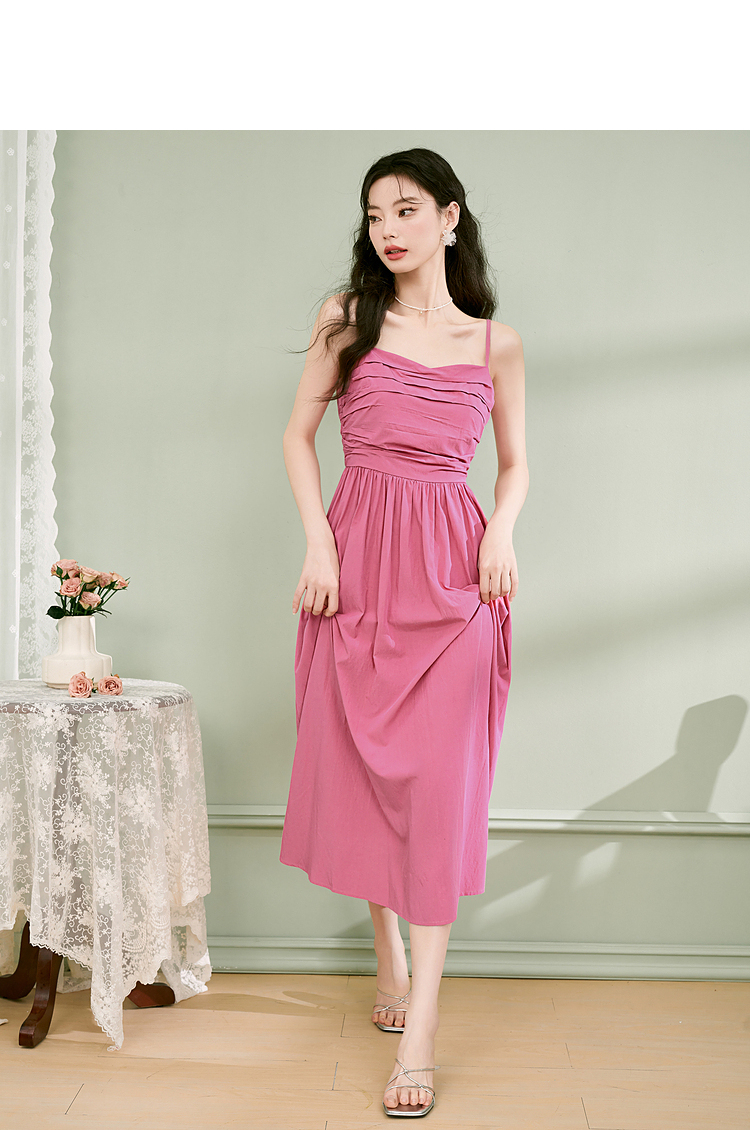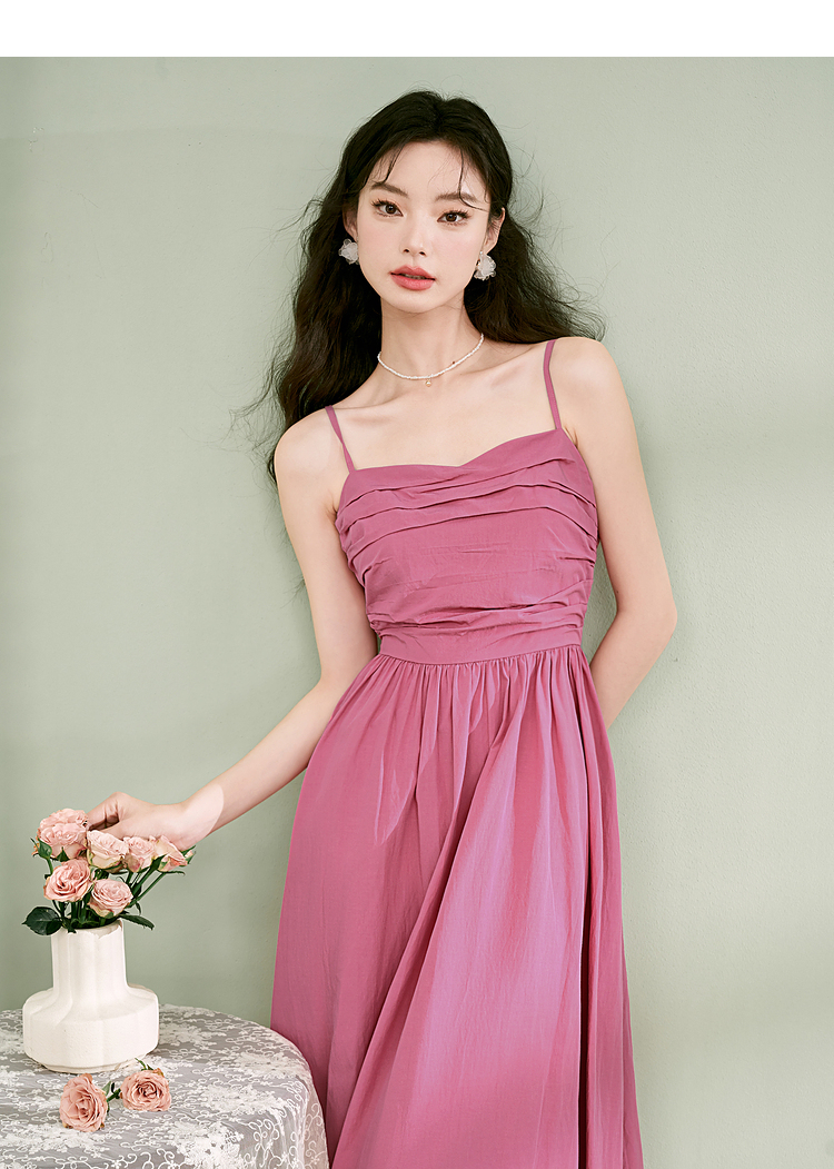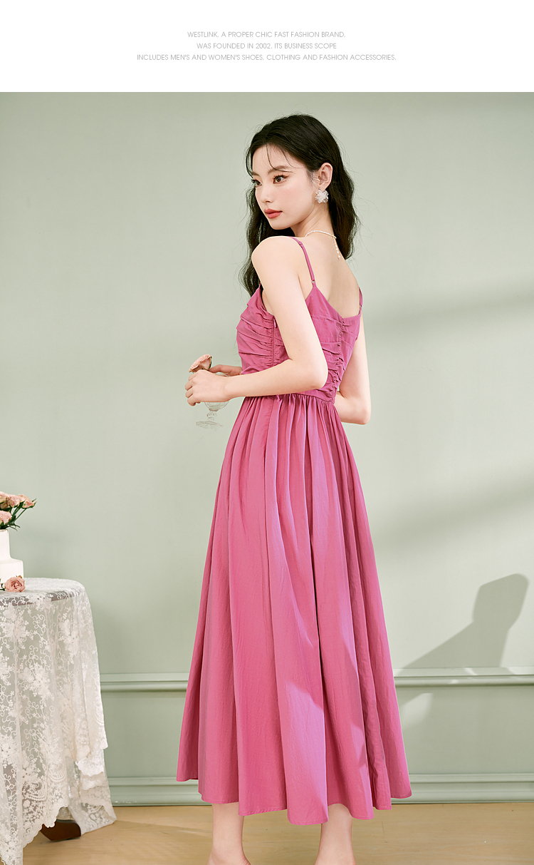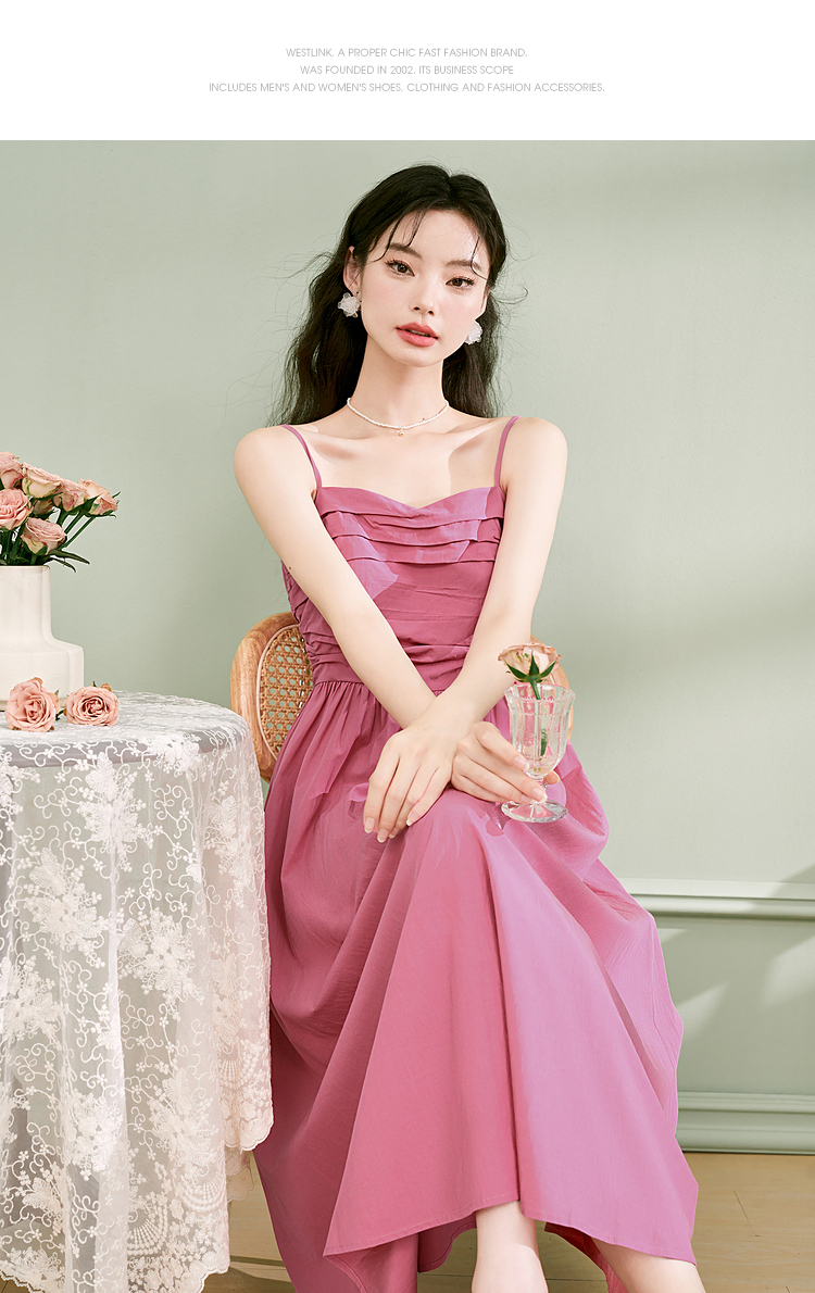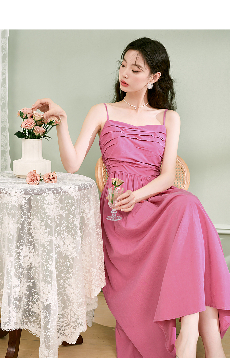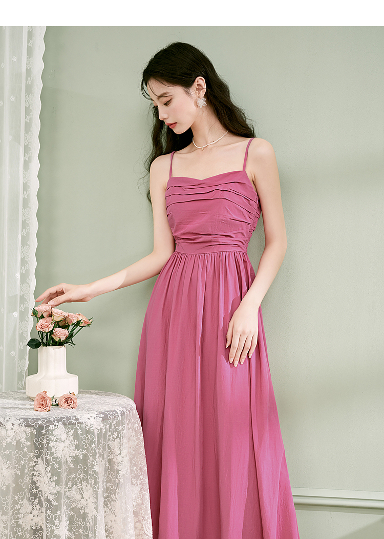 西遇法式茶歇收腰缩褶抹胸蓝色吊带连衣裙女新款夏大摆裙长裙V1231225