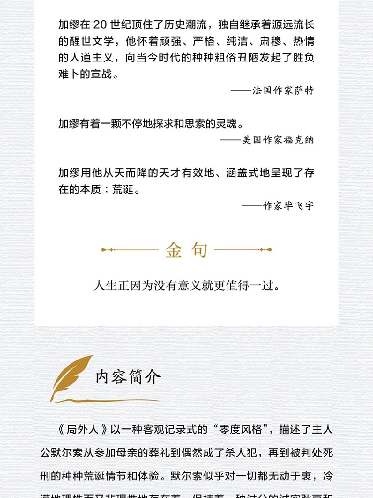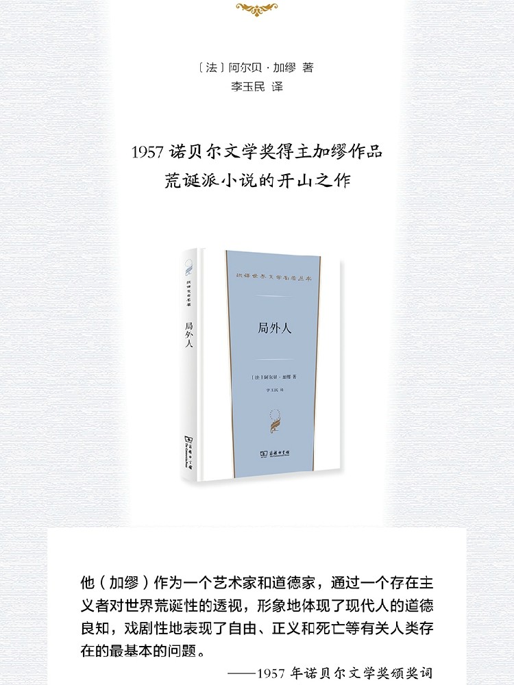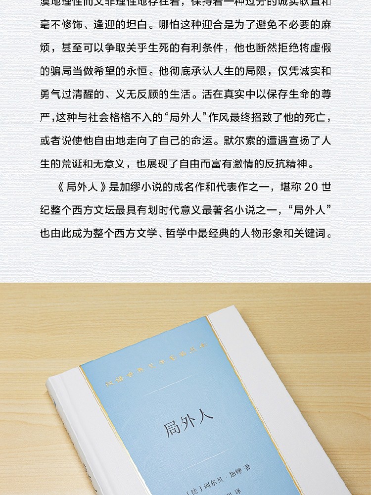 《局外人》是加缪小说的成名作和代表作之一,堪称20世纪整个西方文坛具有划时代意义著名小说之一,“局外人”也由此成为整个西方文学、哲学中经典的人物形象和关键词。