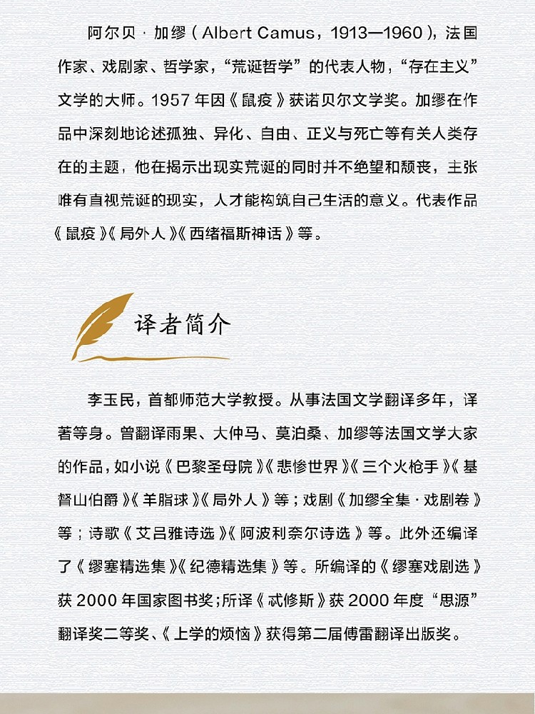 阿尔贝•加缪(Albert Camus,1913—1960), 法国作家、戏剧家、哲学家,“荒诞哲学”的代表人物,“存在主义”文学的大师。1957年因《鼠疫》获诺贝尔文学奖。加缪在作品中深刻地论述孤独、异化、自由、正义与死亡等有关人类存在的主题,他在揭示出现实荒诞的同时并不绝望和颓丧,主张唯有直视荒诞的现实,人才能构筑自己生活的意义。代表作品《鼠疫》《局外人》《西绪福斯神话》等。