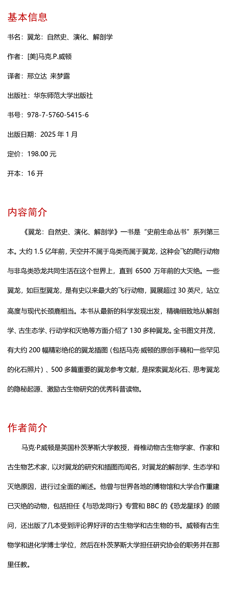 翼龙 自然史 演化 解剖学 史前生命丛书 科普读物 200幅精美插图