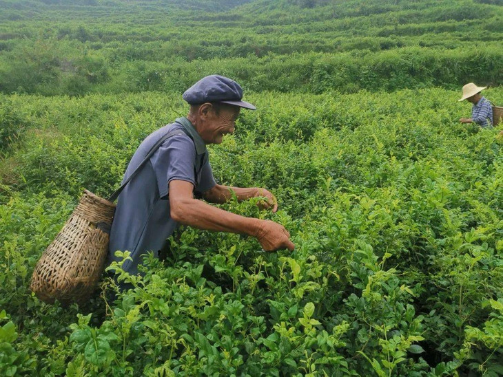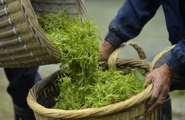 为了保证优质藤茶的品质,必须全部手工將植株末捎部位,龙须狀芽尖采摘下来,费时且费力,只能采摘3—5厘米的嫩叶芽尖
