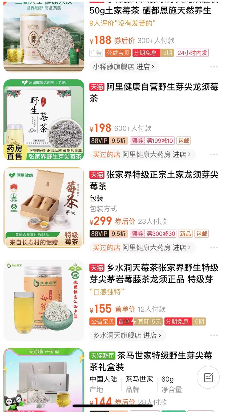 莓茶价格淘宝在售100-300一罐,今年大旱,莓茶本身大量减产