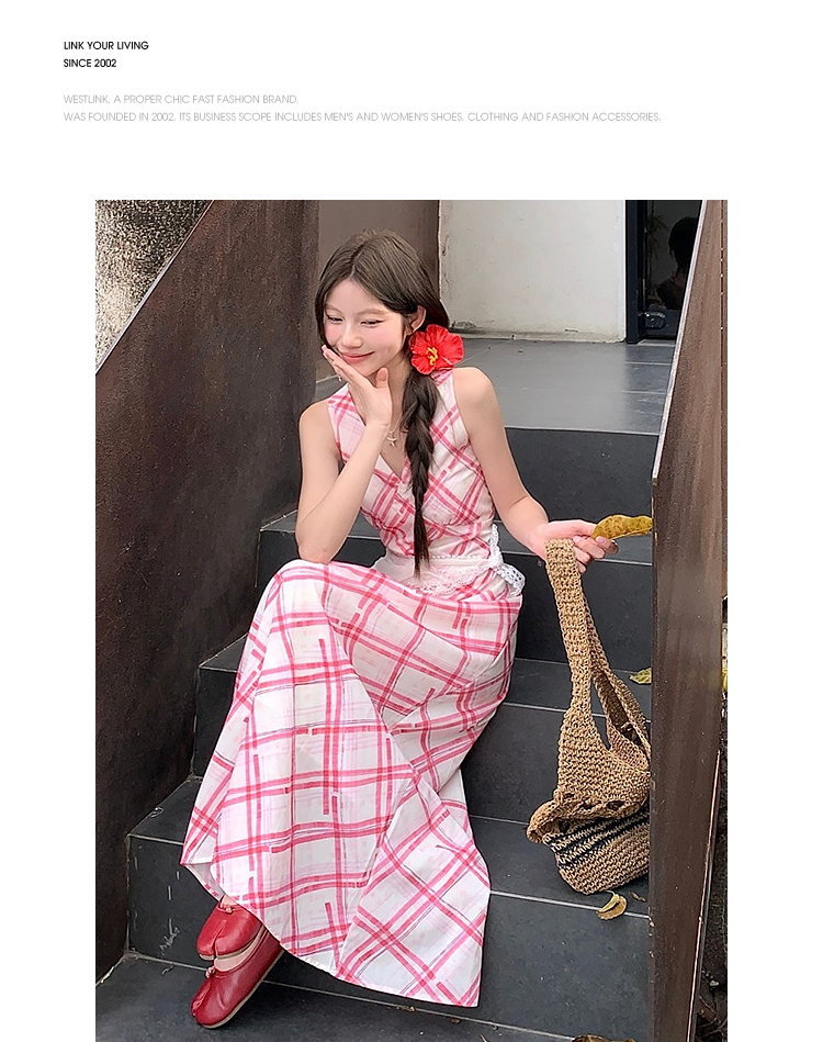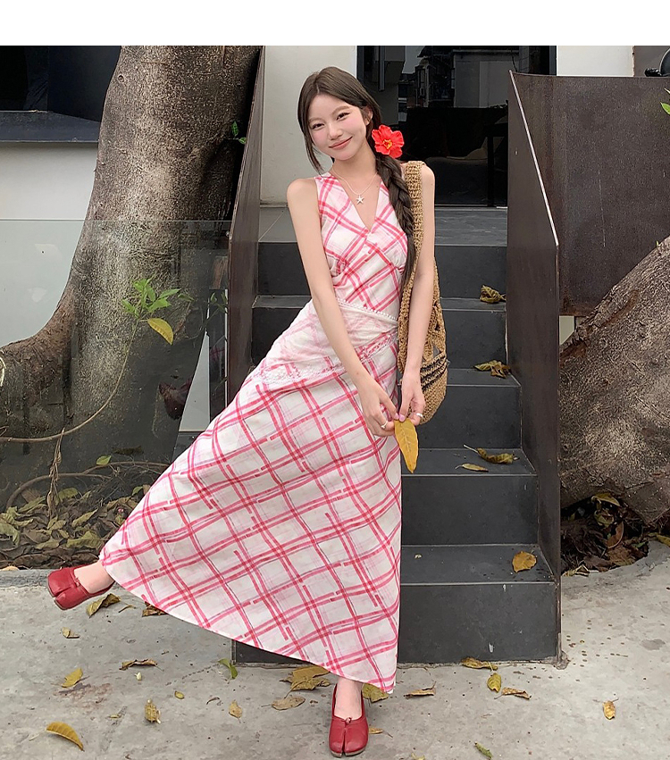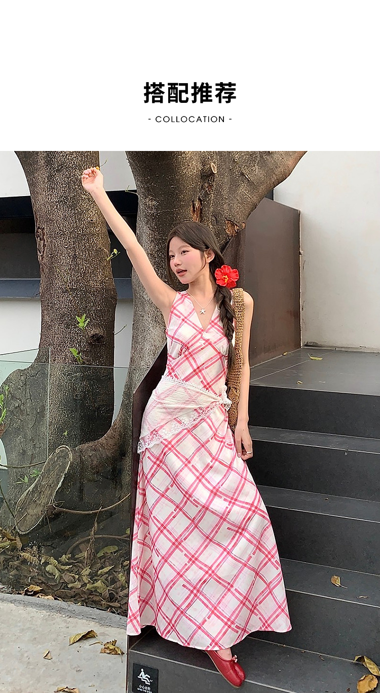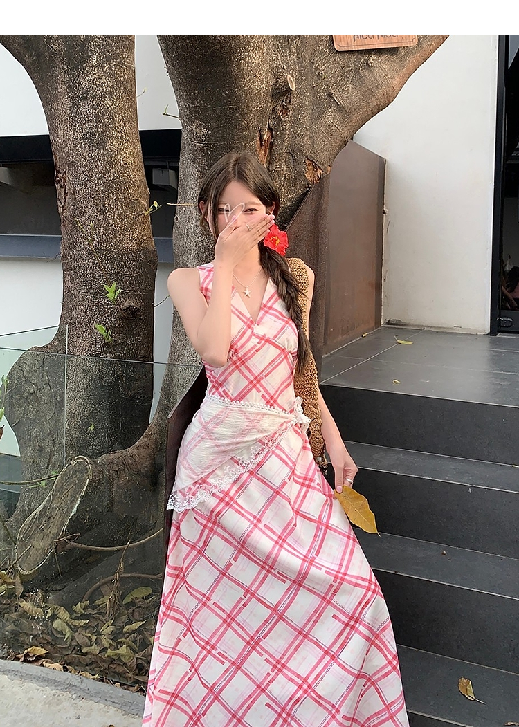 西遇格子吊带连衣裙女夏季新款粉色a字收腰v领法式长裙SS050543