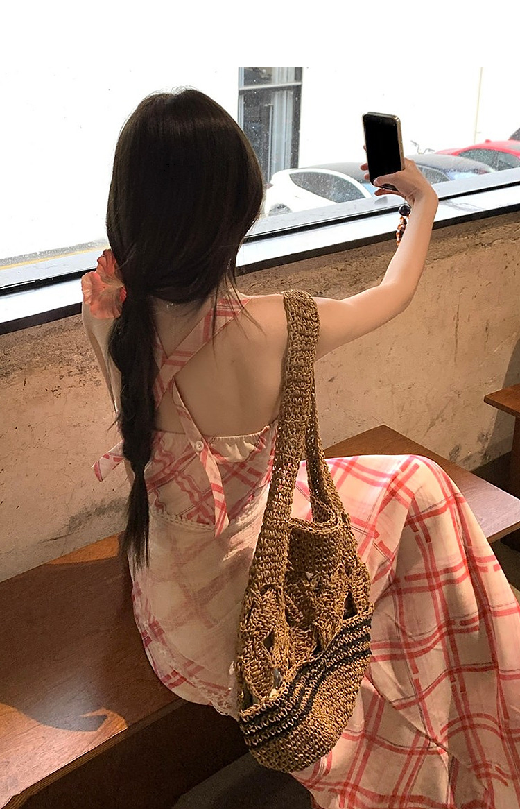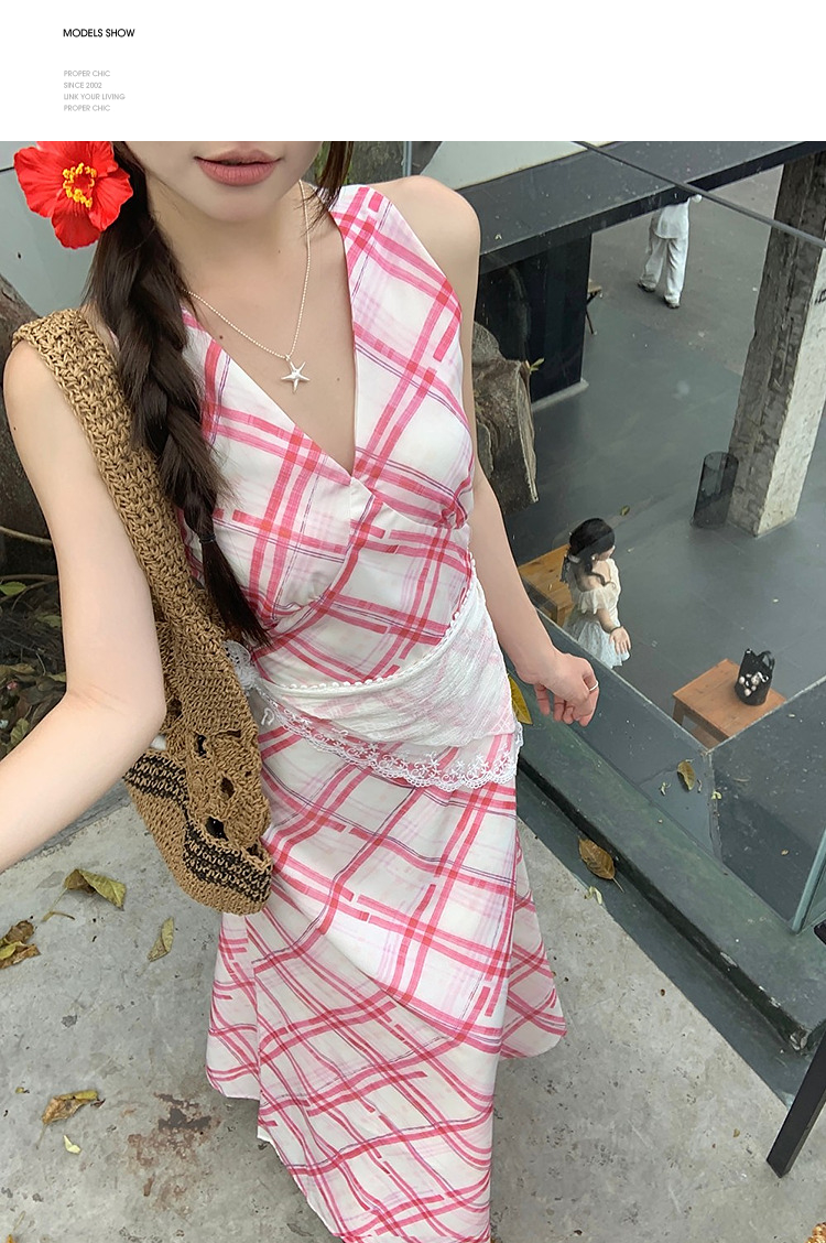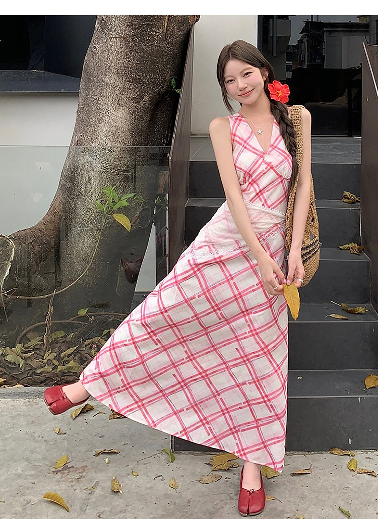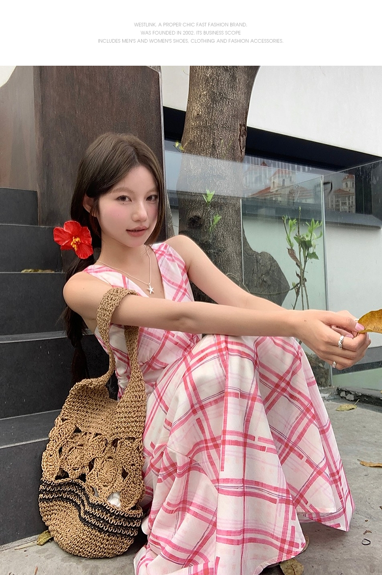 西遇格子吊带连衣裙女夏季新款粉色a字收腰v领法式长裙SS050543