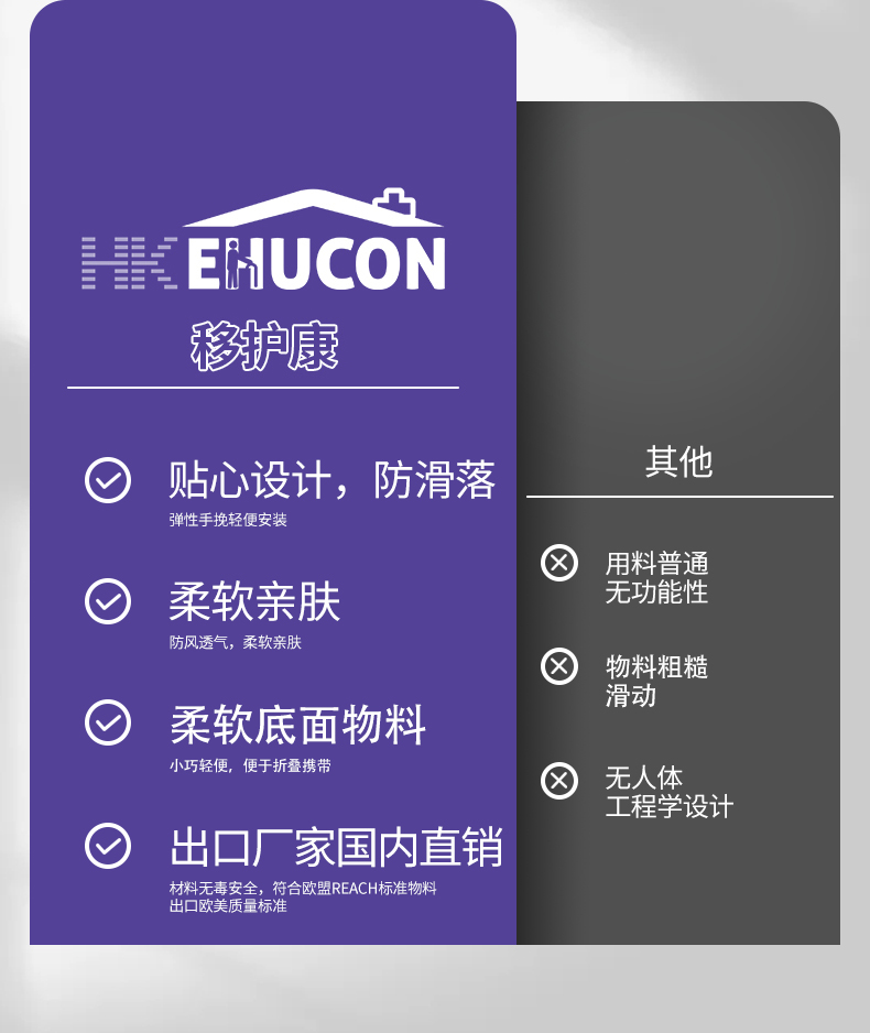 移护康养老用品生产厂家,旗下品牌:移互康专业销售老人转移及日常护理系列产品,包括移位机吊具,转移床垫,防褥疮脚套 ,防抓伤手套,扶抱腰带,长者餐具等产品 。