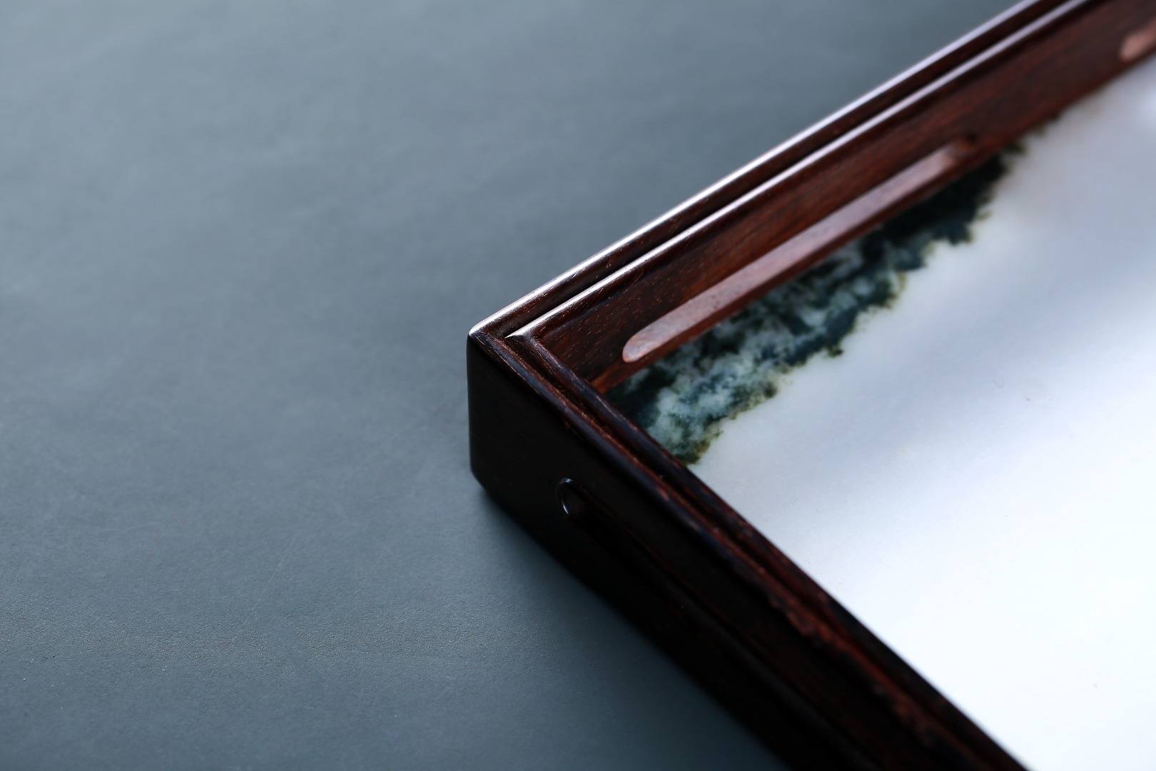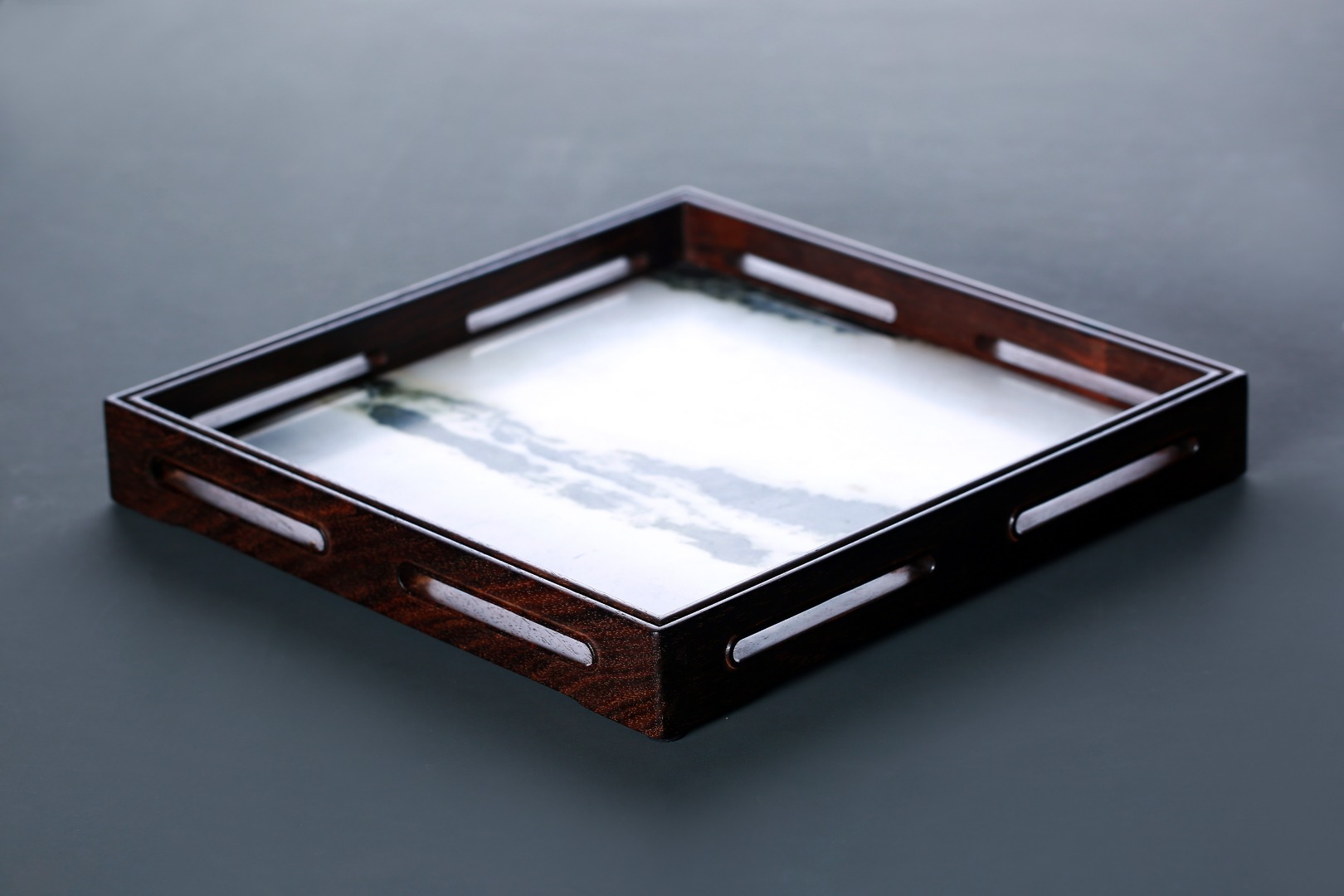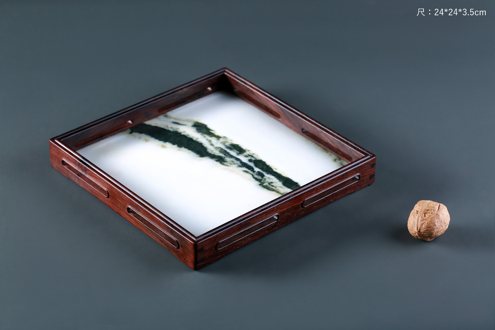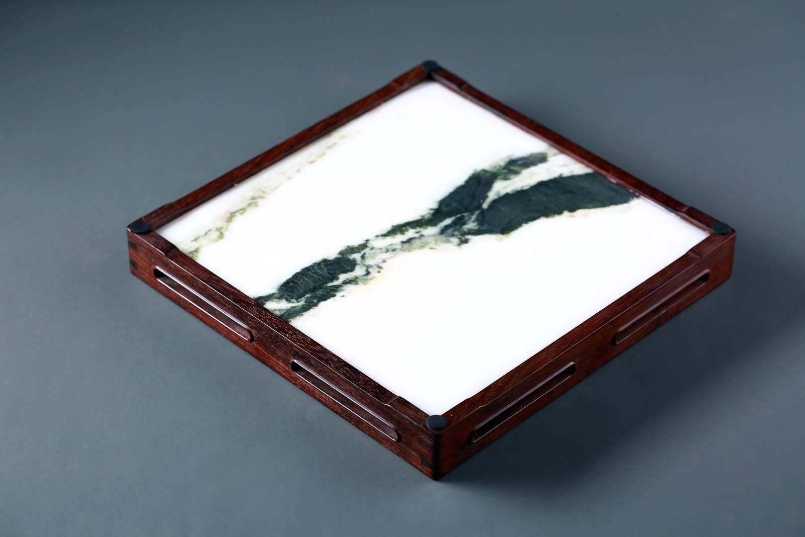 此盘以大红酸枝嵌云石制作,盘框格角,榫卯牢固,四围鱼门洞开光,灵巧而不失端庄,内外缘四周起线利落,挺拔精整。内嵌简约又充满意境的天然云石,似天之云,似海之浪,乾坤之景,跃然于前。