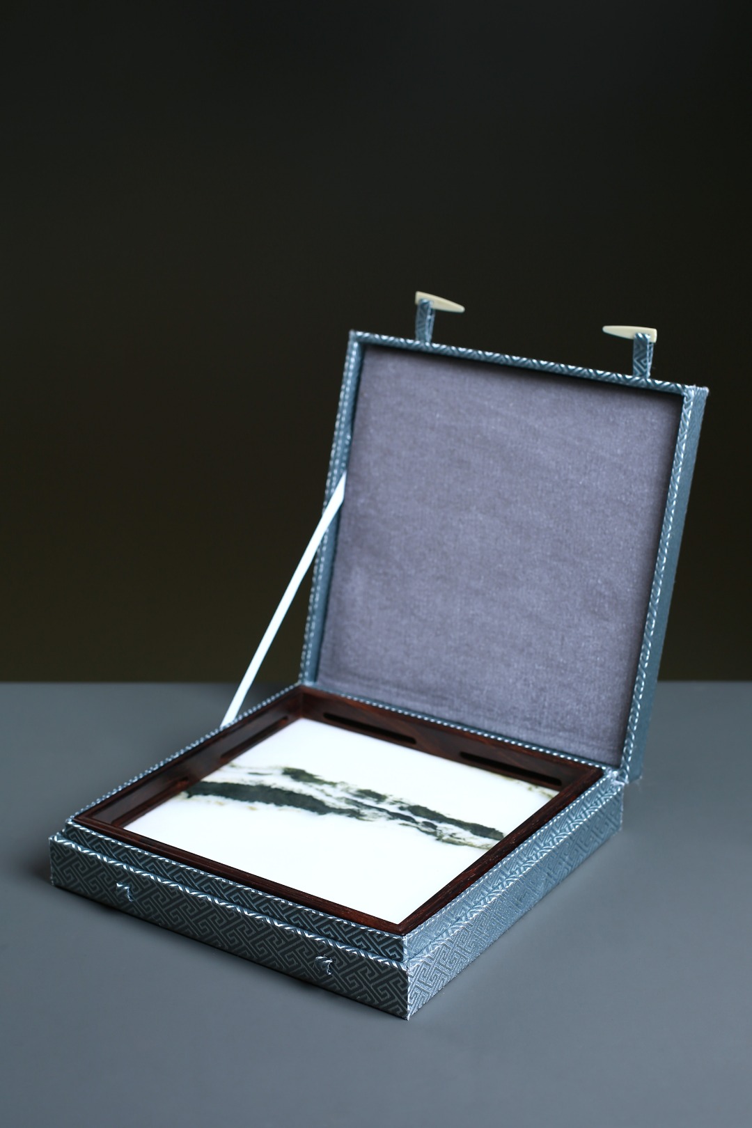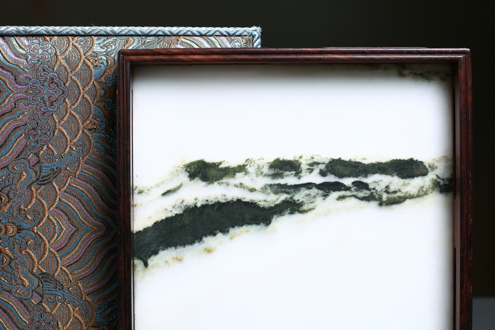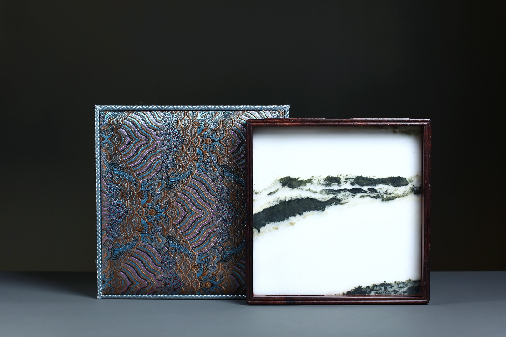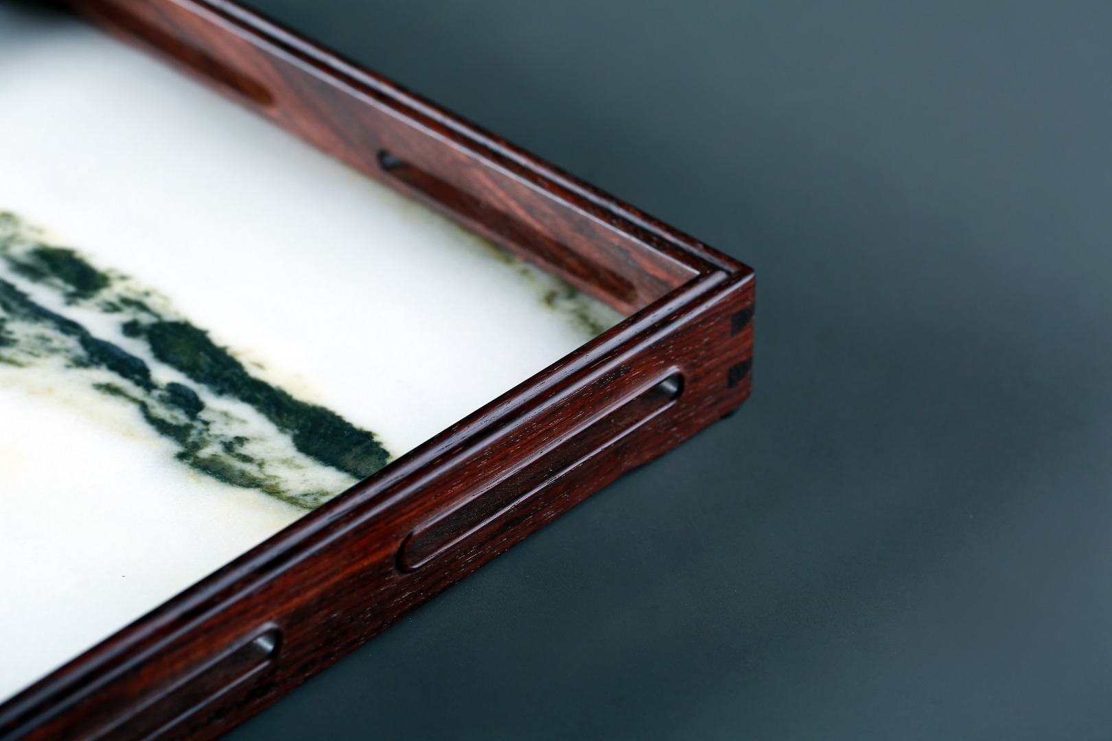 此盘以大红酸枝嵌云石制作,盘框格角,榫卯牢固,四围鱼门洞开光,灵巧而不失端庄,内外缘四周起线利落,挺拔精整。内嵌简约又充满意境的天然云石,似天之云,似海之浪,乾坤之景,跃然于前。
