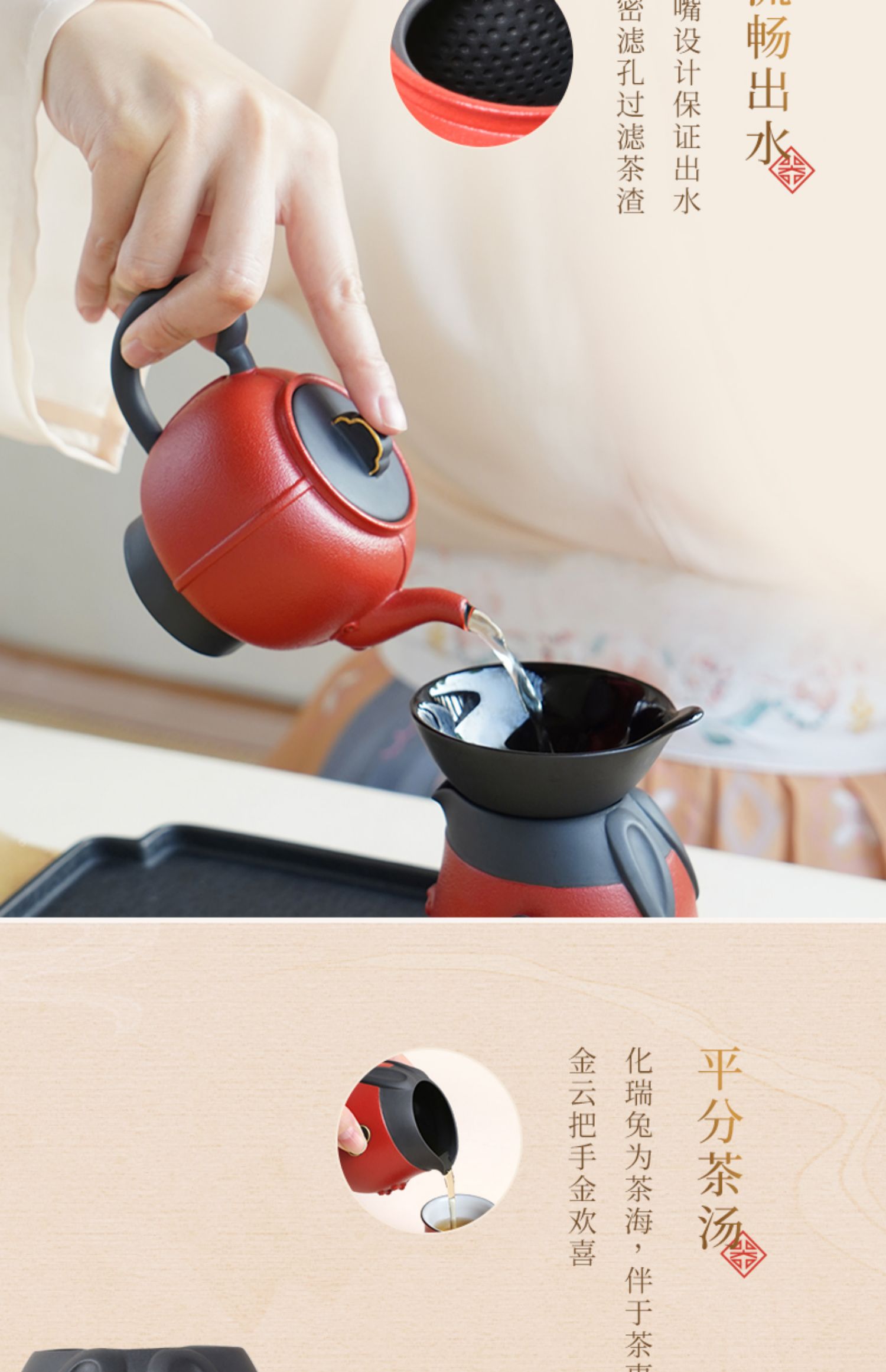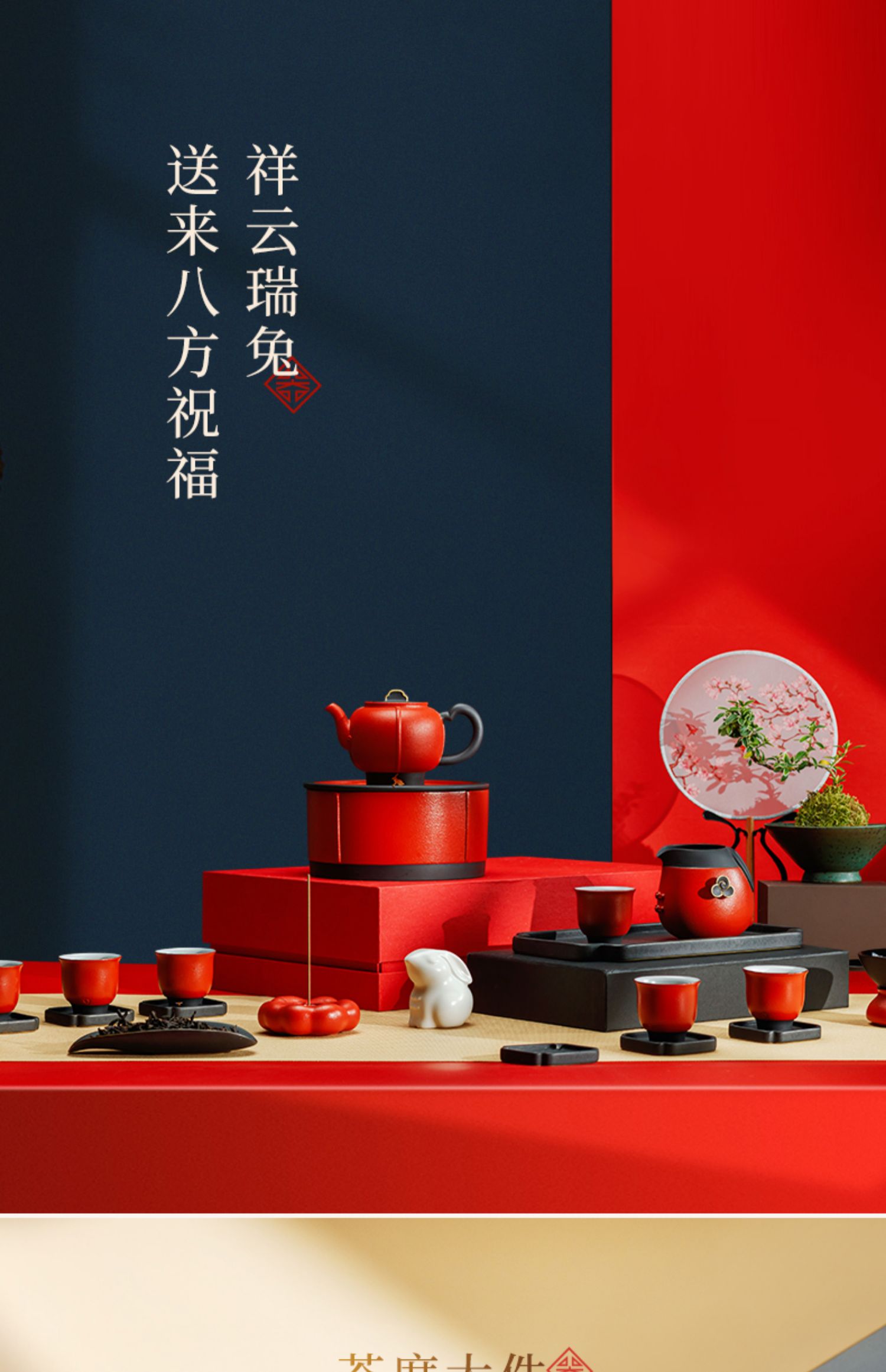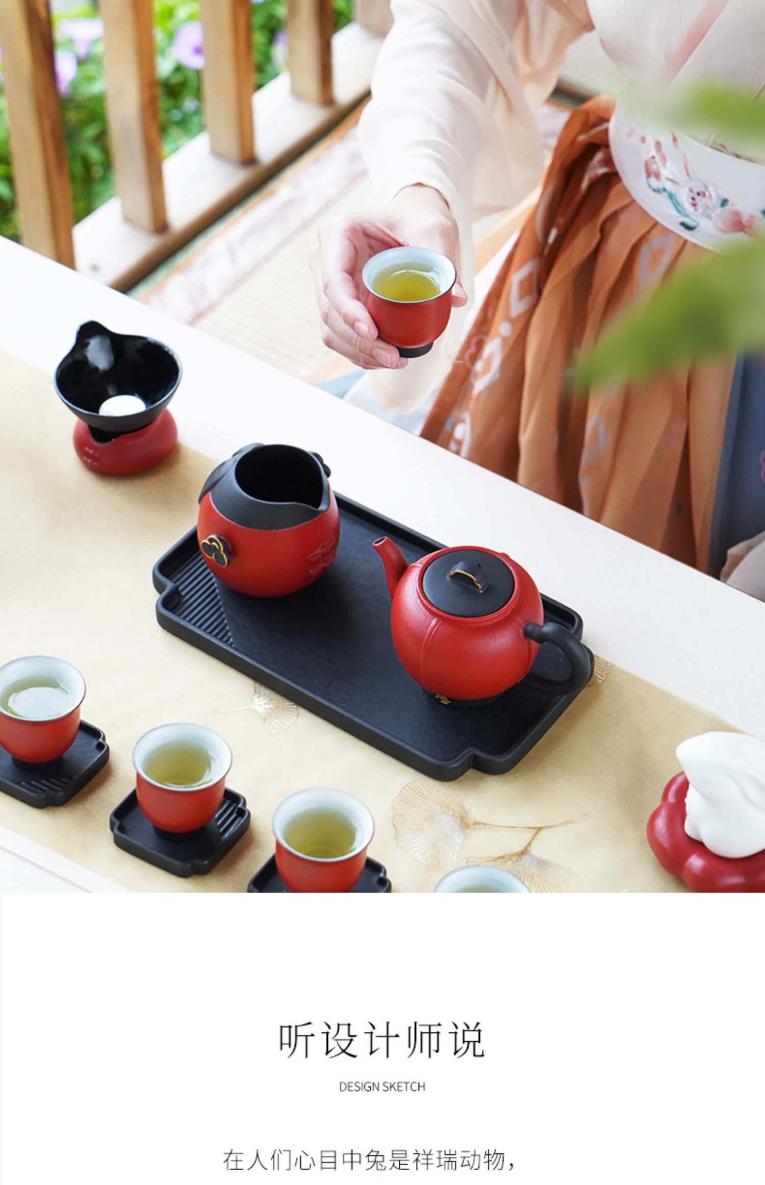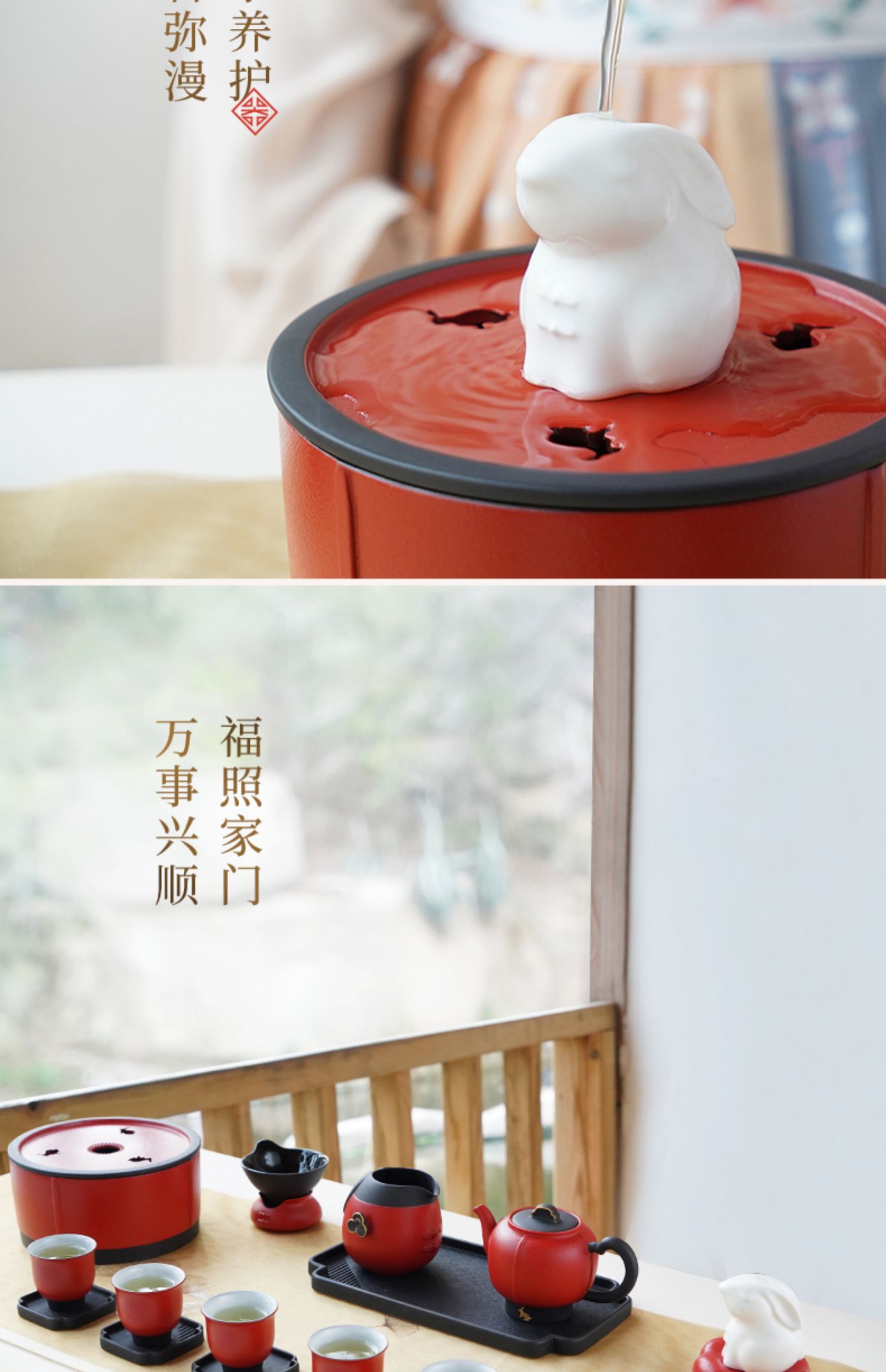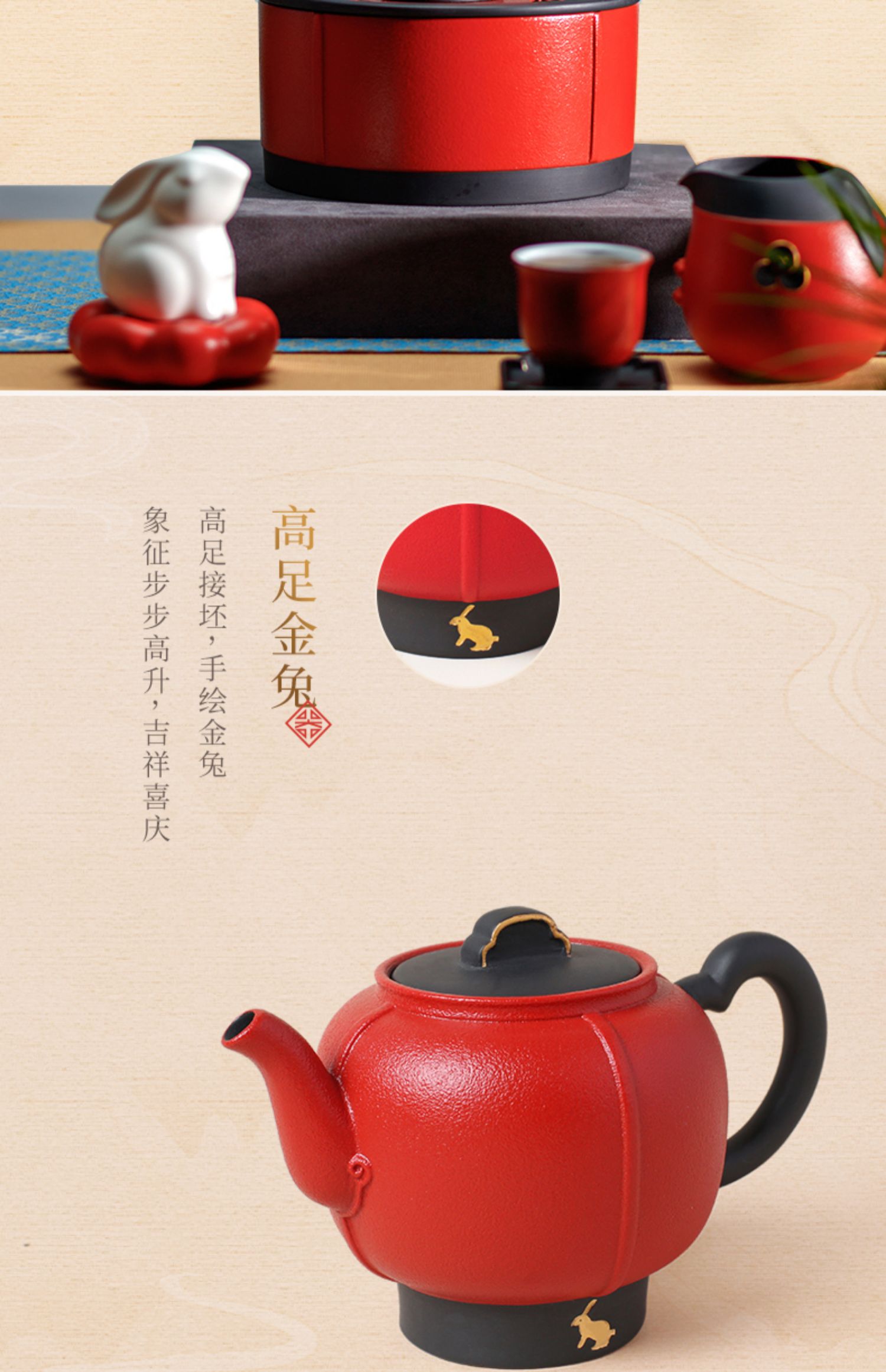 陆宝陶瓷功夫茶具 福照万家茶礼生肖兔描金陶瓷泡茶壶茶杯 家用客厅中国红高档整套茶具礼盒装