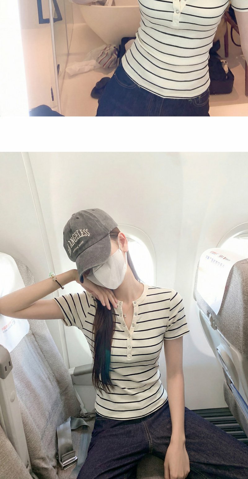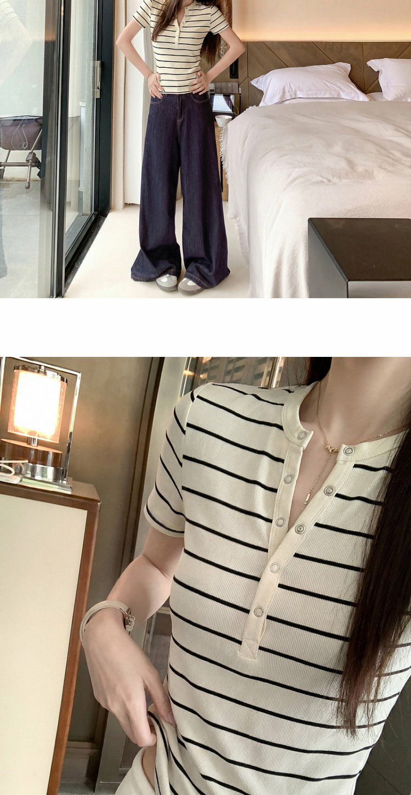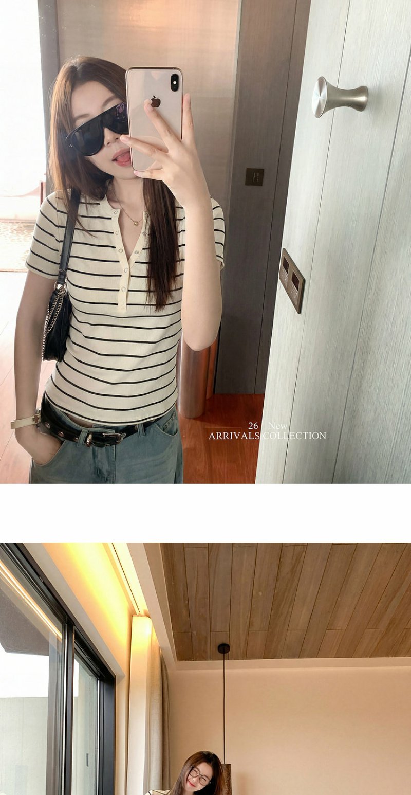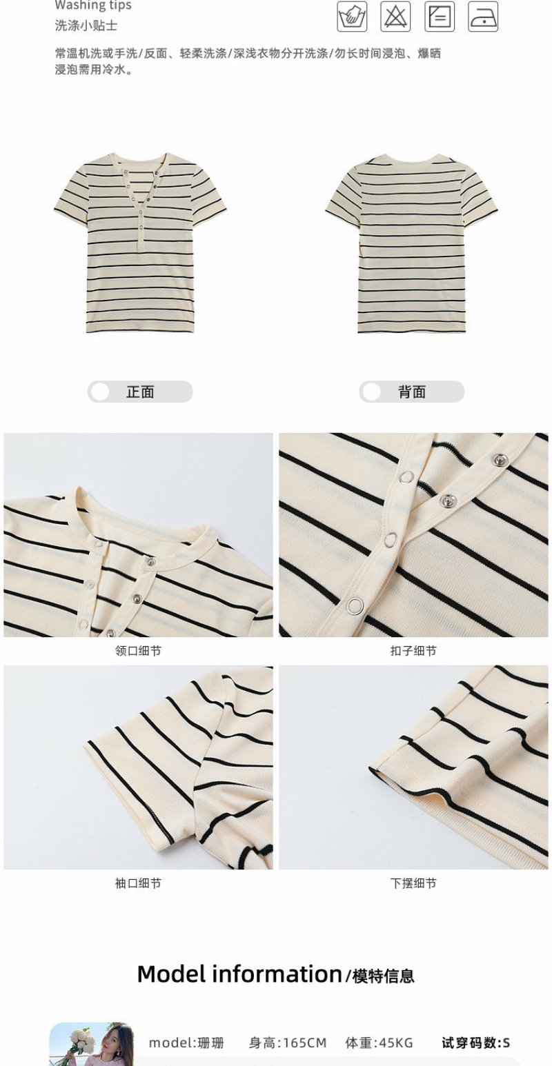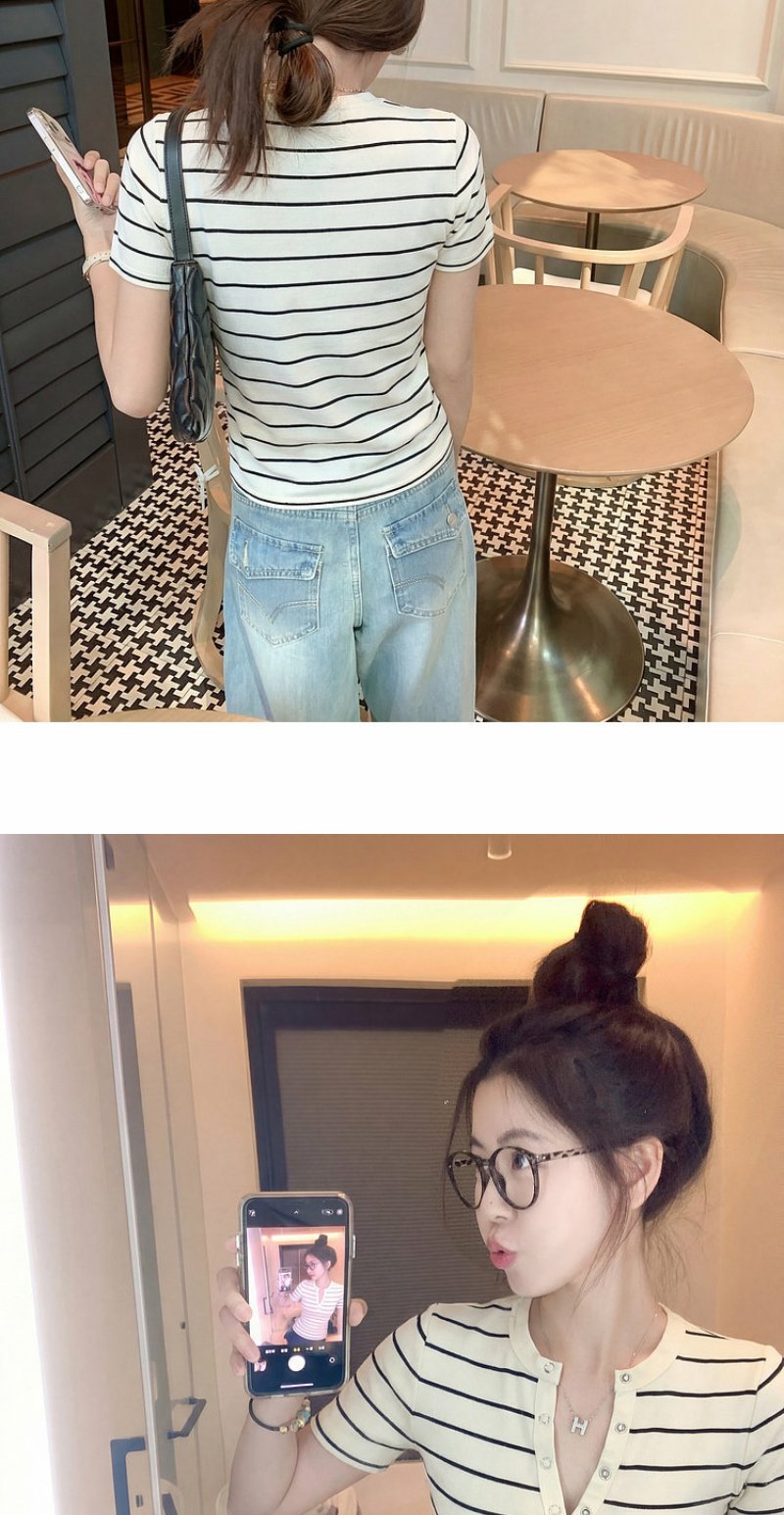 <曾小咸推荐>条纹纽扣修身短袖T恤上衣【预售款,预计3-15天!!】
