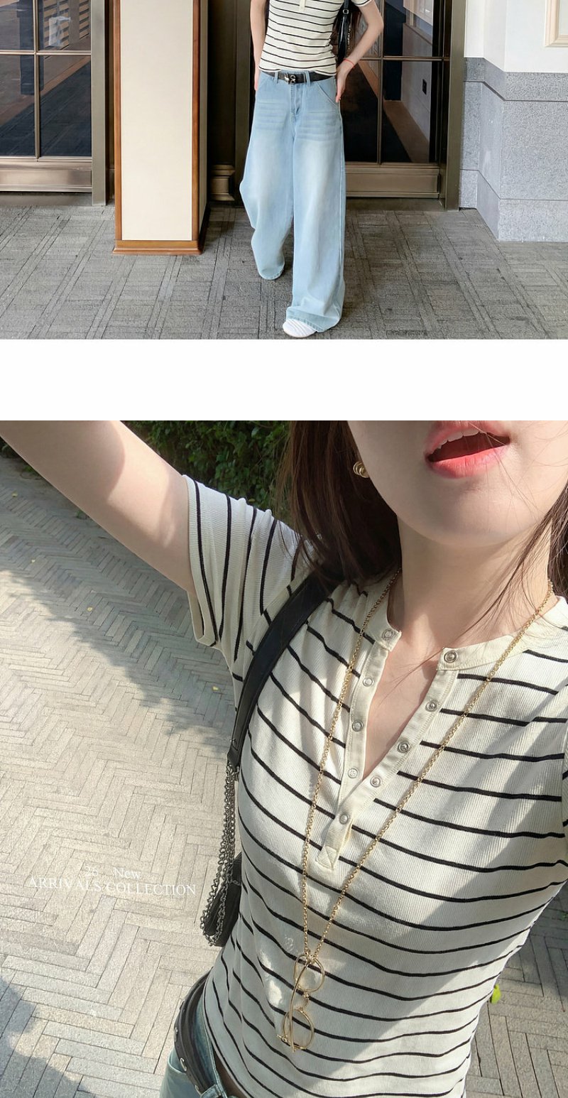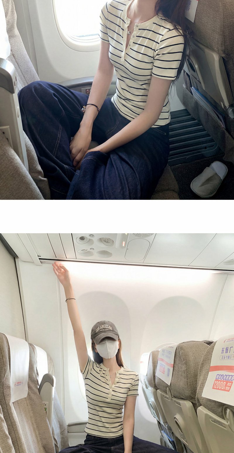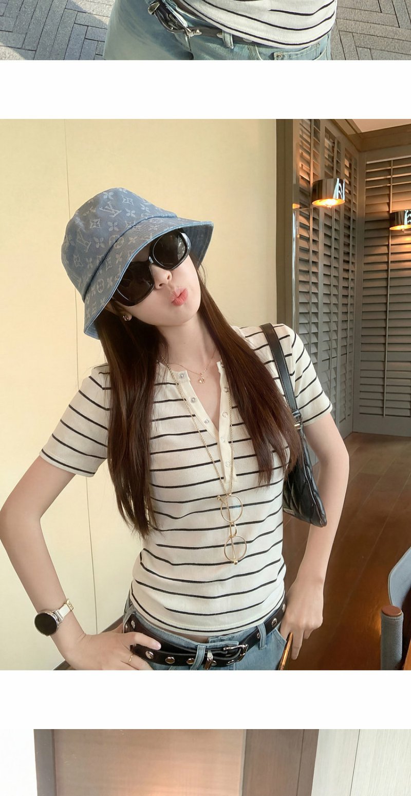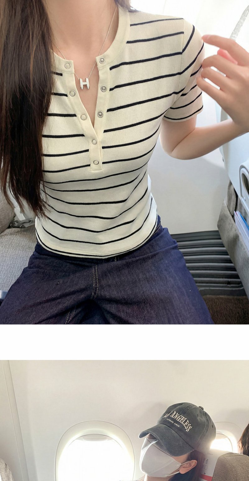<曾小咸推荐>条纹纽扣修身短袖T恤上衣【预售款,预计3-15天!!】