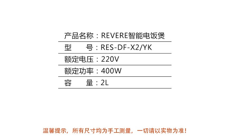 【小家电】REVERE家用2L智能电饭煲2LRES-DF-X2/YK HF
