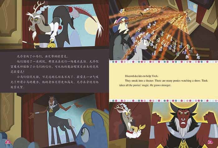 (3)原汁原味双语故事,大量配图内容丰富,加深阅读体验:《小马宝莉大冒险双语故事》内容非常丰富,用大篇幅讲述故事,使用大量原版动画片配图,力求呈现每一个重要细节,贴近原片,加深孩子对故事的感受。