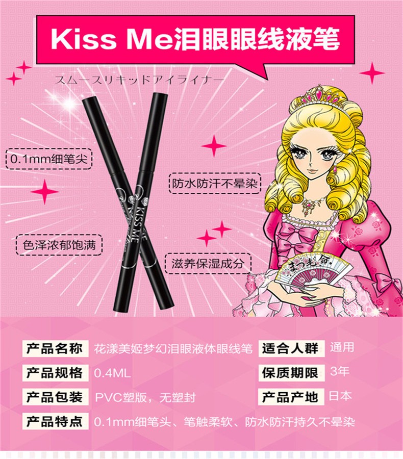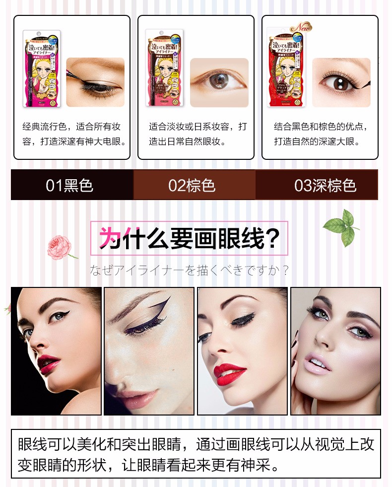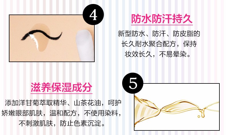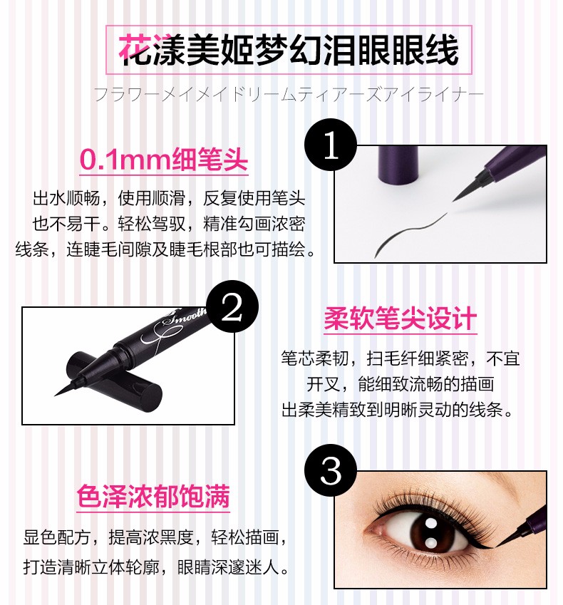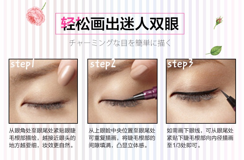 0.1毫米的巨细笔尖设计,线条流畅易上色,内眼线也能轻易掌控,防水防晕染,有效对抗夏季流汗,再也不怕脱妆啦~