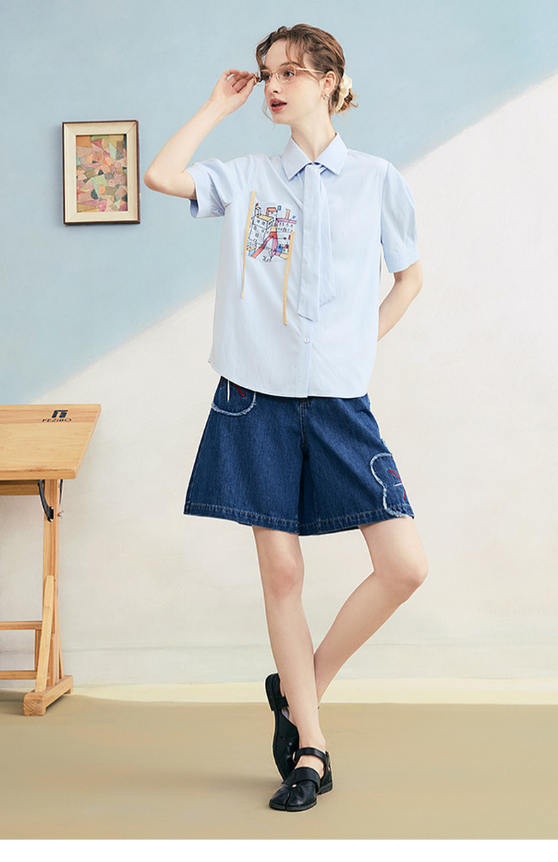 两三事2024夏季新款甜美蕾丝印花拼接假两件t恤女宽松