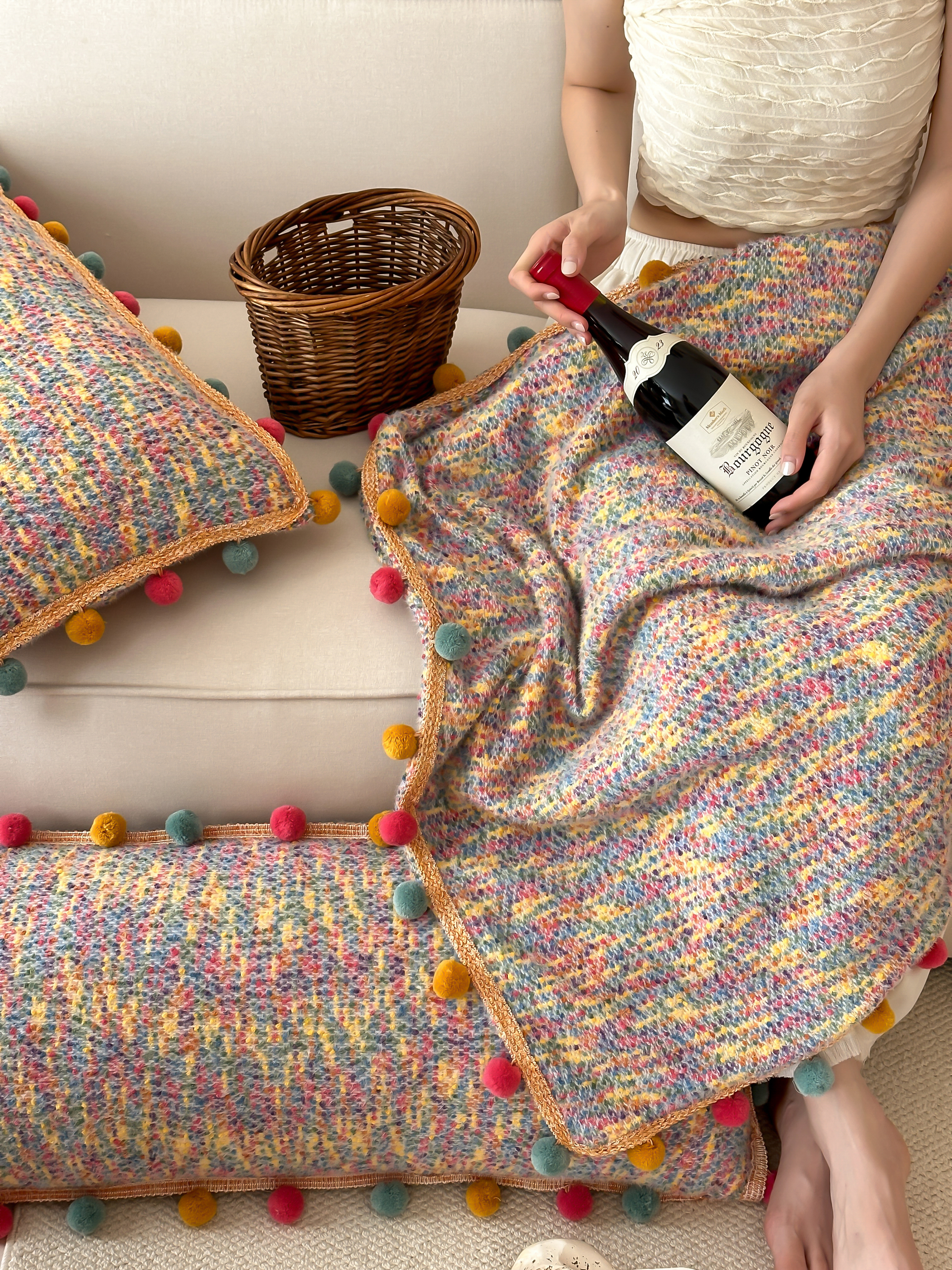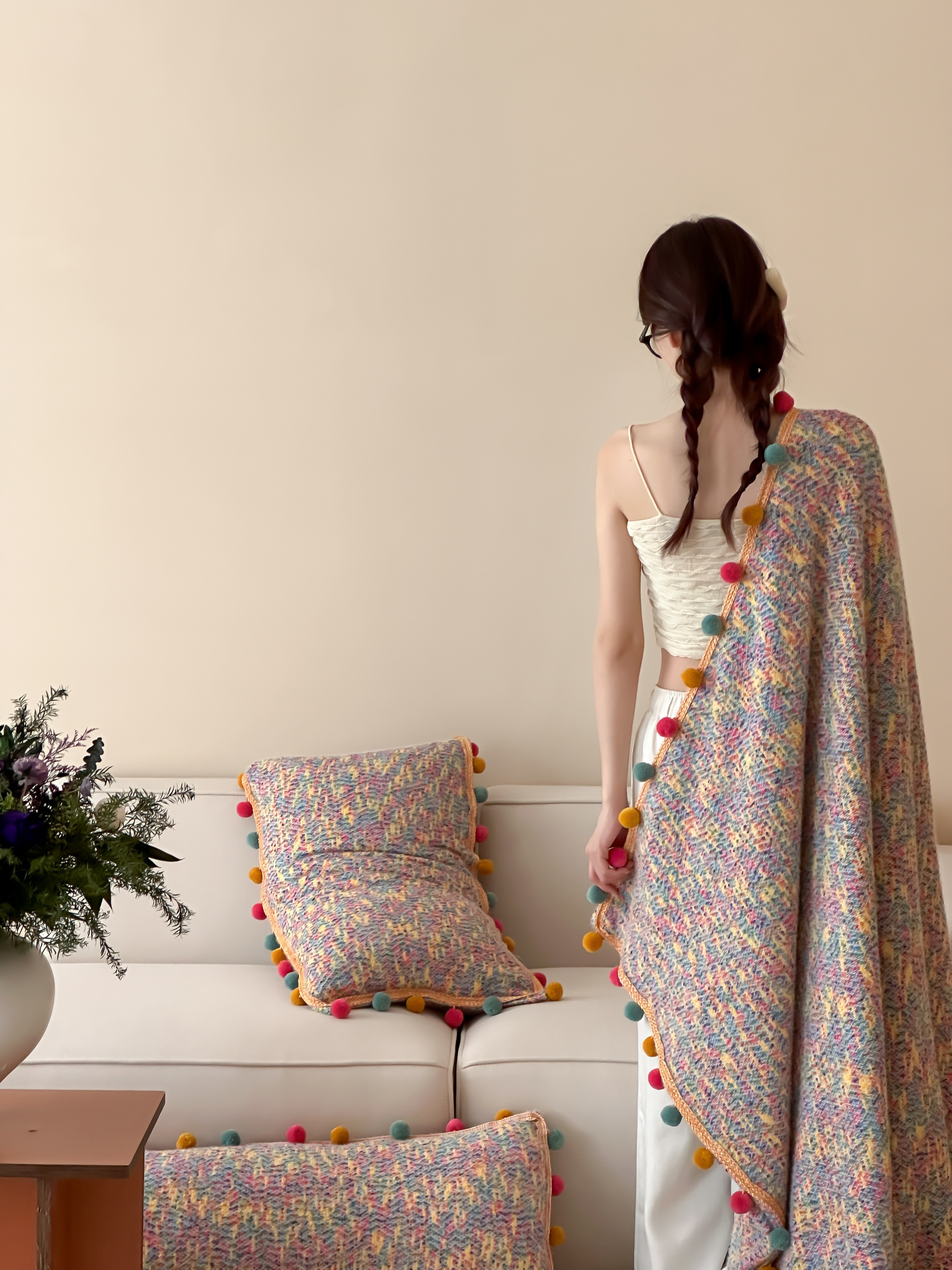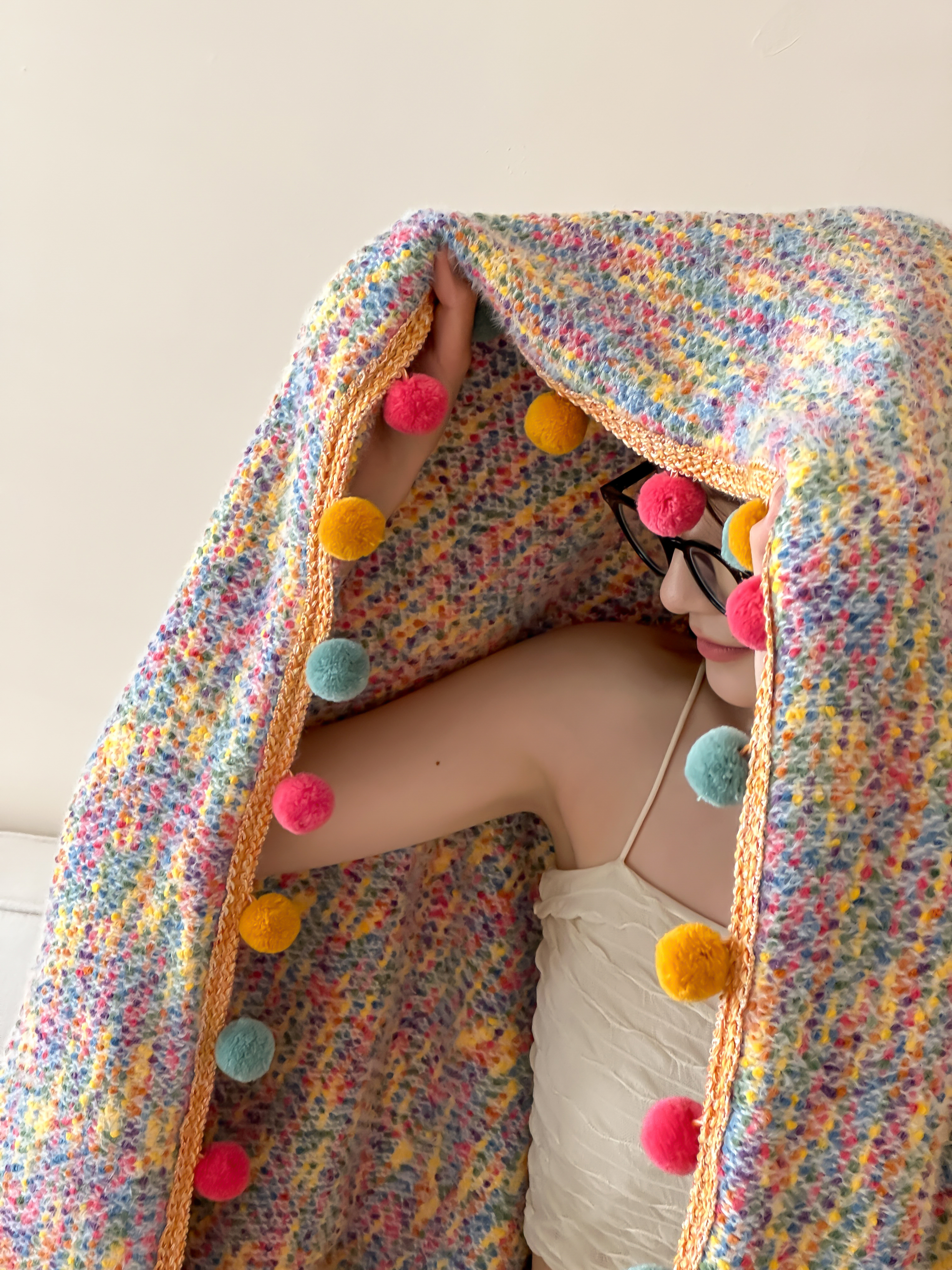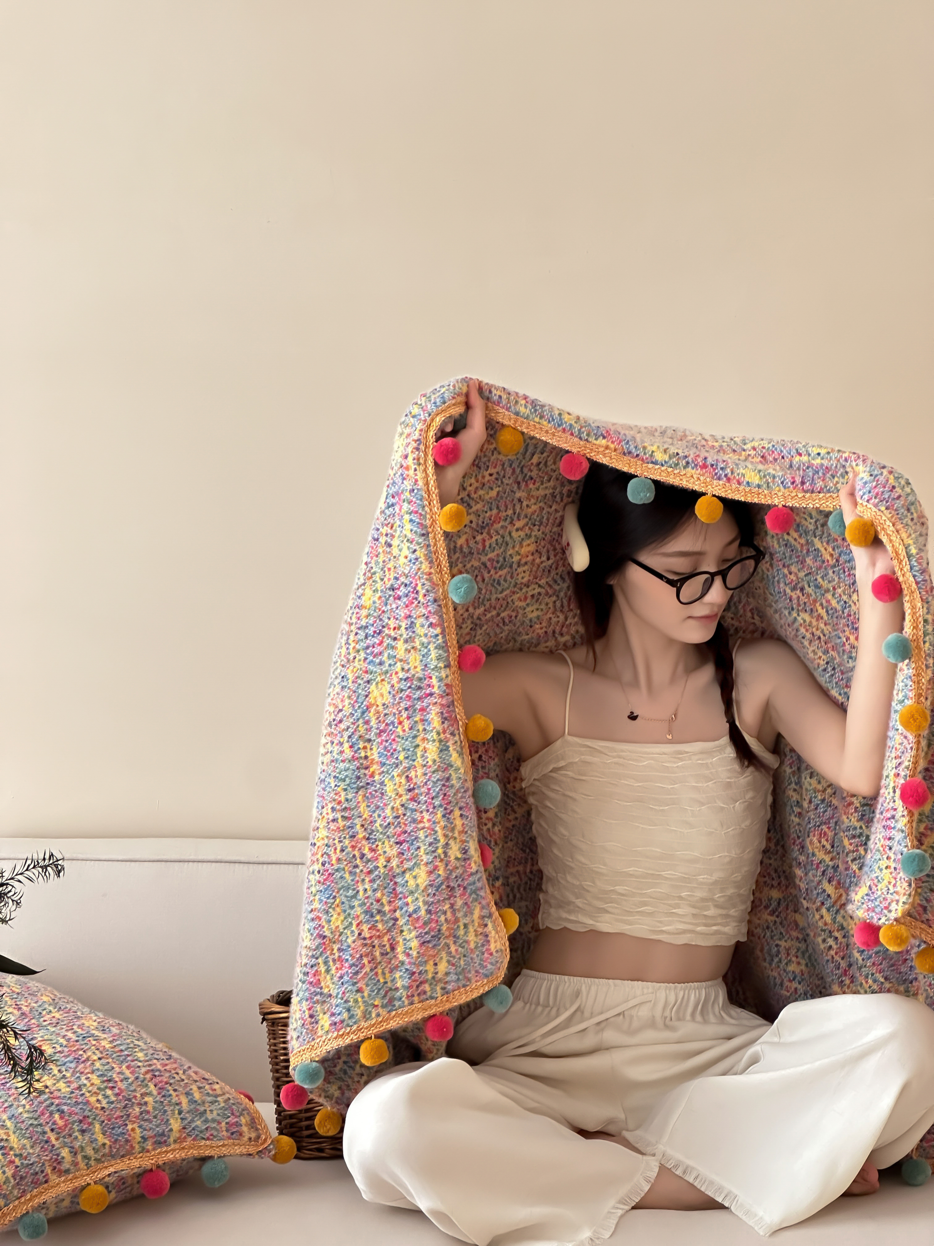 纱线表面散落的彩色小点,像星辰、似糖果,编织时随机渐变,立体纹路,清晰肌理,细节感满分,自带“手作”滤镜。活泼不浮夸,时尚不撞款,用来点缀家居氛围瞬间增色!