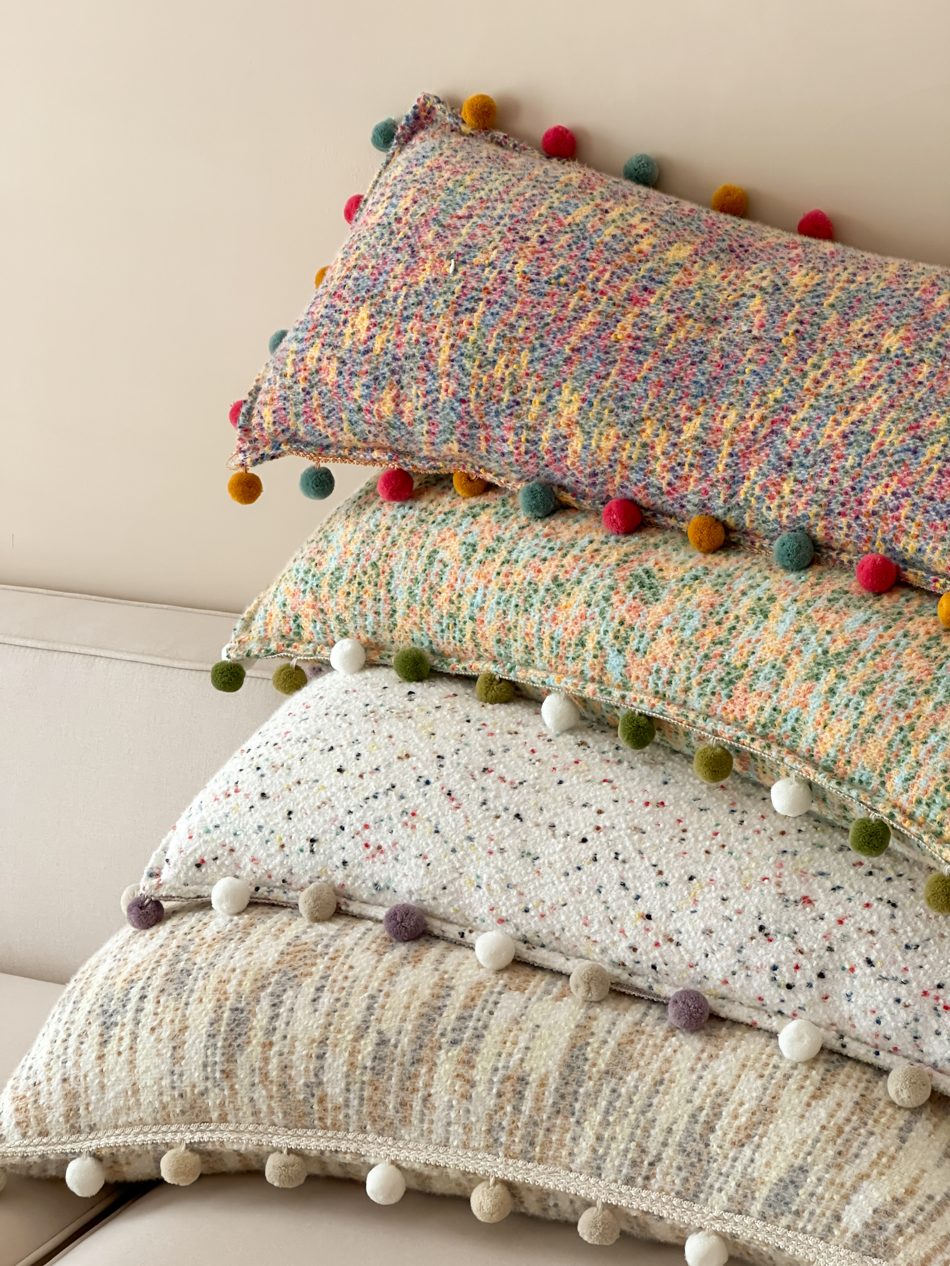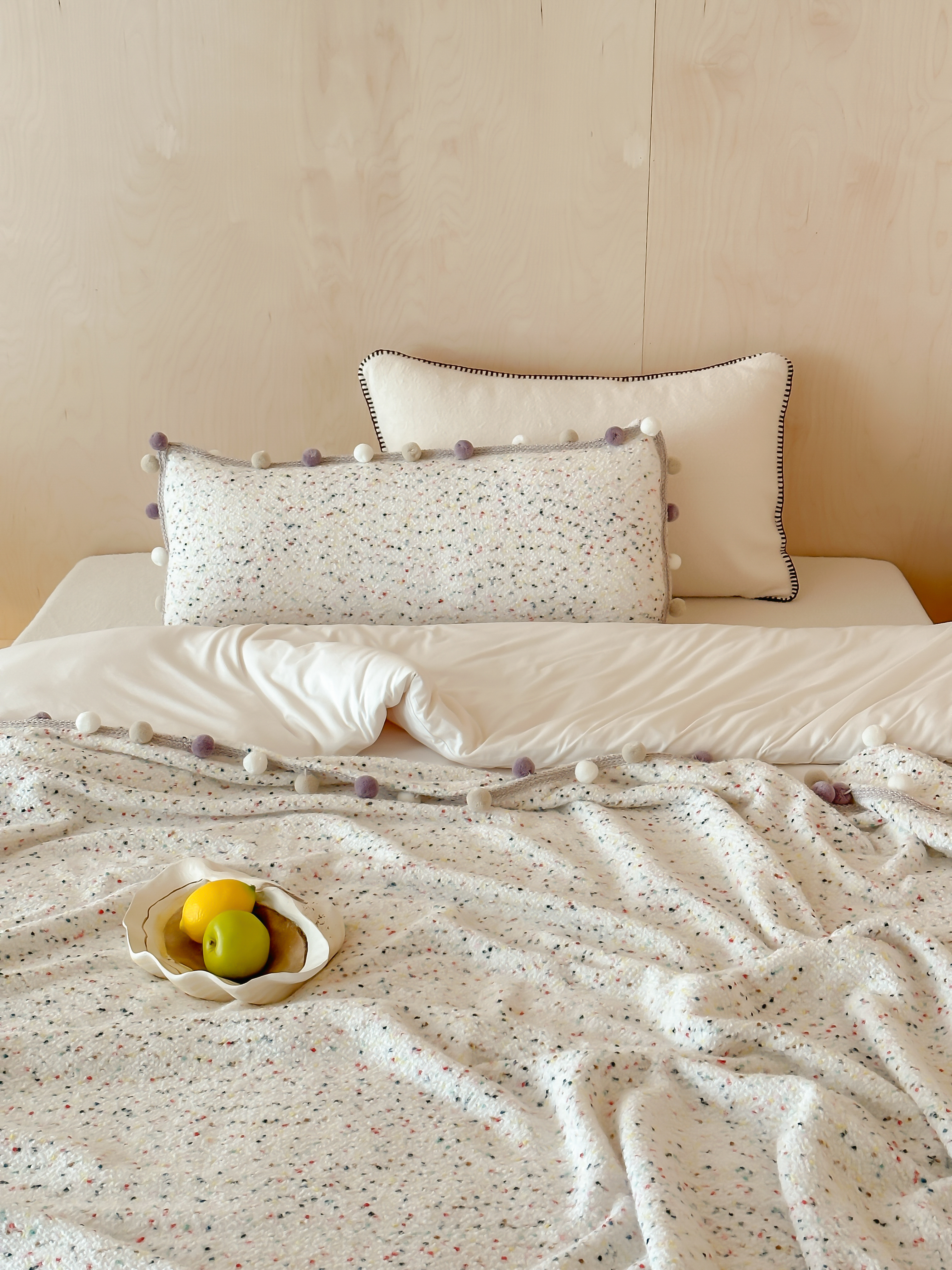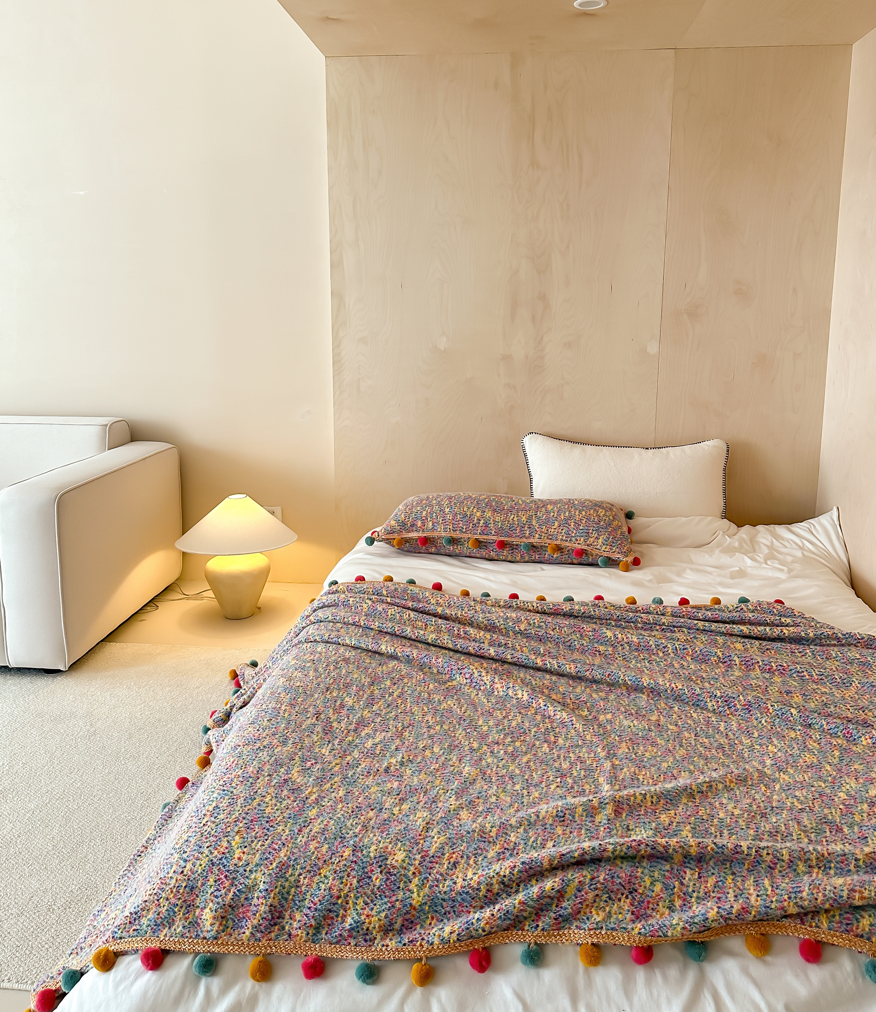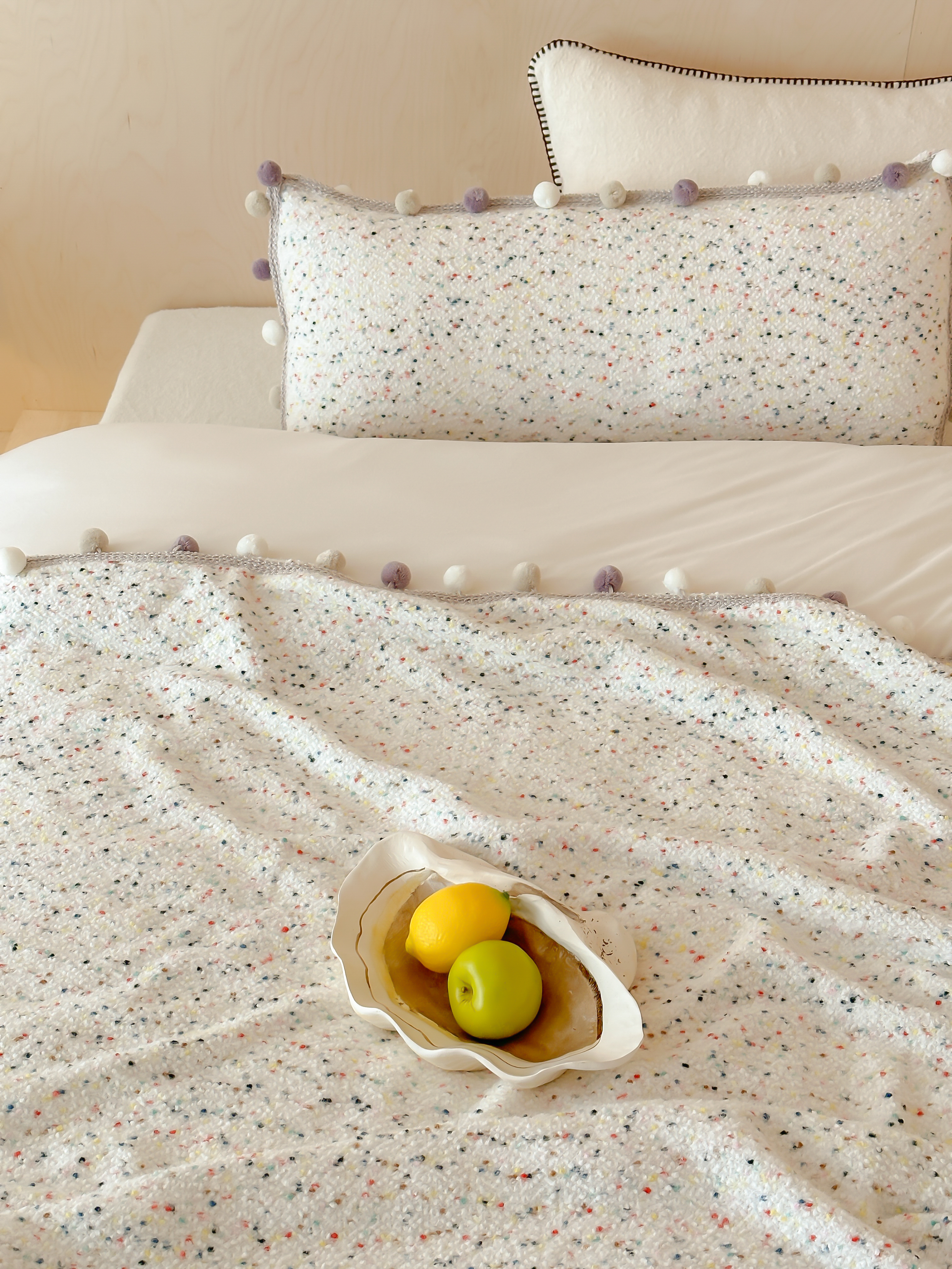 纱线表面散落的彩色小点,像星辰、似糖果,编织时随机渐变,立体纹路,清晰肌理,细节感满分,自带“手作”滤镜。活泼不浮夸,时尚不撞款,用来点缀家居氛围瞬间增色!